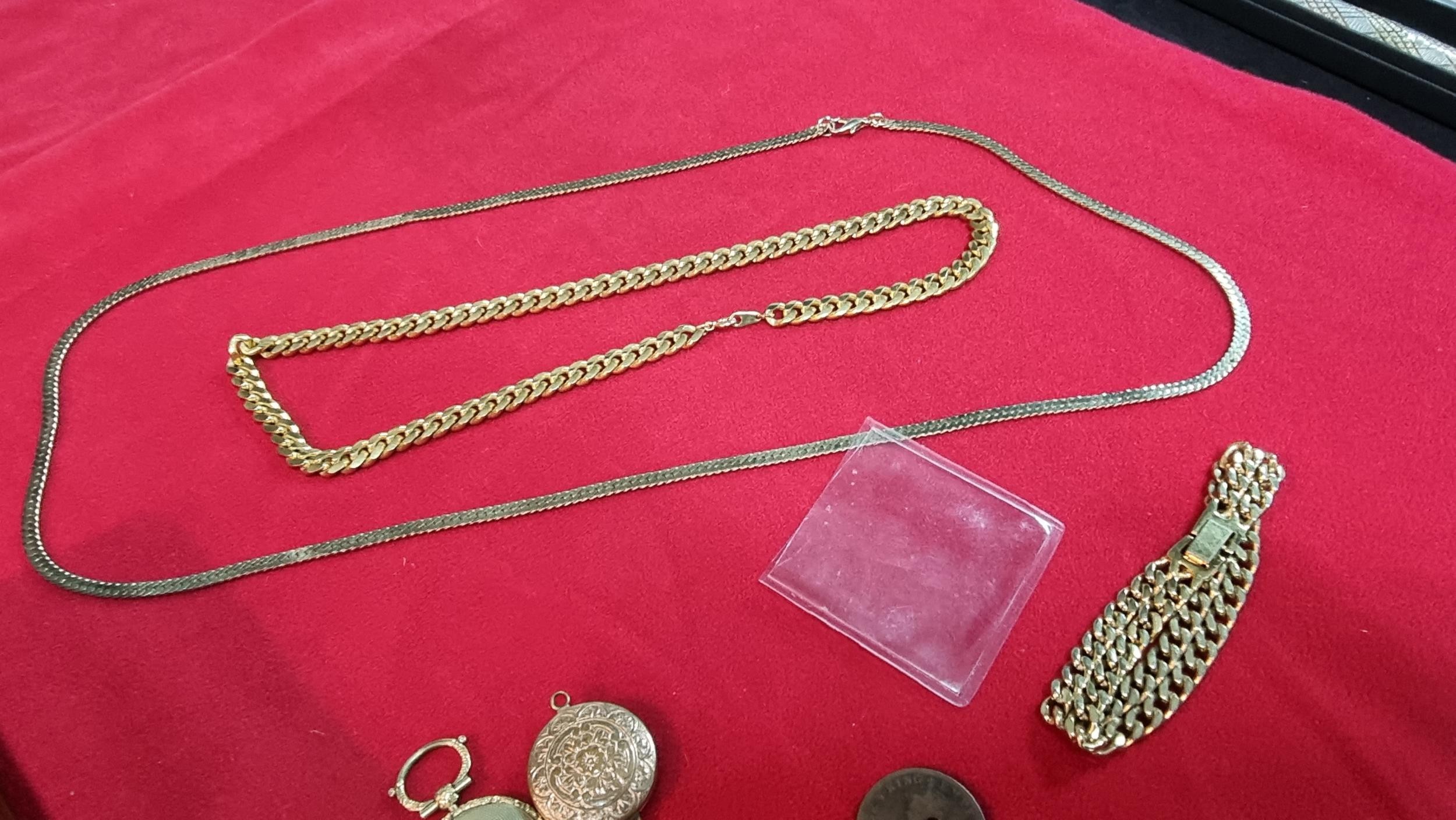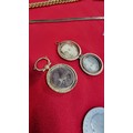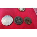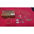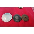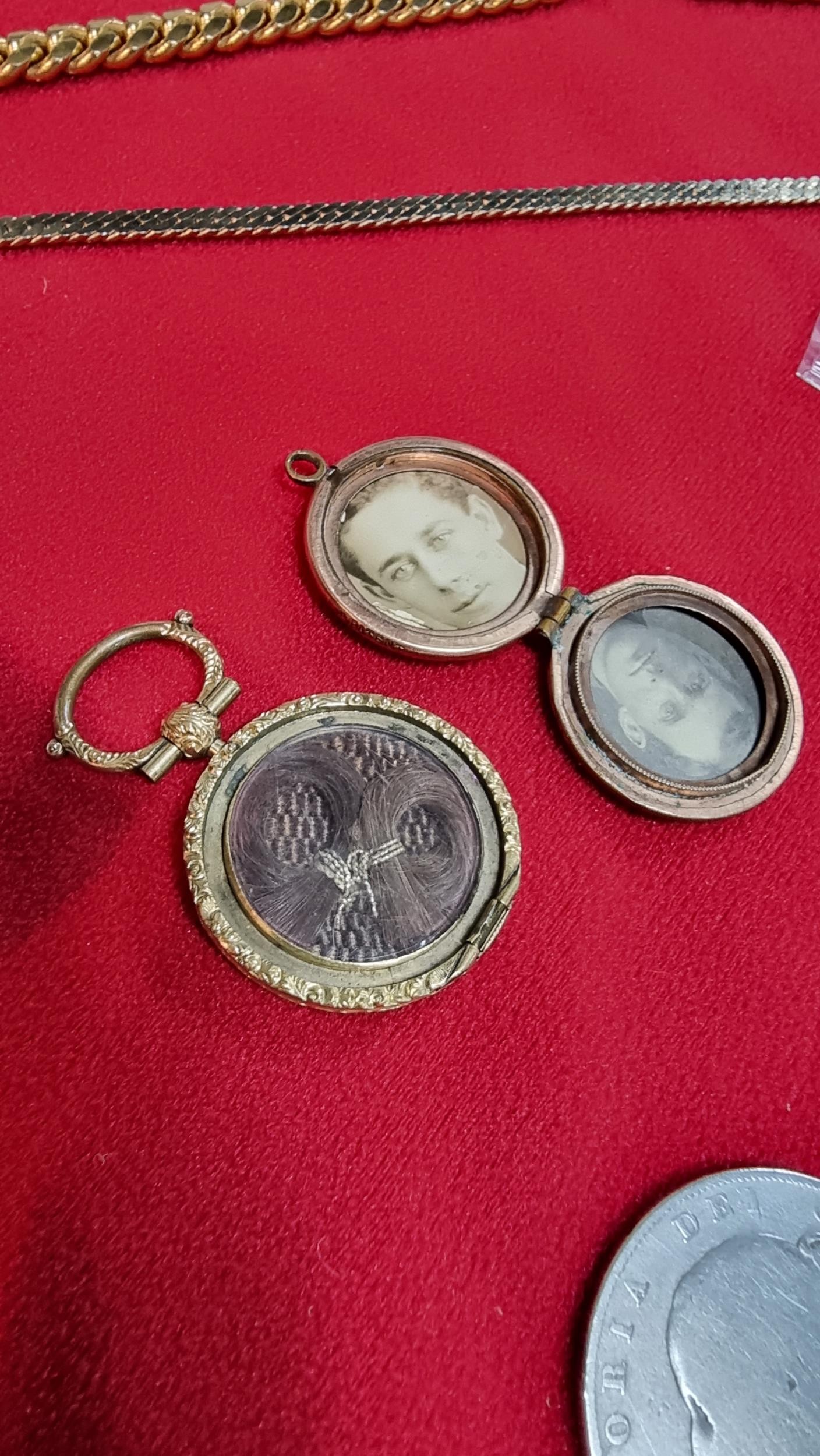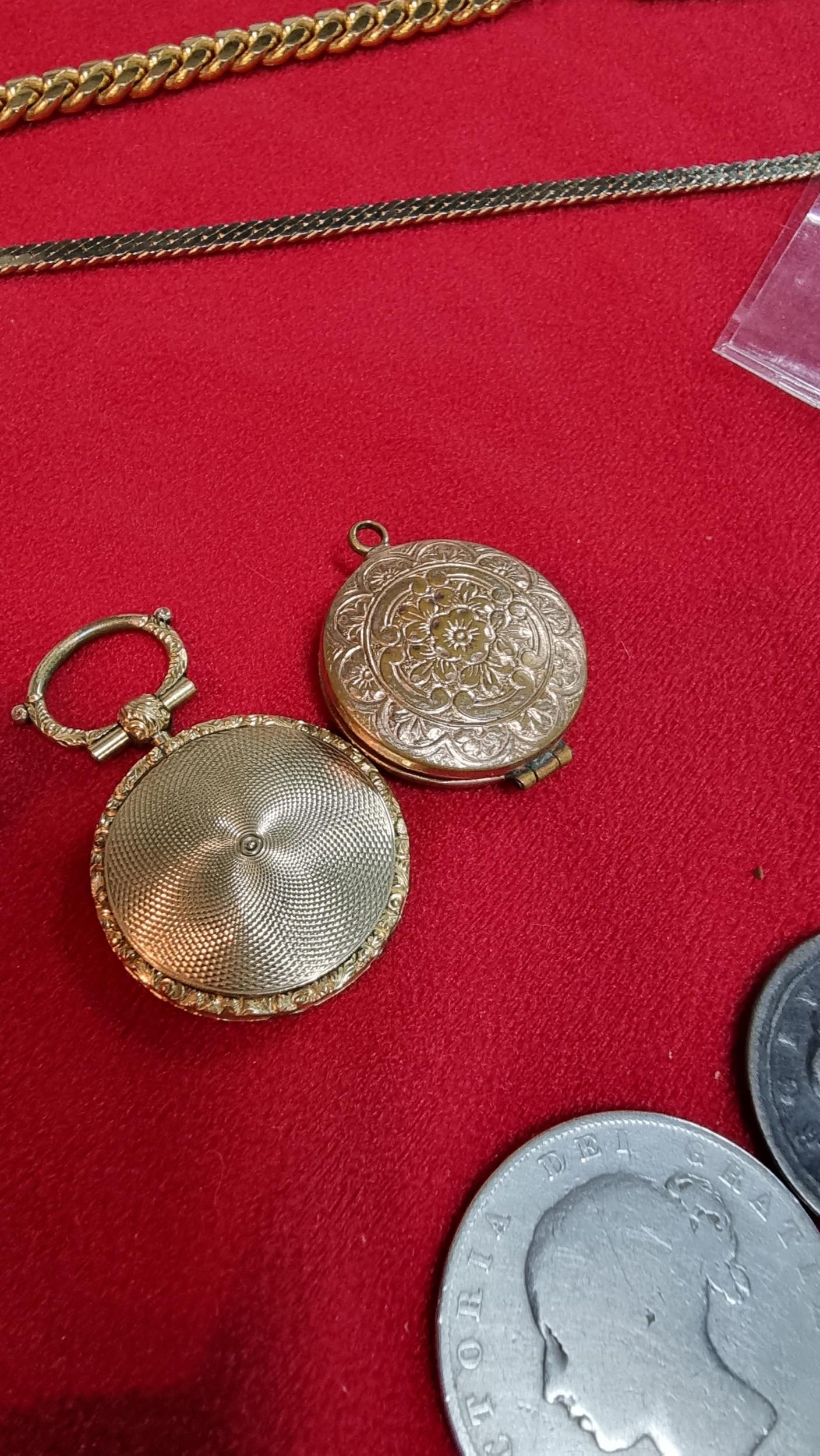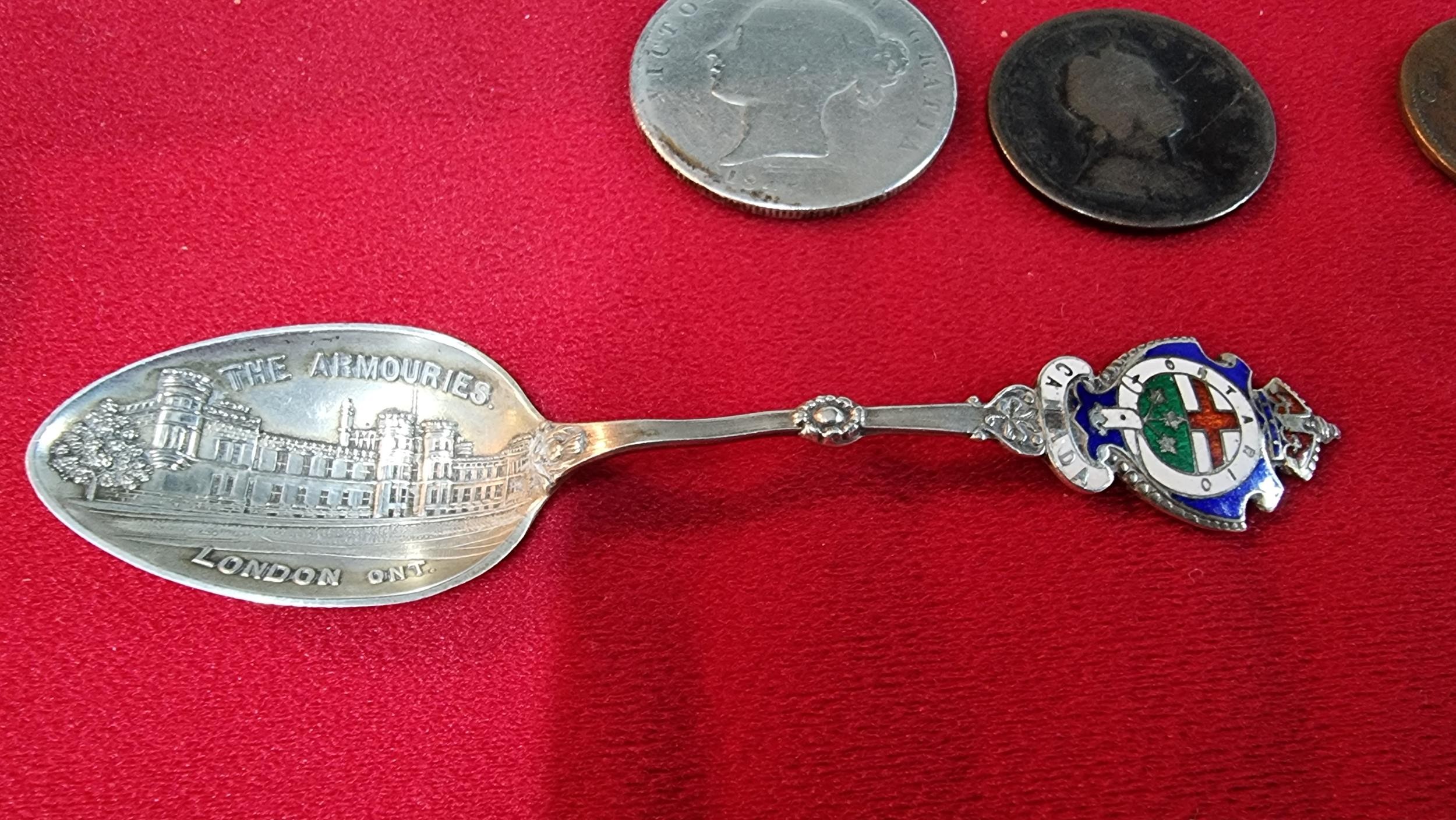Small box of collectables inc a Sterling silver spoon, antique coins inc 1721 penny, 1845 silver Coin, Mourning lockets etc