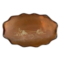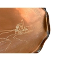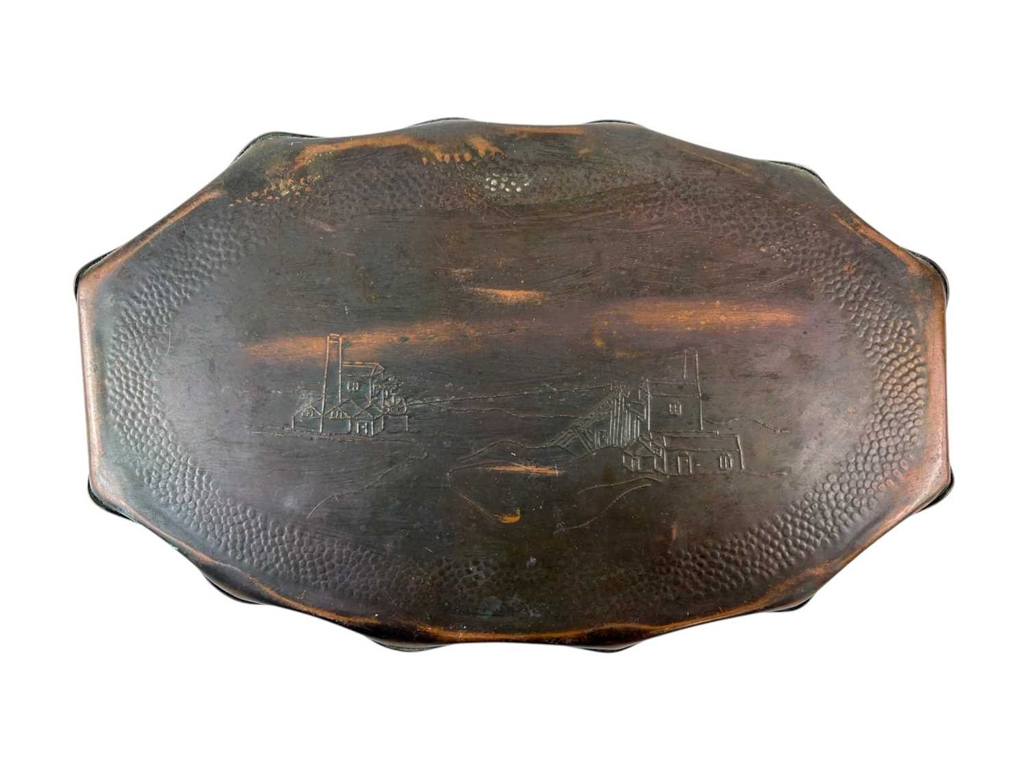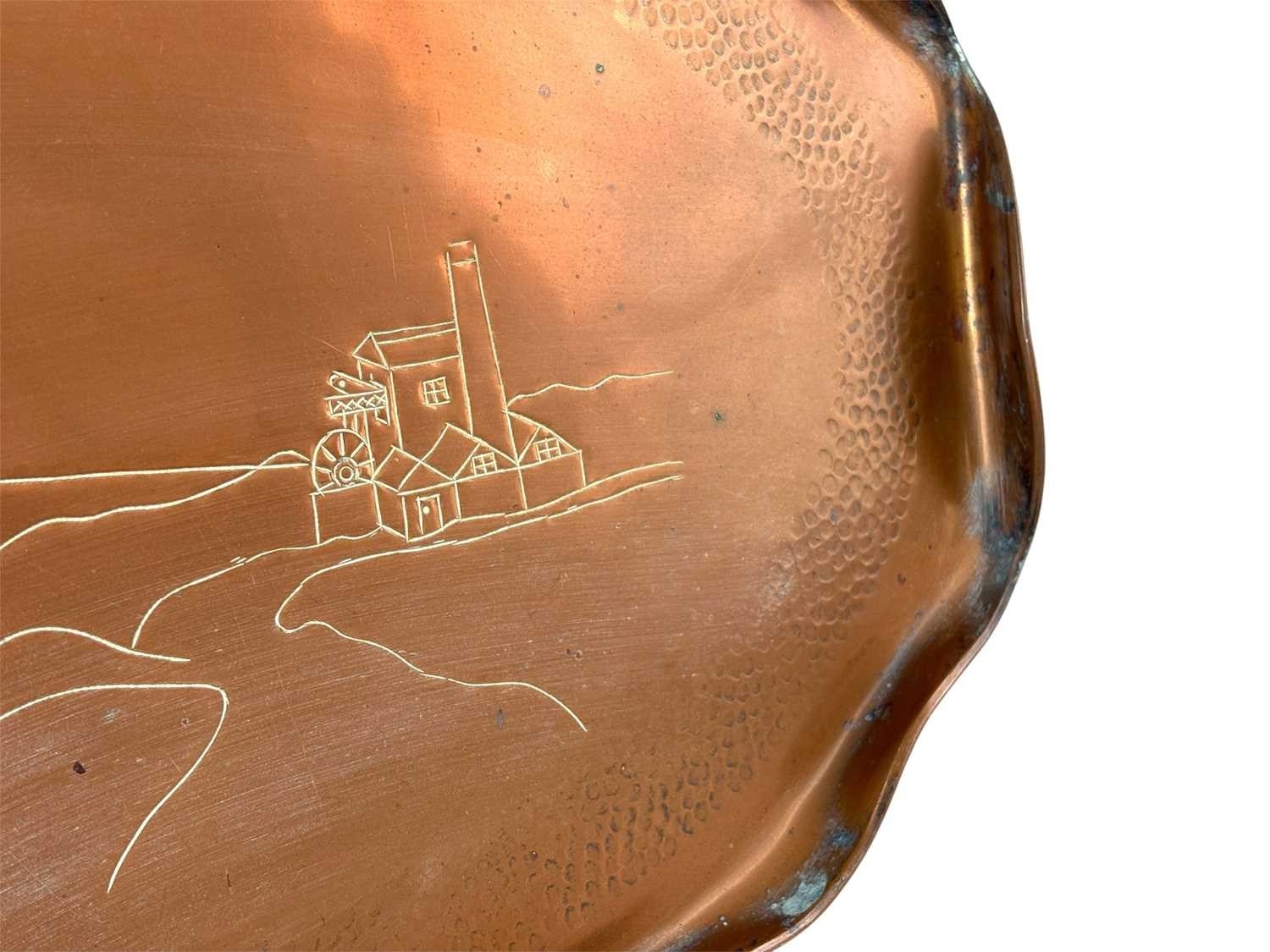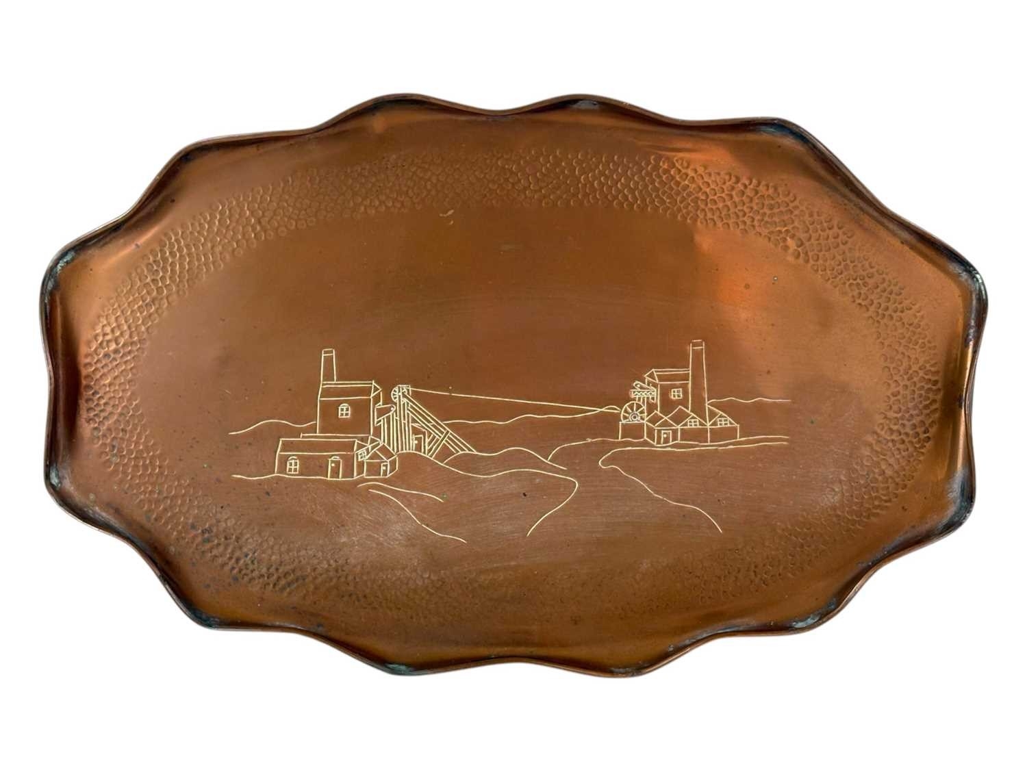 A Charles Eustace, Hayle Arts and Crafts copper tray. Engraved with a tin mine and engine houses, unsigned, width 49cm.