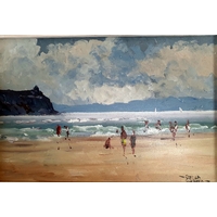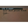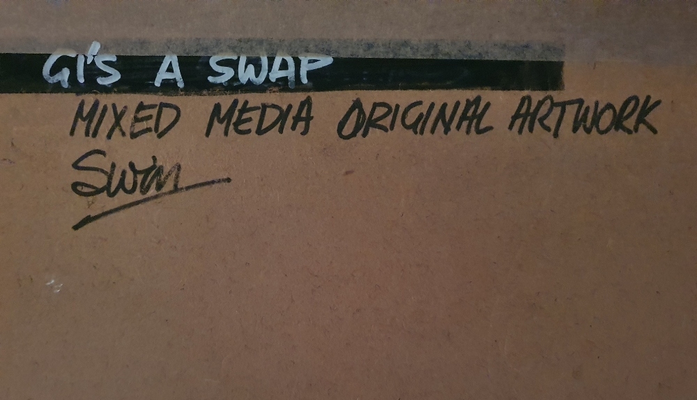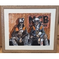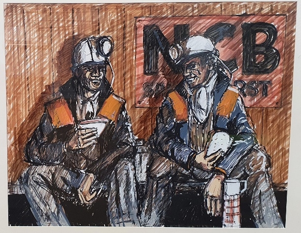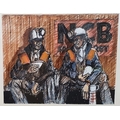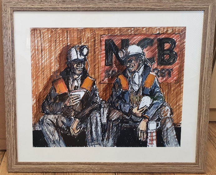 Swin (Swinburne) Tempest Original Framed and Glazed Mixed Media Painting of Two Coal Miners, titled "Gi's a Swap". Size is 26 inches x 22 inches