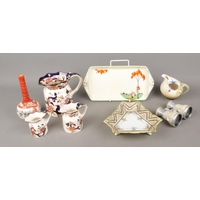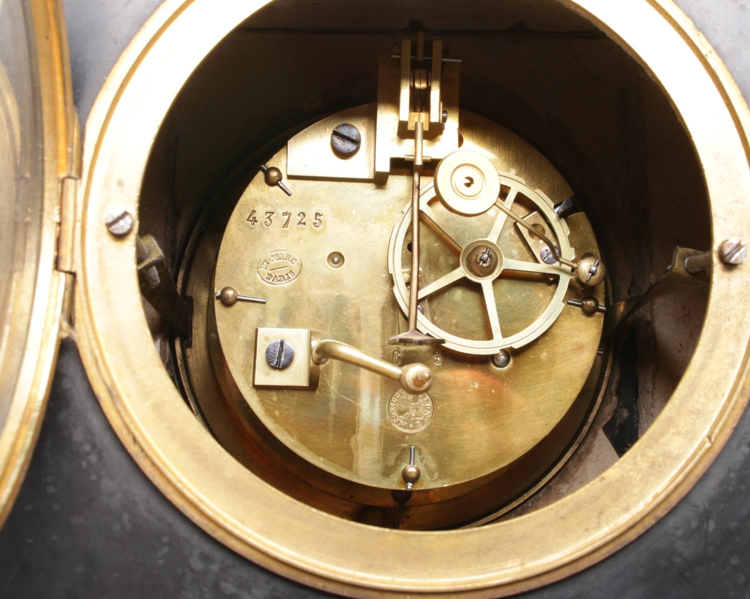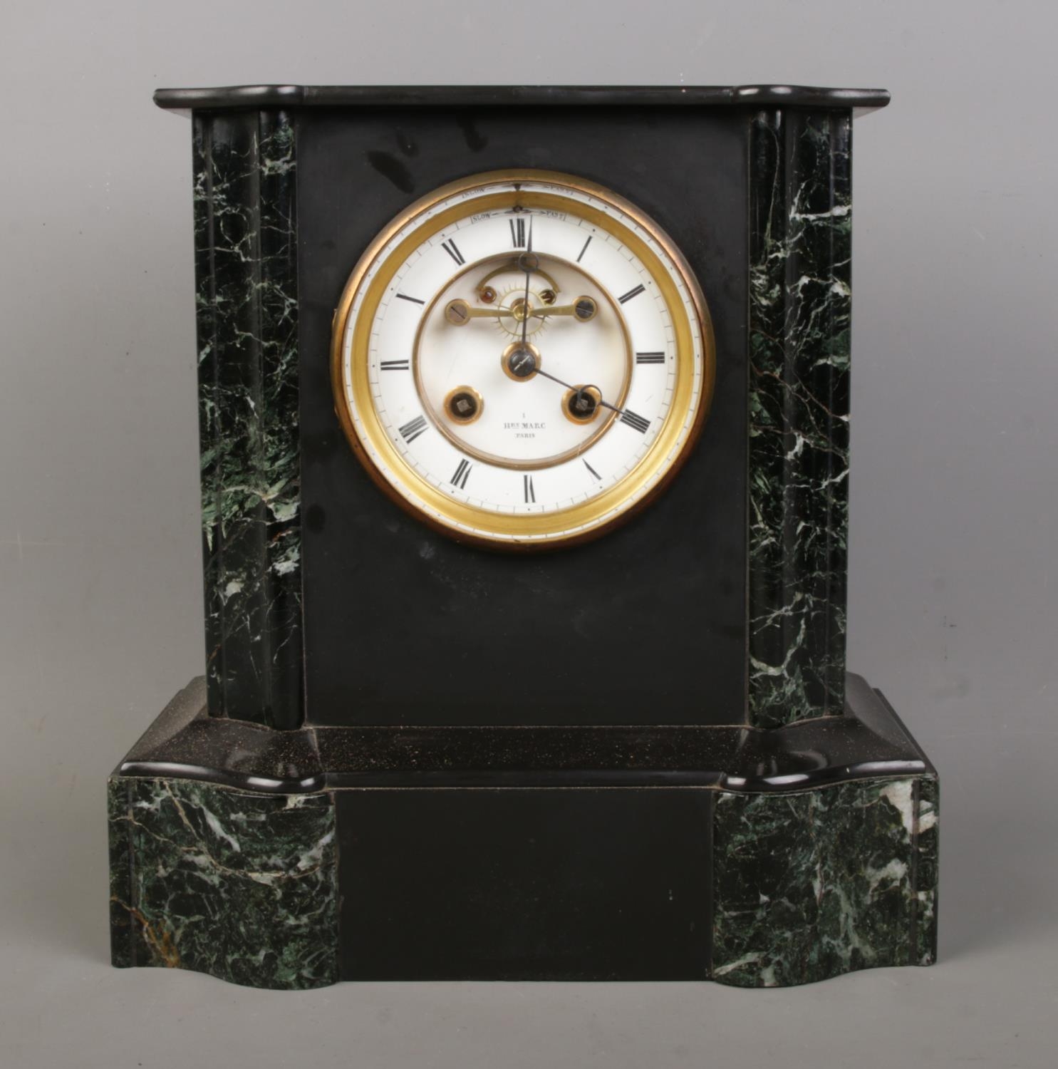 A 19th century black slate and green veined marble mantel clock with visible escapement, stamped 'S. Marti Medaille De Bronze'. Bell and pendulum in clock. Circular dial inscribed 'HRY MARC Paris'. H27.5cm.
