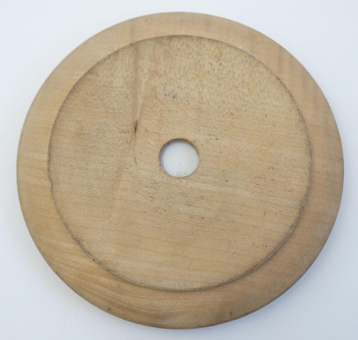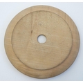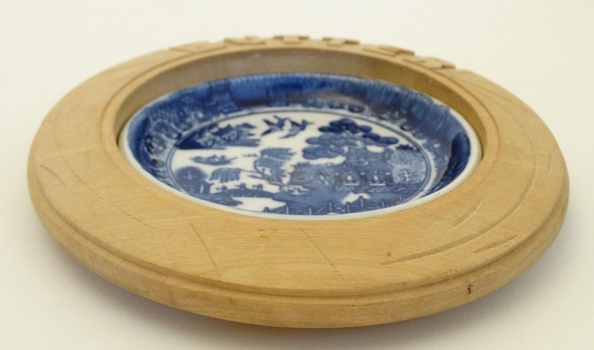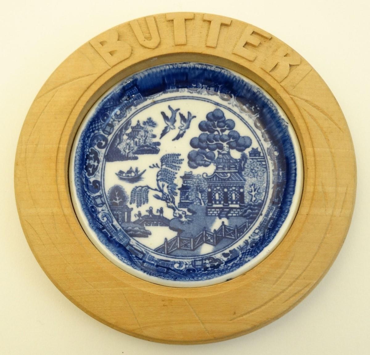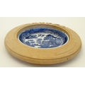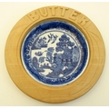 A blue and white ceramic 'Willow' pattern butter dish in carved wooden surround. 6'' diameter.