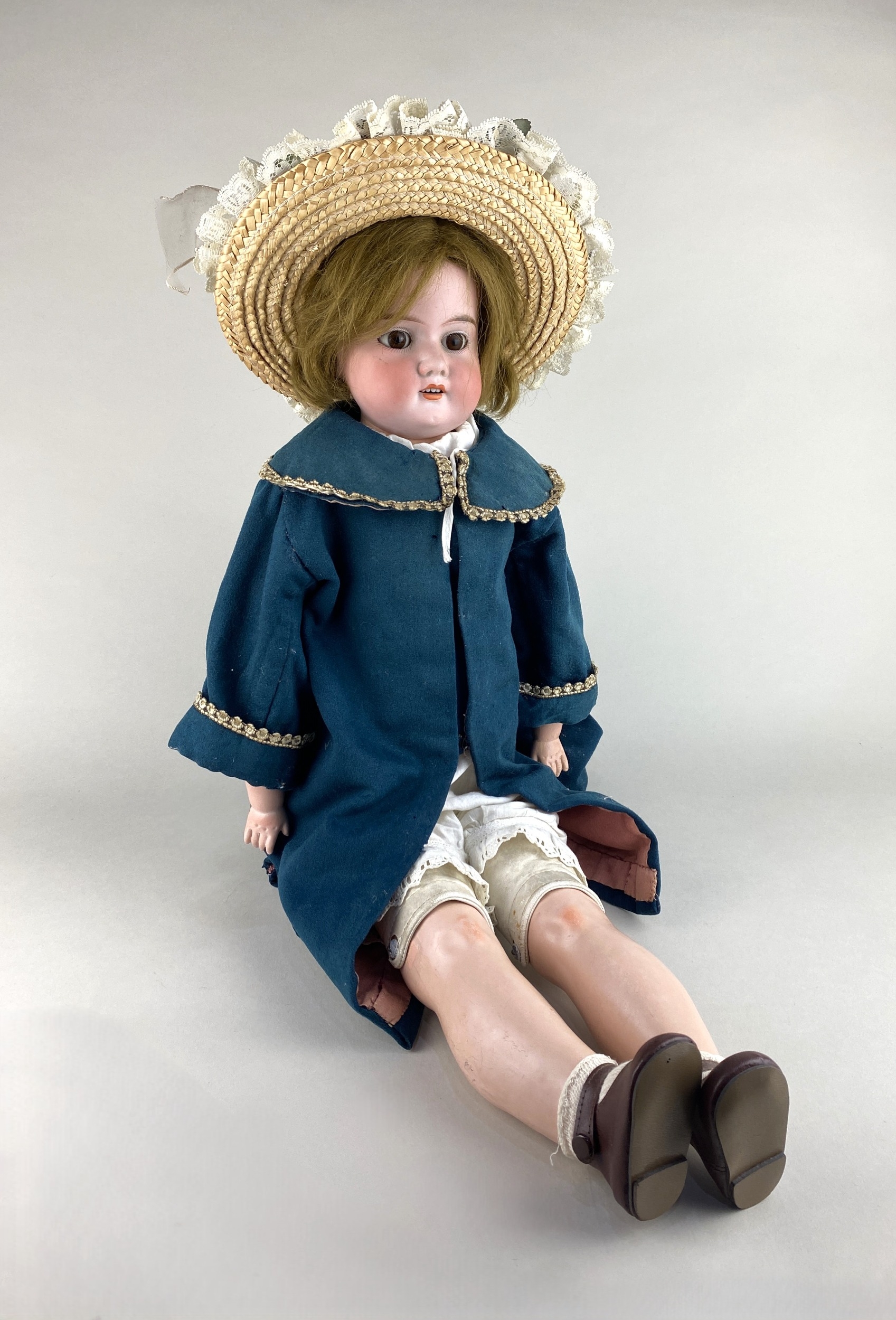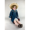 An Armand Marseille German bisque shoulder head doll with sleeping eyes and cloth body, marked numeral 370, with petticoat, blue cape, straw bonnet and shoes, 60cm