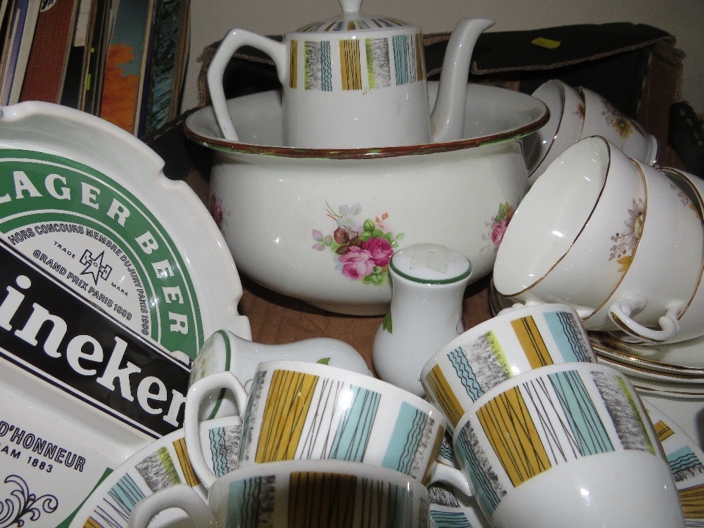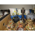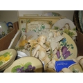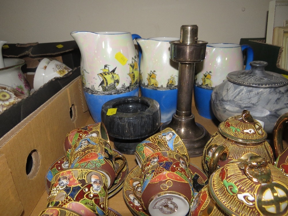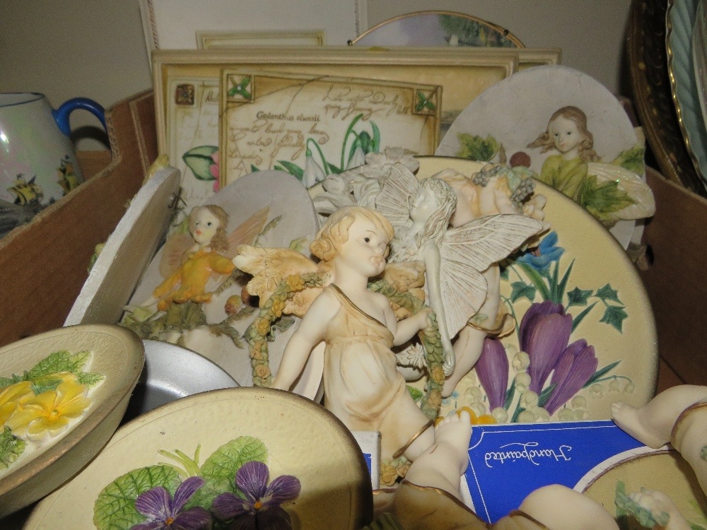 Three trays of assorted ceramics and collectables to include fairy plaques and Japanese style tea ware etc