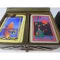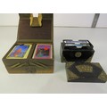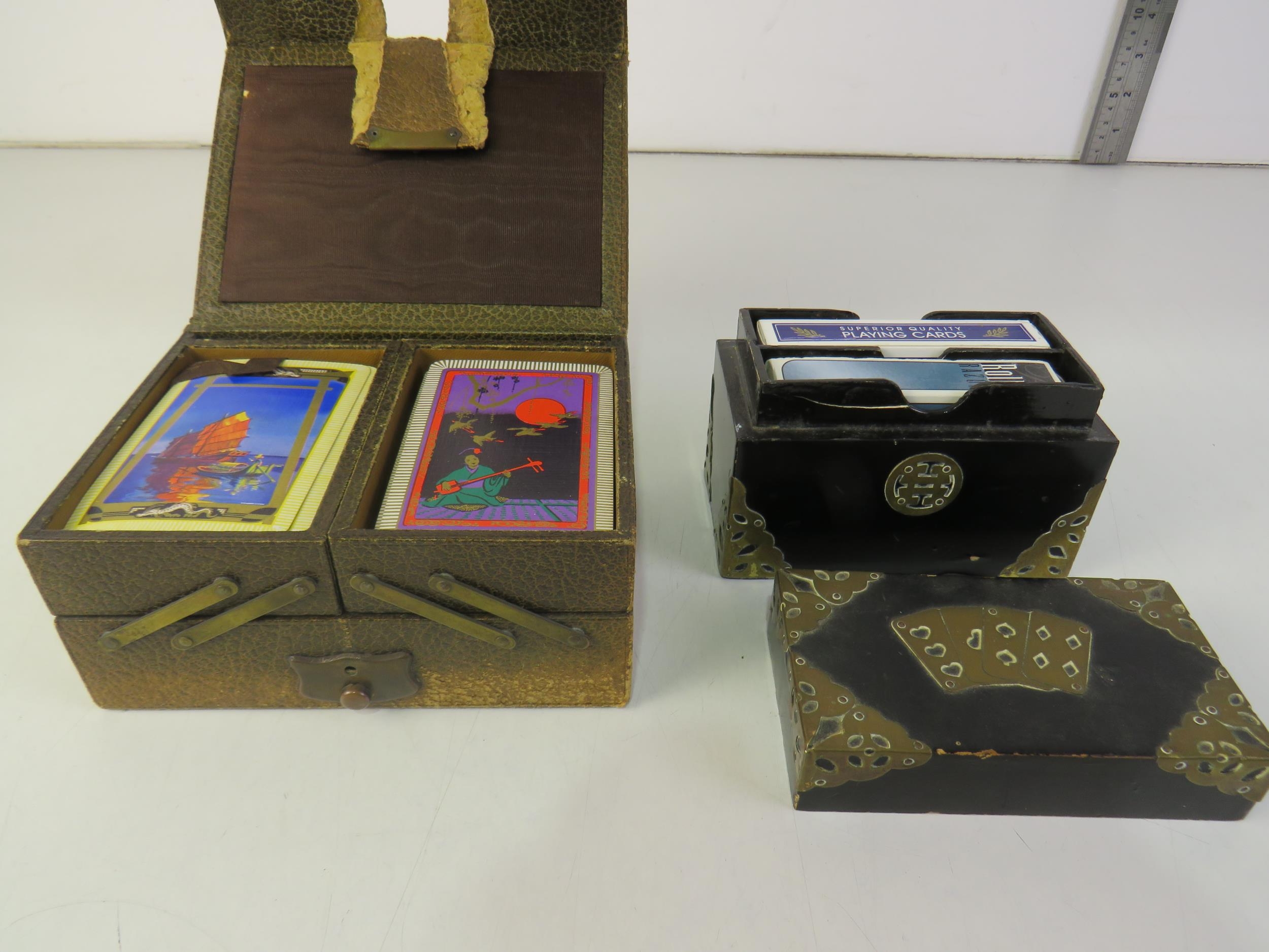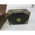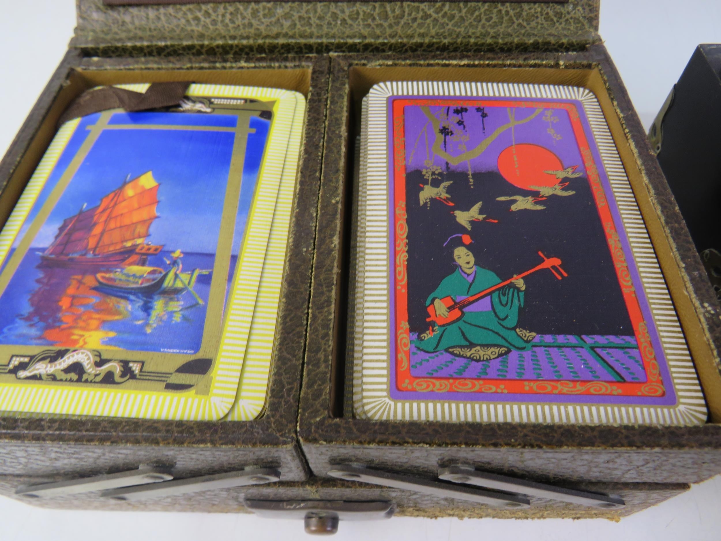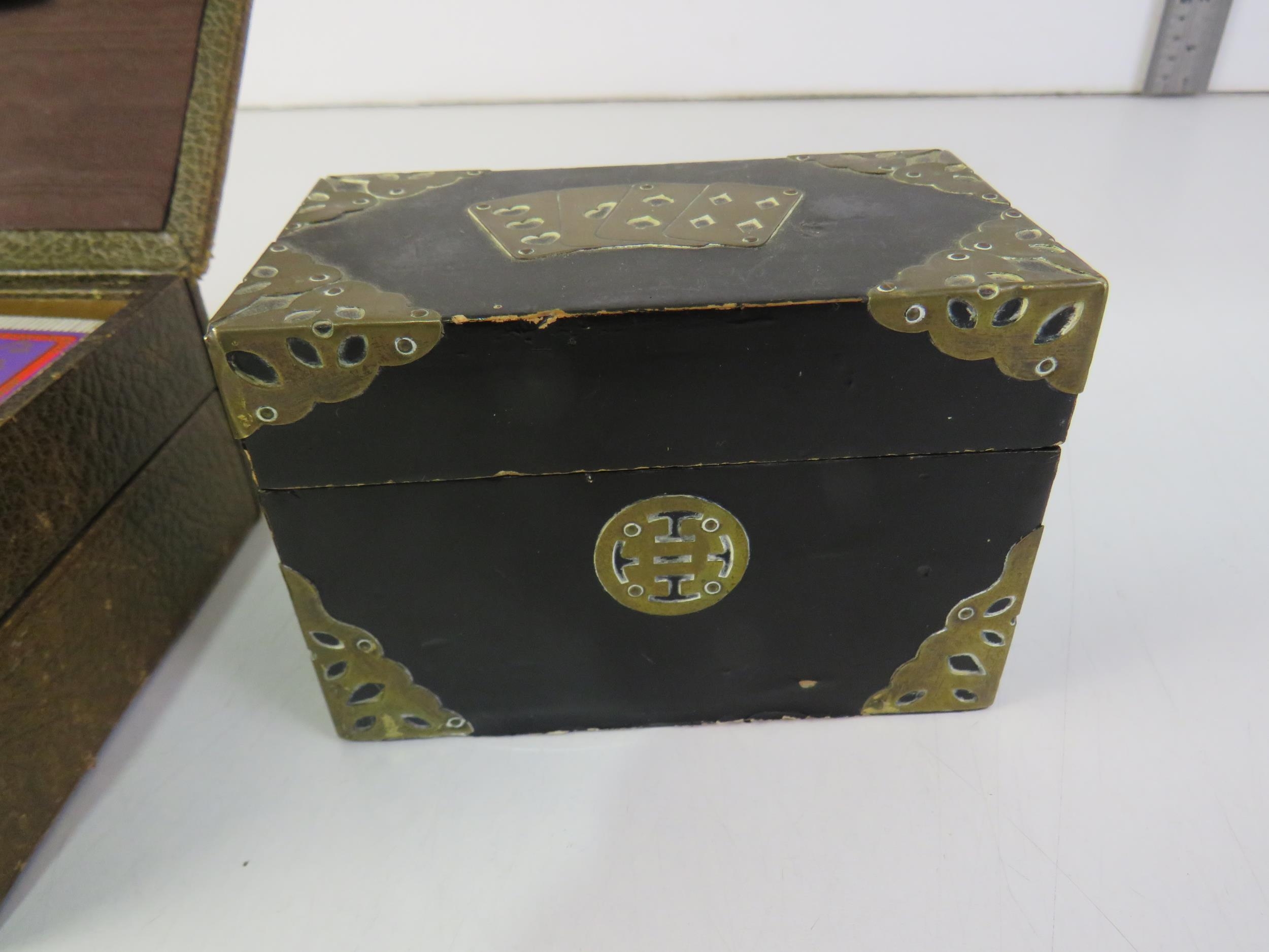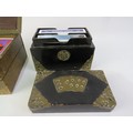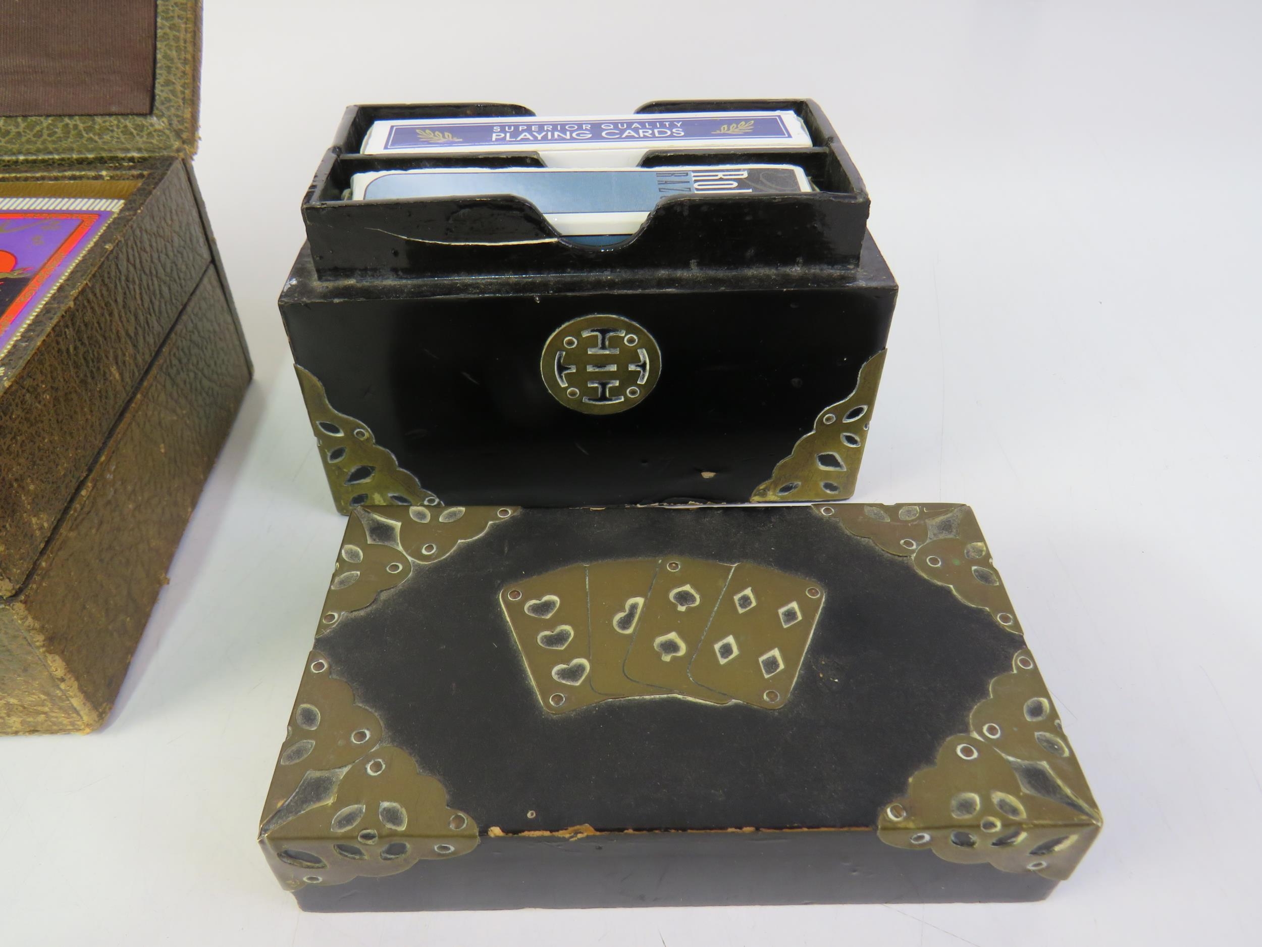 Leather box of oriental playing cards, black lacquer box, brass detailing