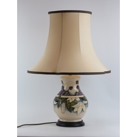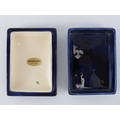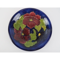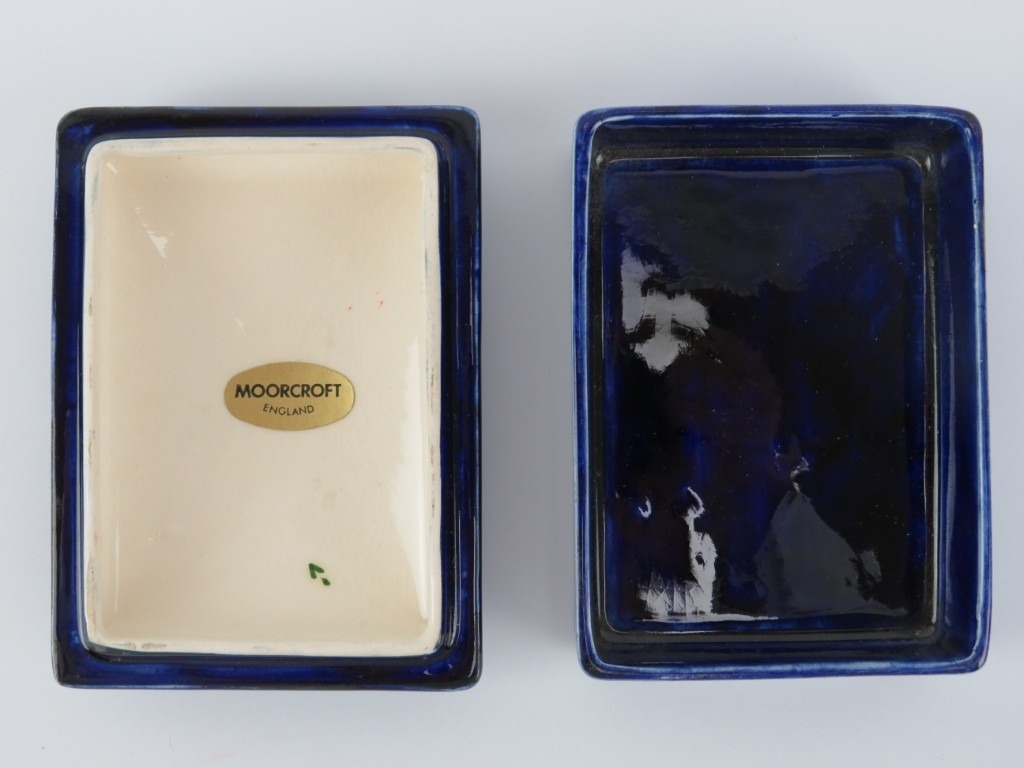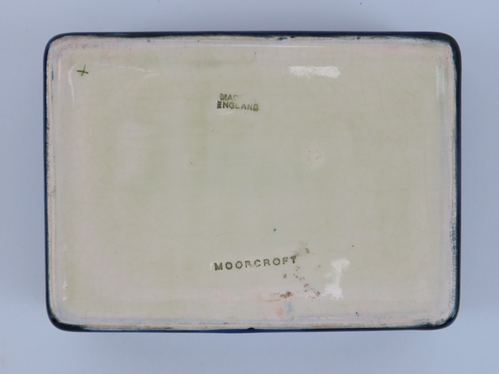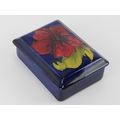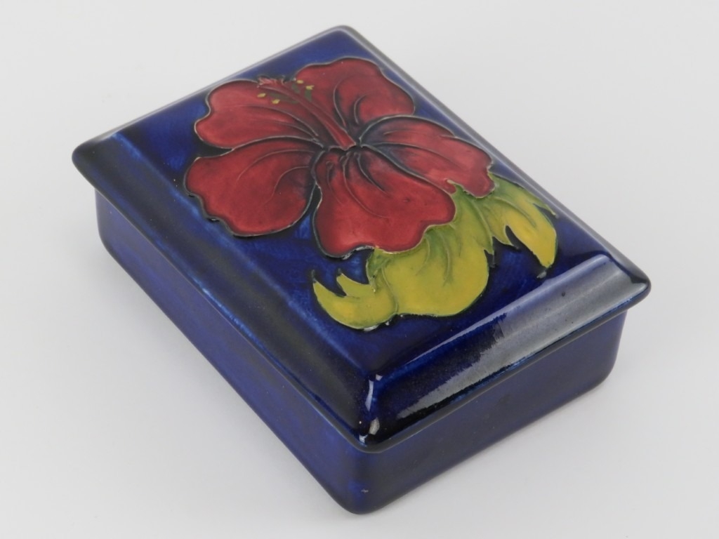 A Walter Moorcroft ‘Hibiscus’ pattern dish, circa 1950s. Tubeline decorated with a hibiscus flower against a blue ground to the cover. 12.4 cm length.