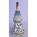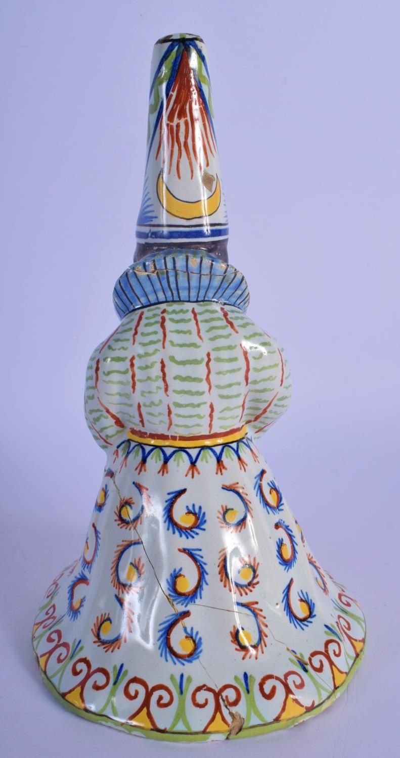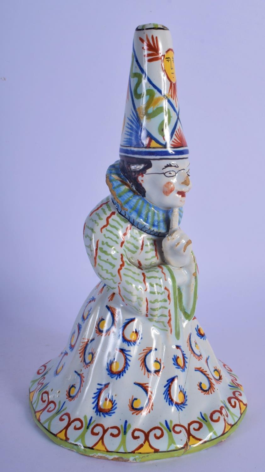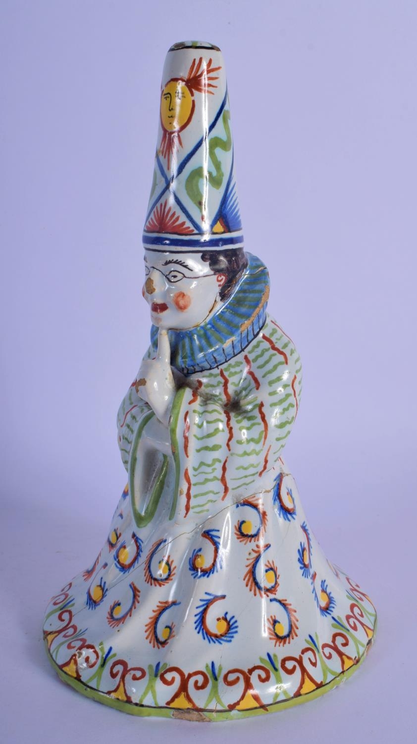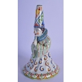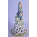 A RARE 19TH CENTURY FRENCH FAIENCE GLAZE JESTER TYPE BELL modelled in floral robes. 21 cm x 8 cm.