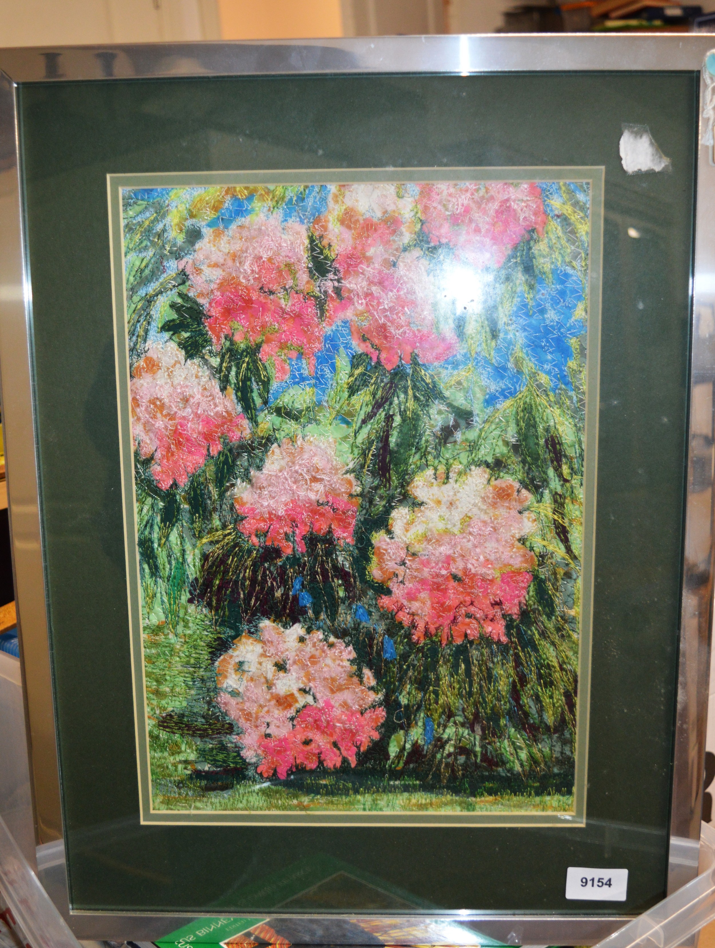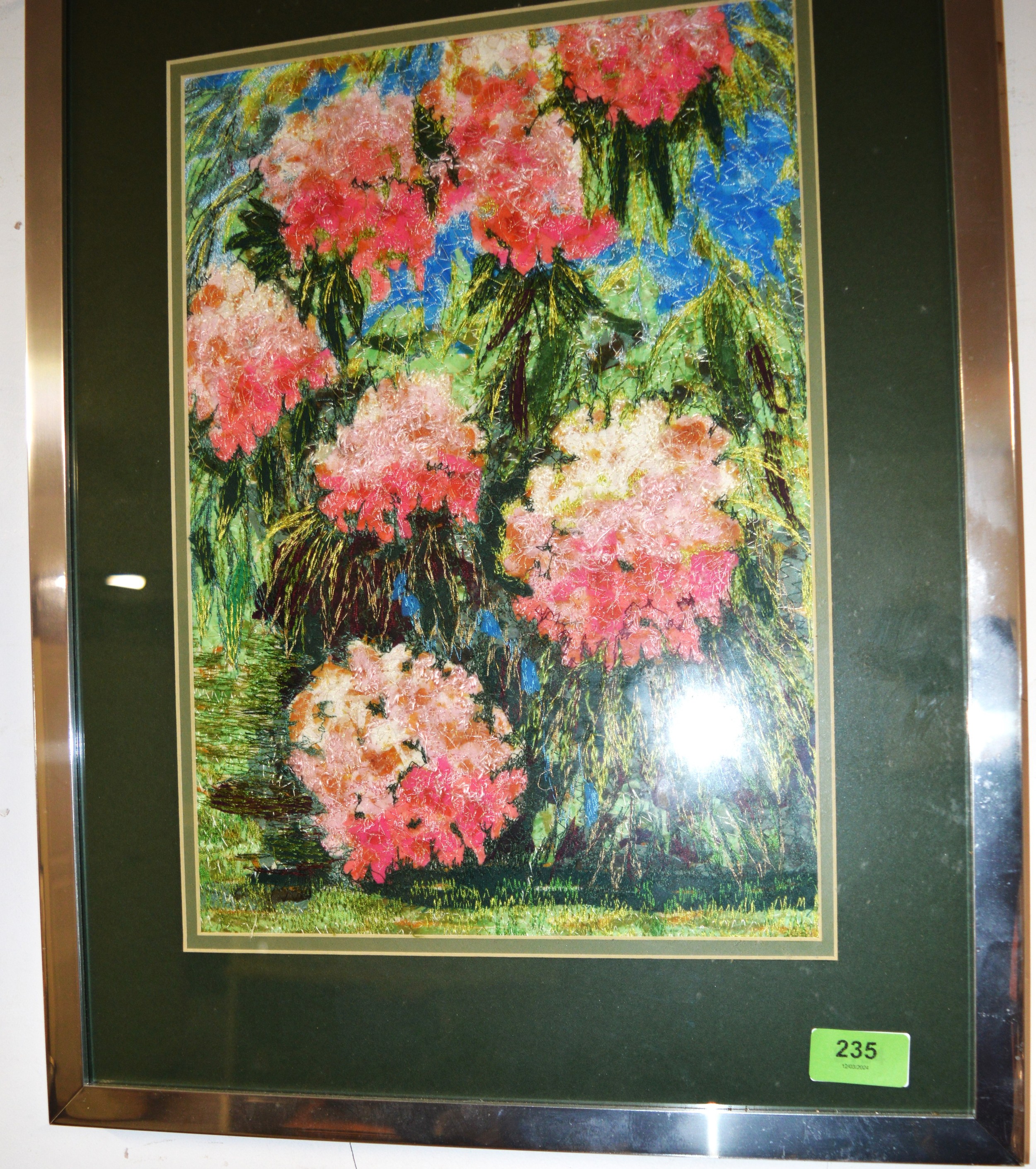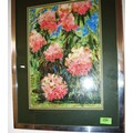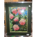 Framed and Mounted (Under Glass) Textile Art Signed Verso by Greta Fitchett Titled "Rhododendrons" - 16.5" x 22"