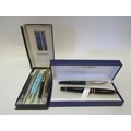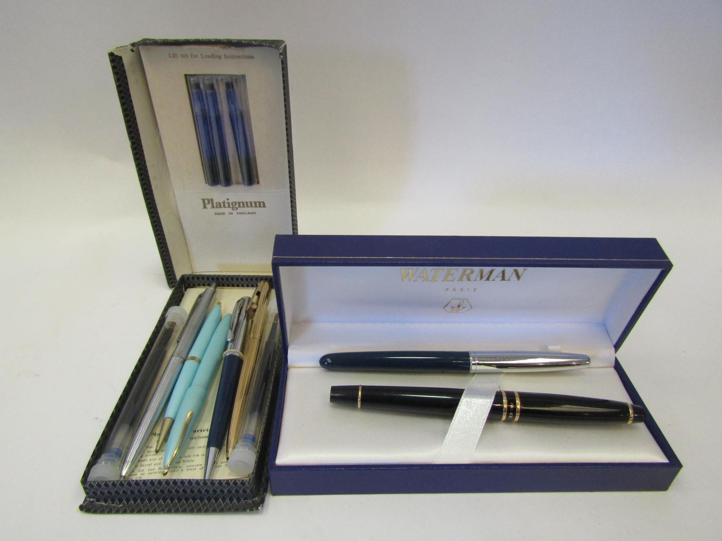 A selection of pens including Waterman Paris and Parker fountain pens, Queensway fountain pen and propelling pencil, Parker and Papermate ballpoints, etc
