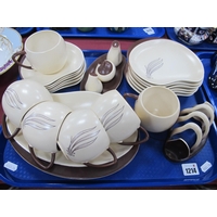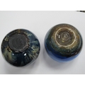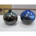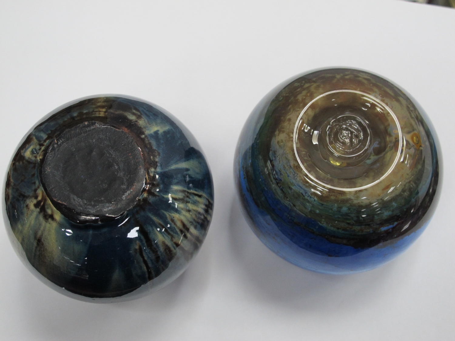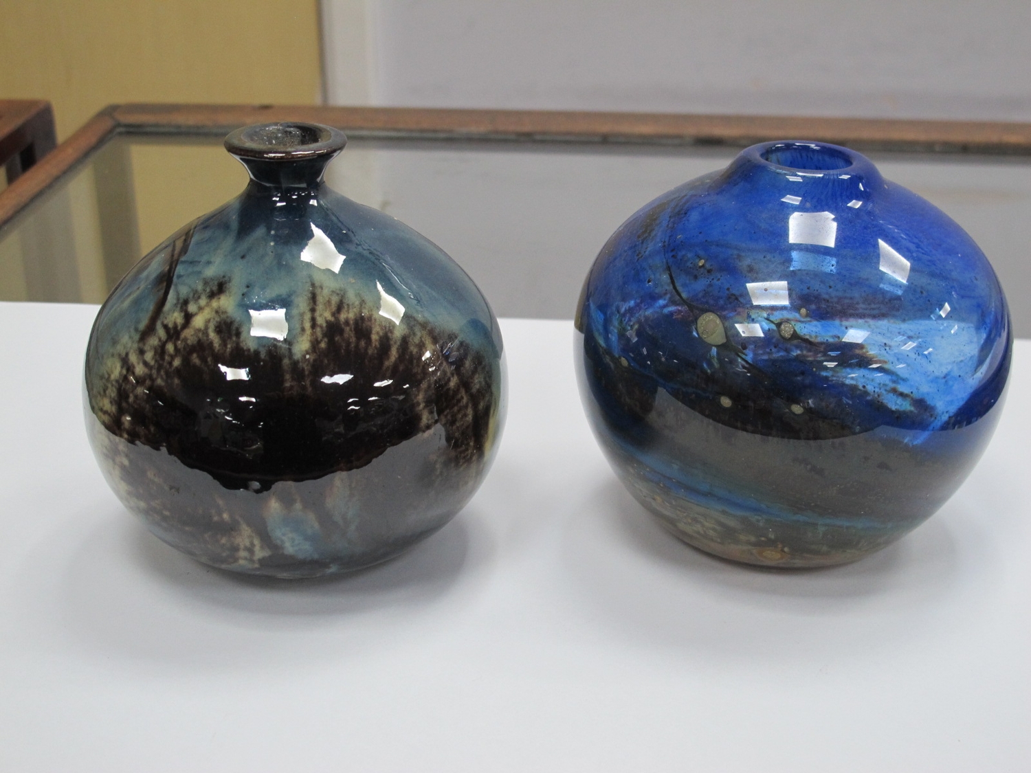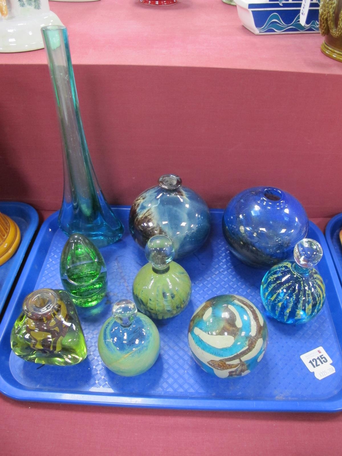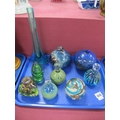 Blue and Brown Streaked Ceramic Spherical Spill Vase, Mdina style paperweights, slender turquoise spill vase, 29cm high (9):- One Tray.