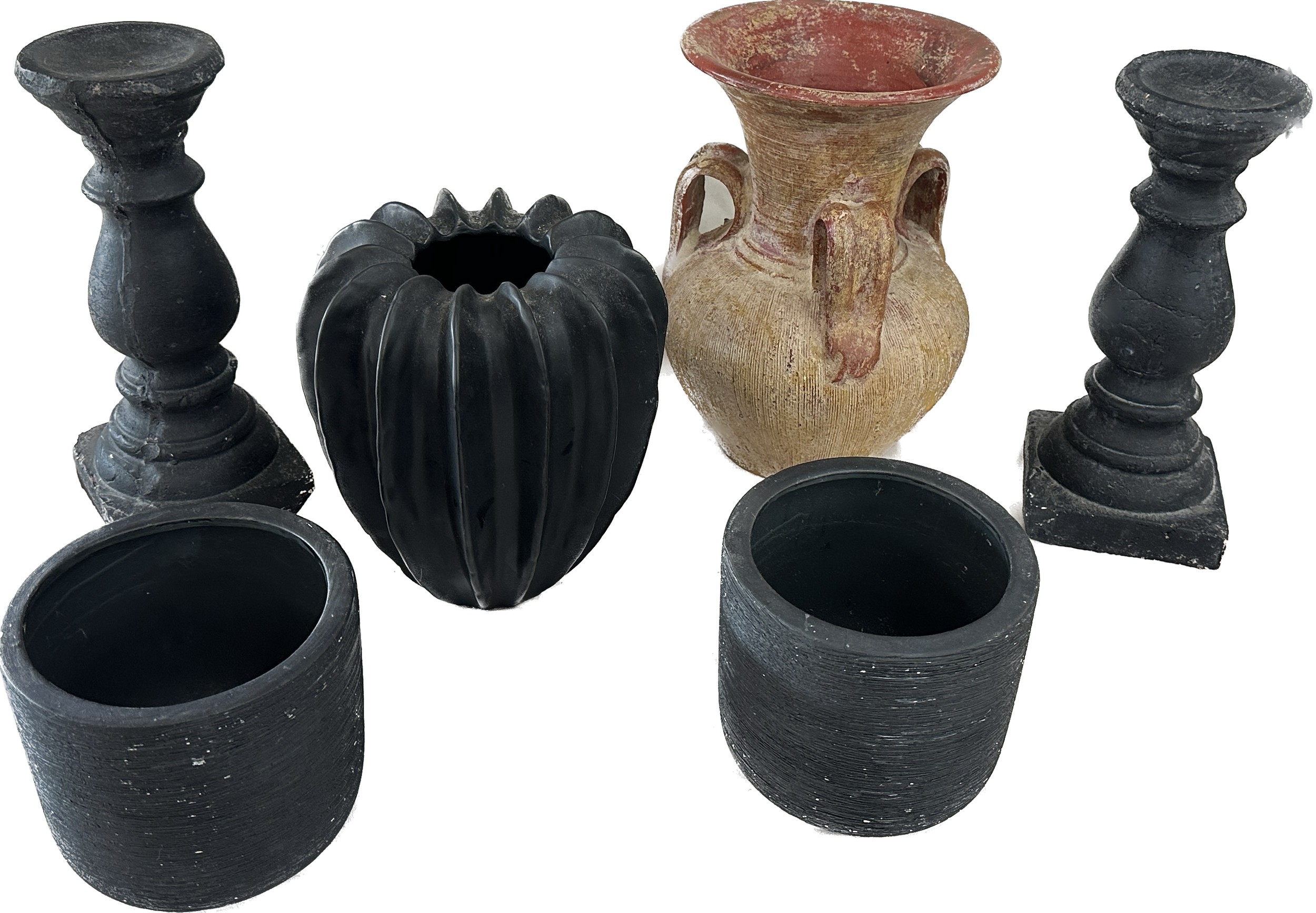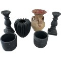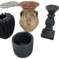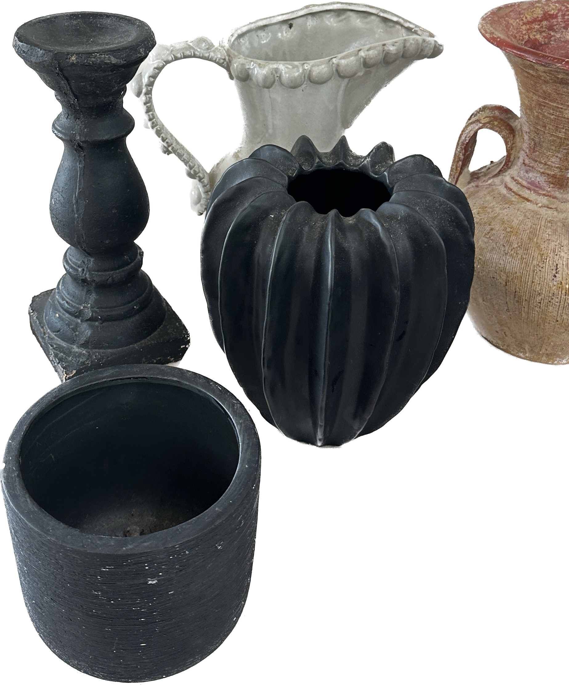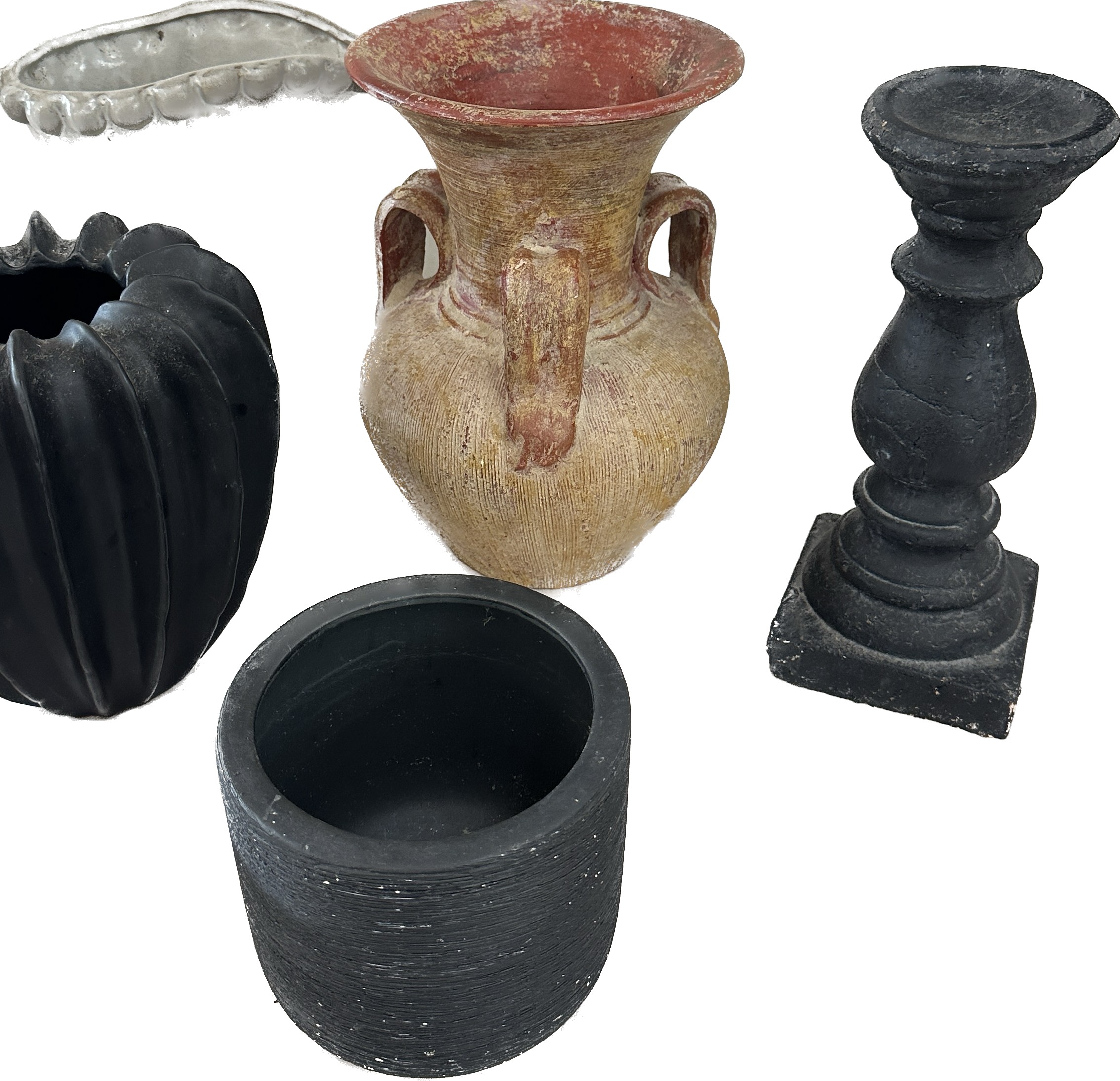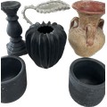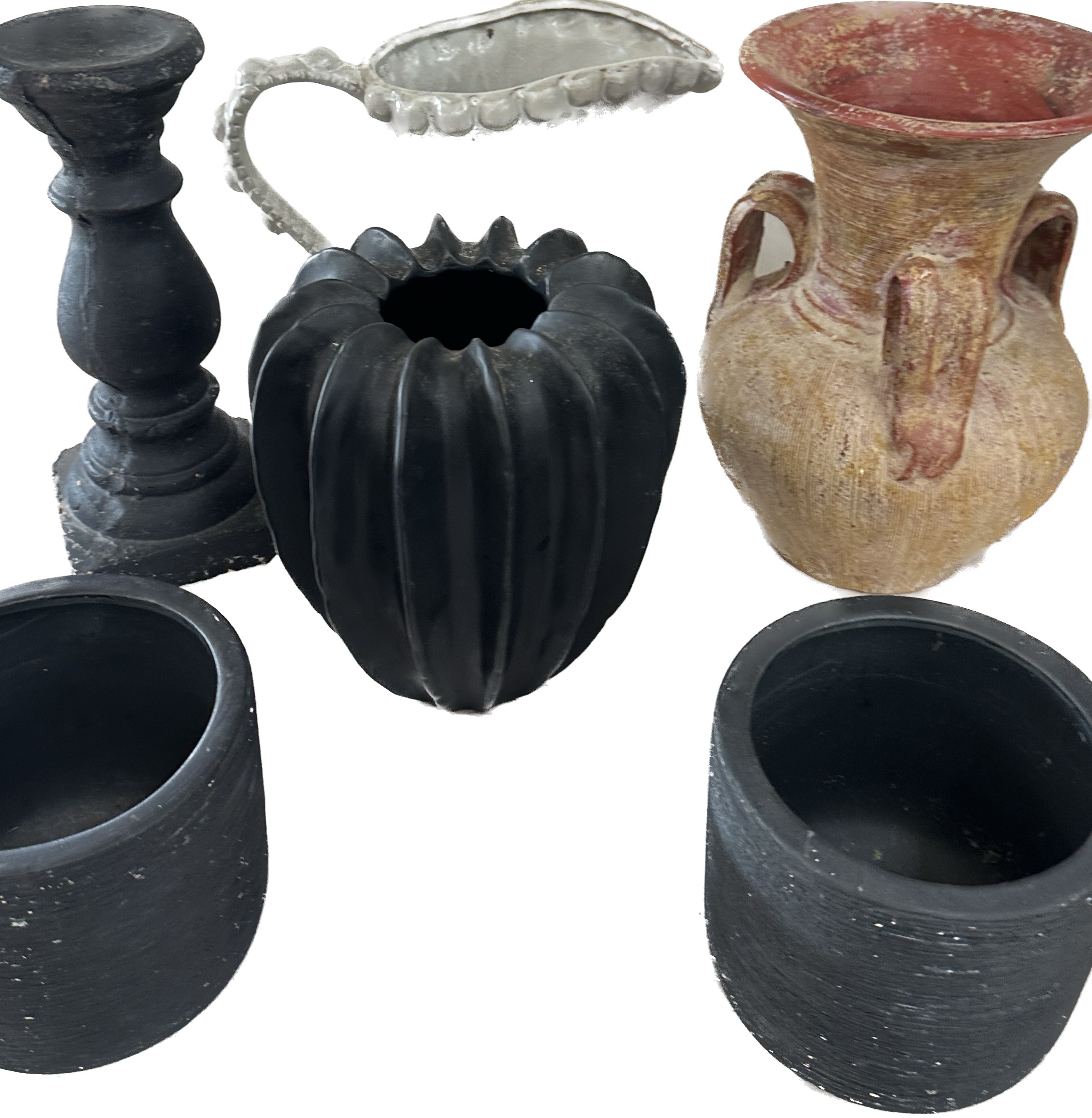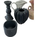 Selection of assorted large decorative pieces to include vases, jug, two matching black plant pots etc