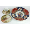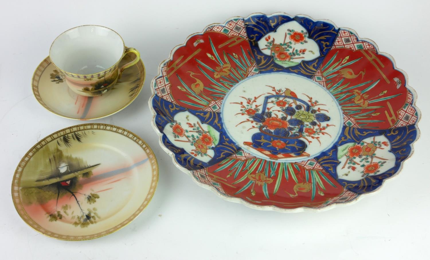 Scalloped edge with floral decoration, together with a Kutani coffee cup and a Nippon cup saucer and side plate.