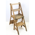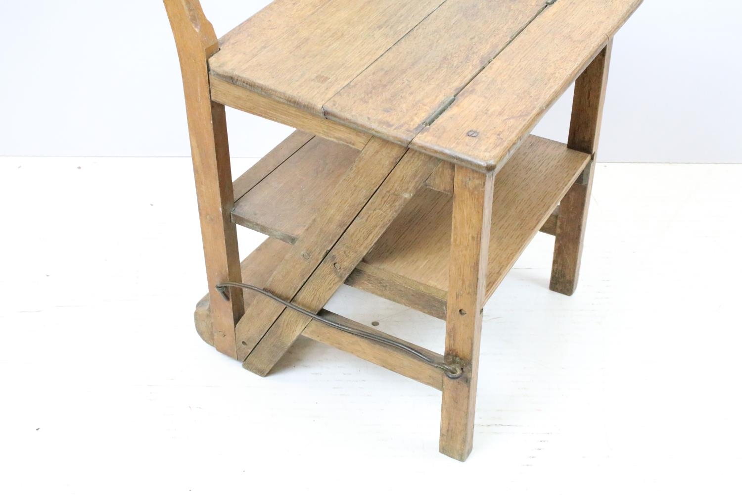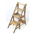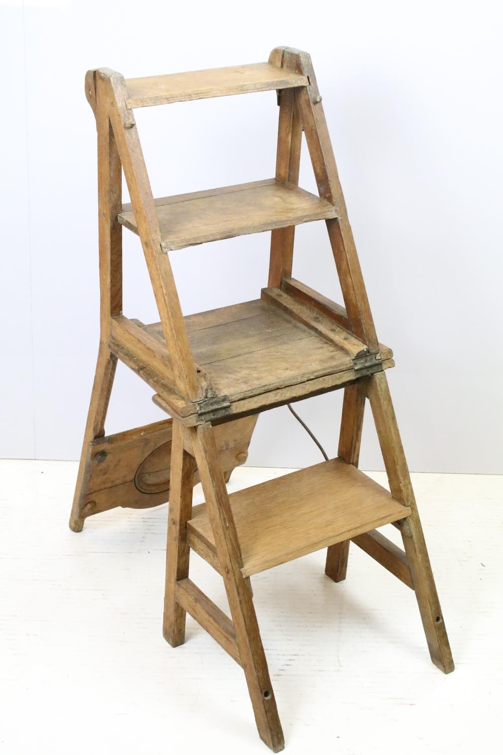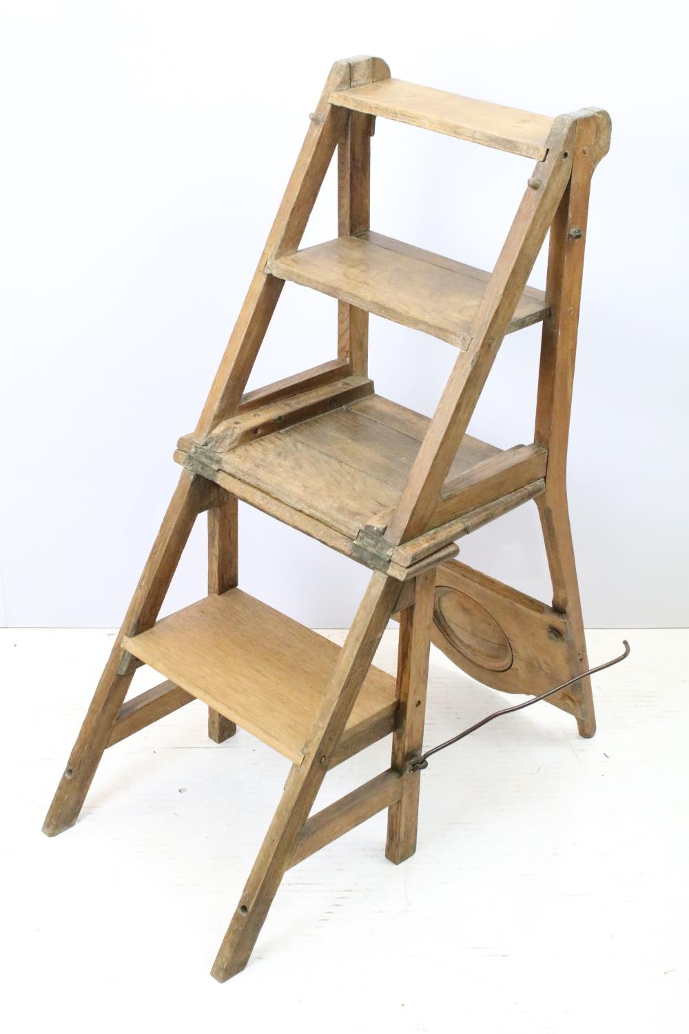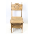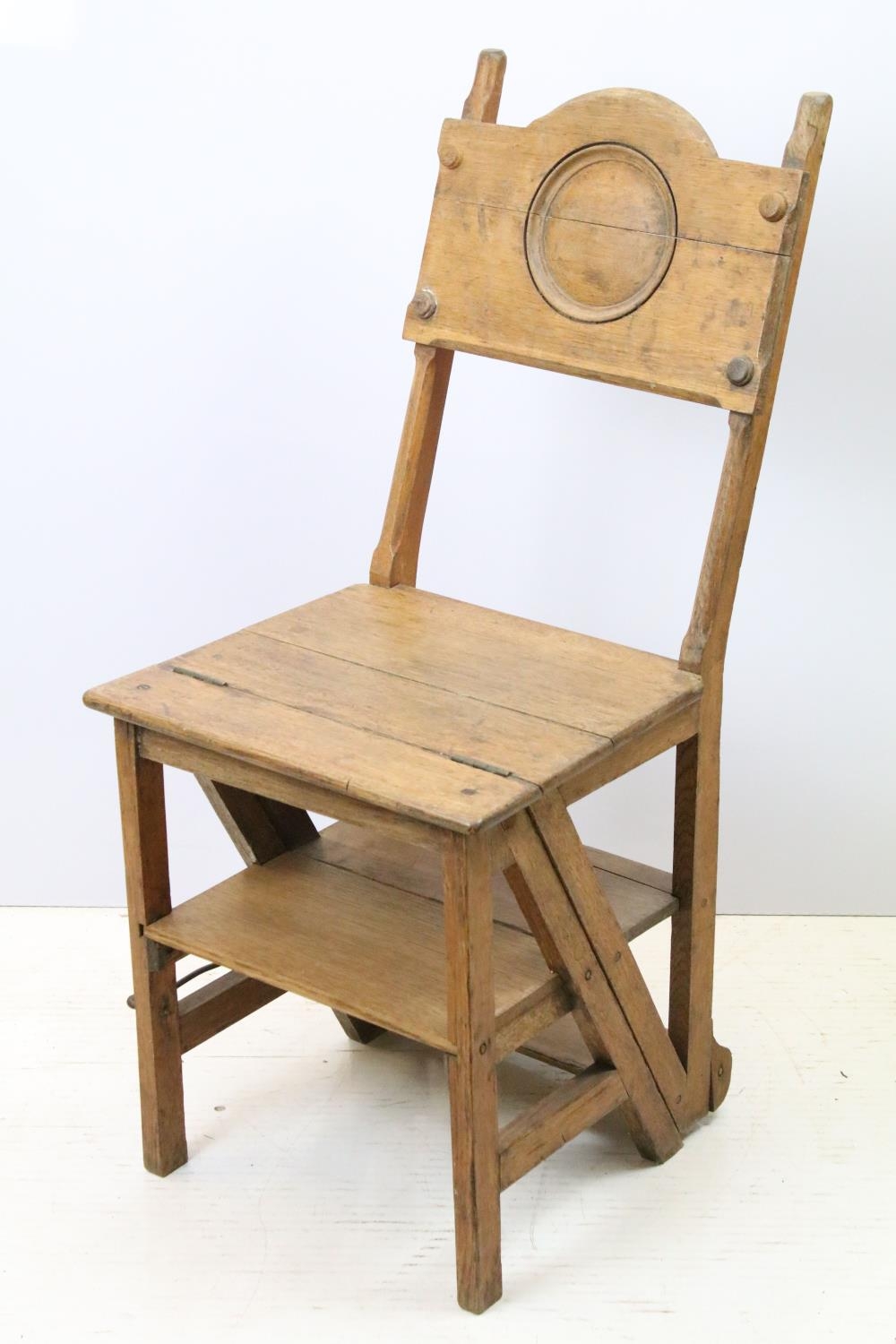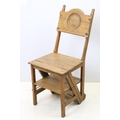 Arts and Crafts metamorphic library chair, the arched backrest with a central circular panel, on chamfered supports, folds to transform into a set of library steps, 85.5cm high x 38.5cm wide x 34cm deep (seat)