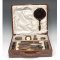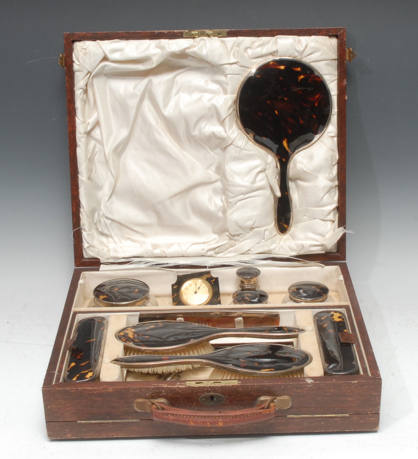 A comprehensive George V silver and tortoiseshell dressing table suite, comprising hair and clothes brushes, a hand mirror, a manicure set, boudoir timepiece and an arrangement of jars and bottles, the mirror 26cm long, Birmingham 1925 and similar dates, cased