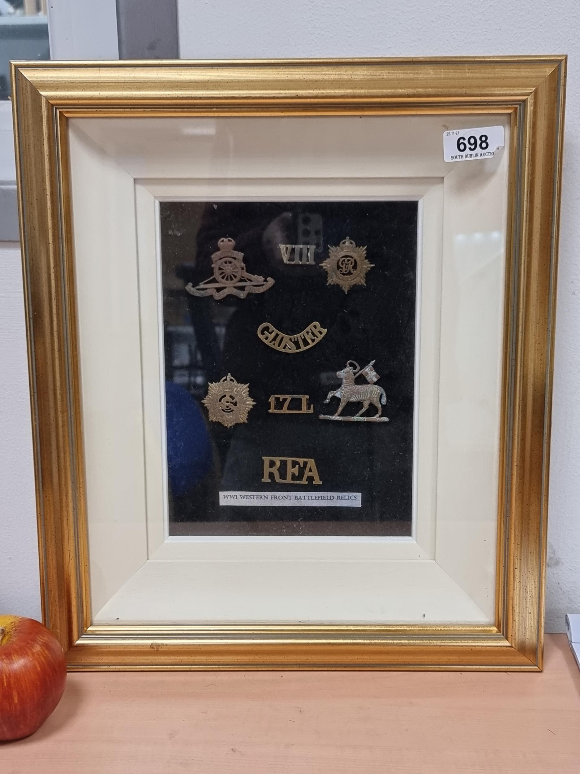 A nicely framed collection of WWI Western Front Battlefield relics. Including cap badges and shoulder badges.