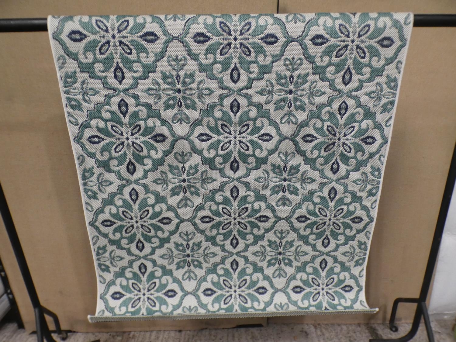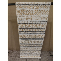 A white, blue and green patterned woven runner (66cm x 230cm) * This lot is subject to VAT
