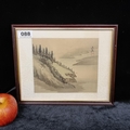 Neat sized original Japanese painting on silk showing a tree-lined mountainscape. With red artist stamp