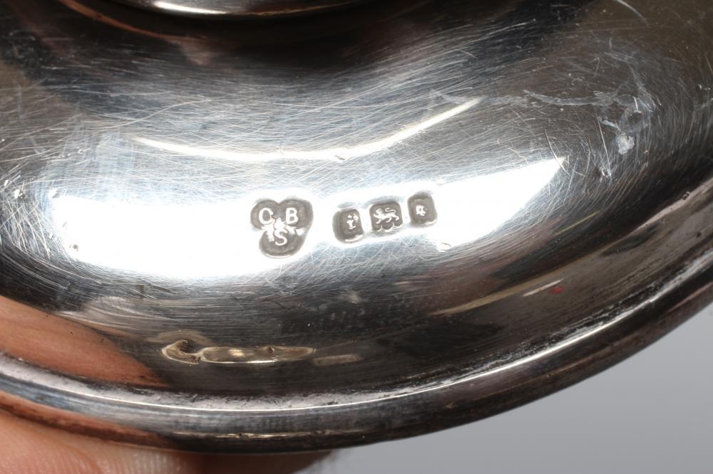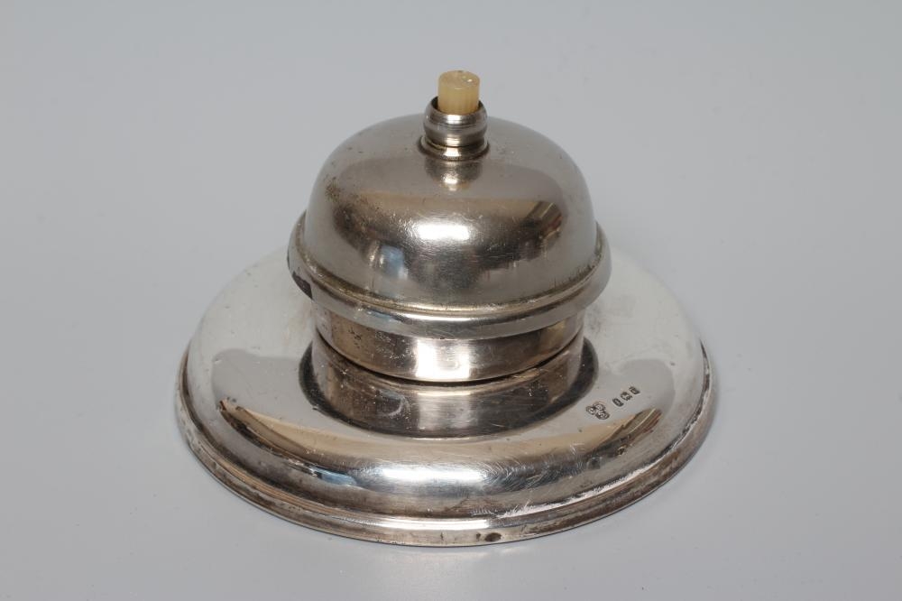 A SILVER SHOP COUNTER BELL by Charles Boyton & Son Ltd., London 1924, with ivorine push button, on a low domed base, 4" diameter (Illustrated)