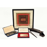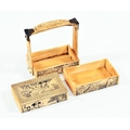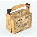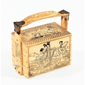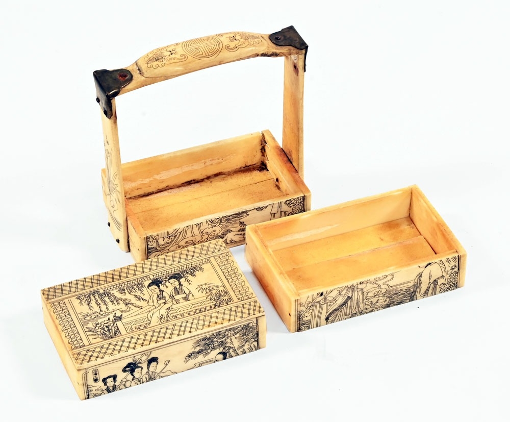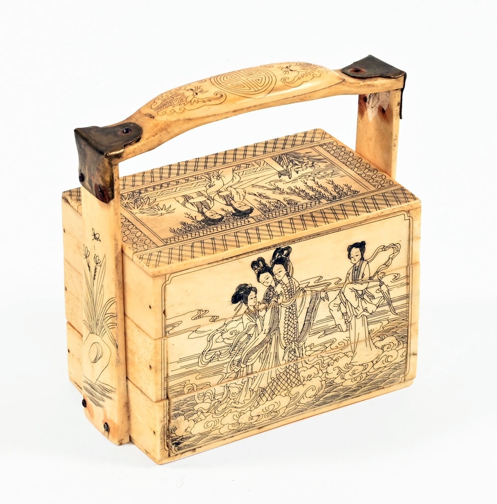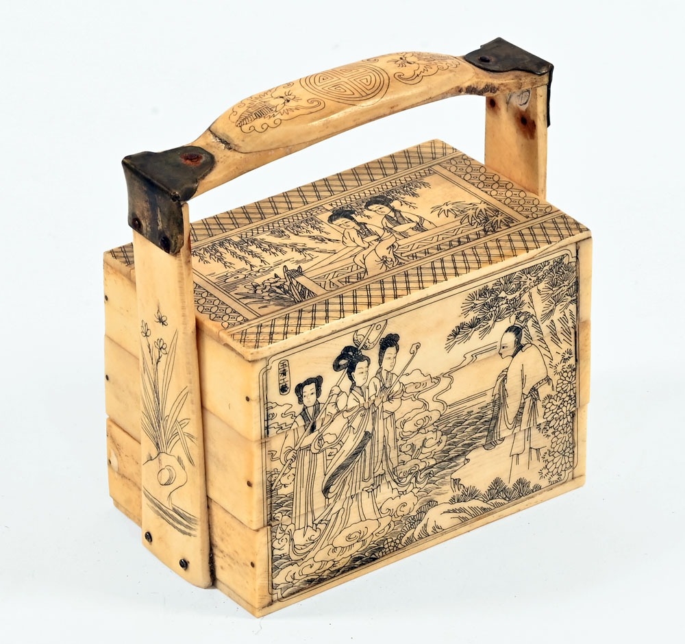 A Japanese bone ornamental Bento box, with three tiers, decoration depicting traditional figures. 11 cm wide, 6.5 cm deep, 12.5 cm tall.
