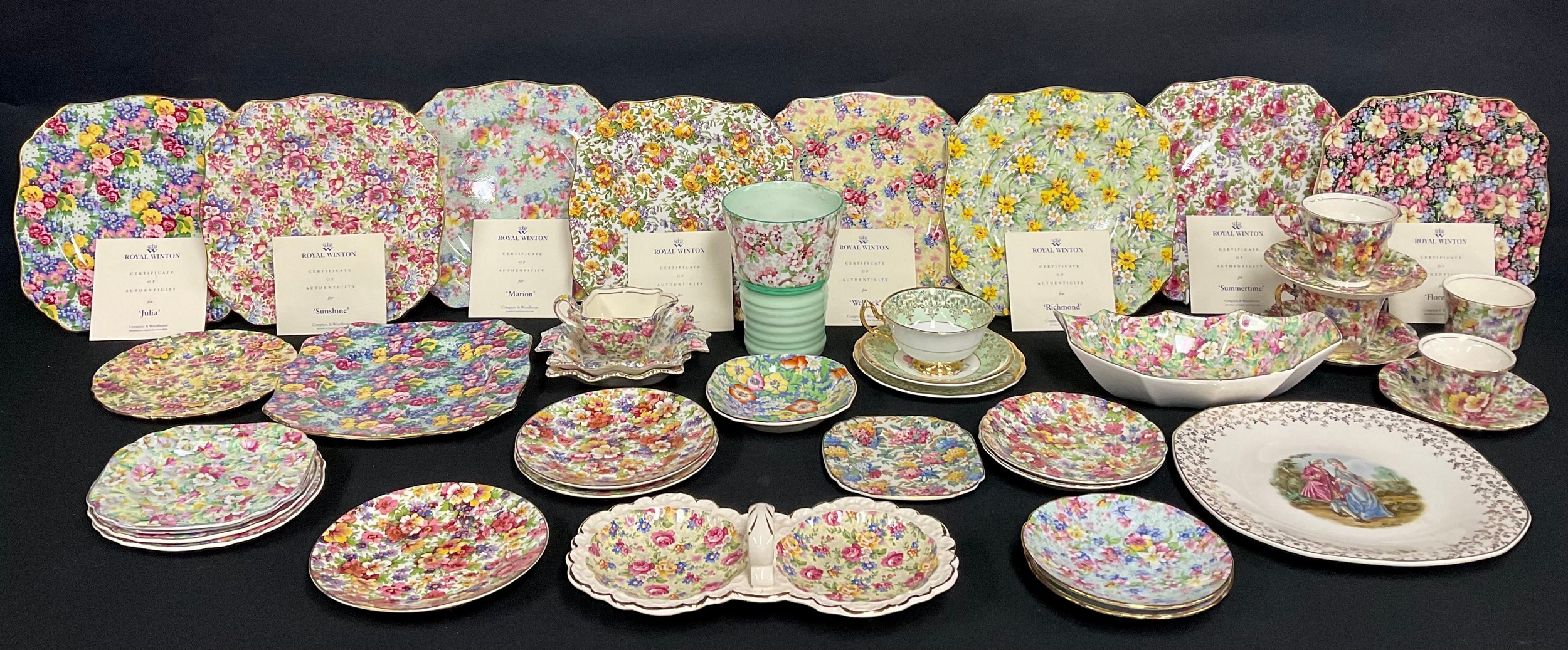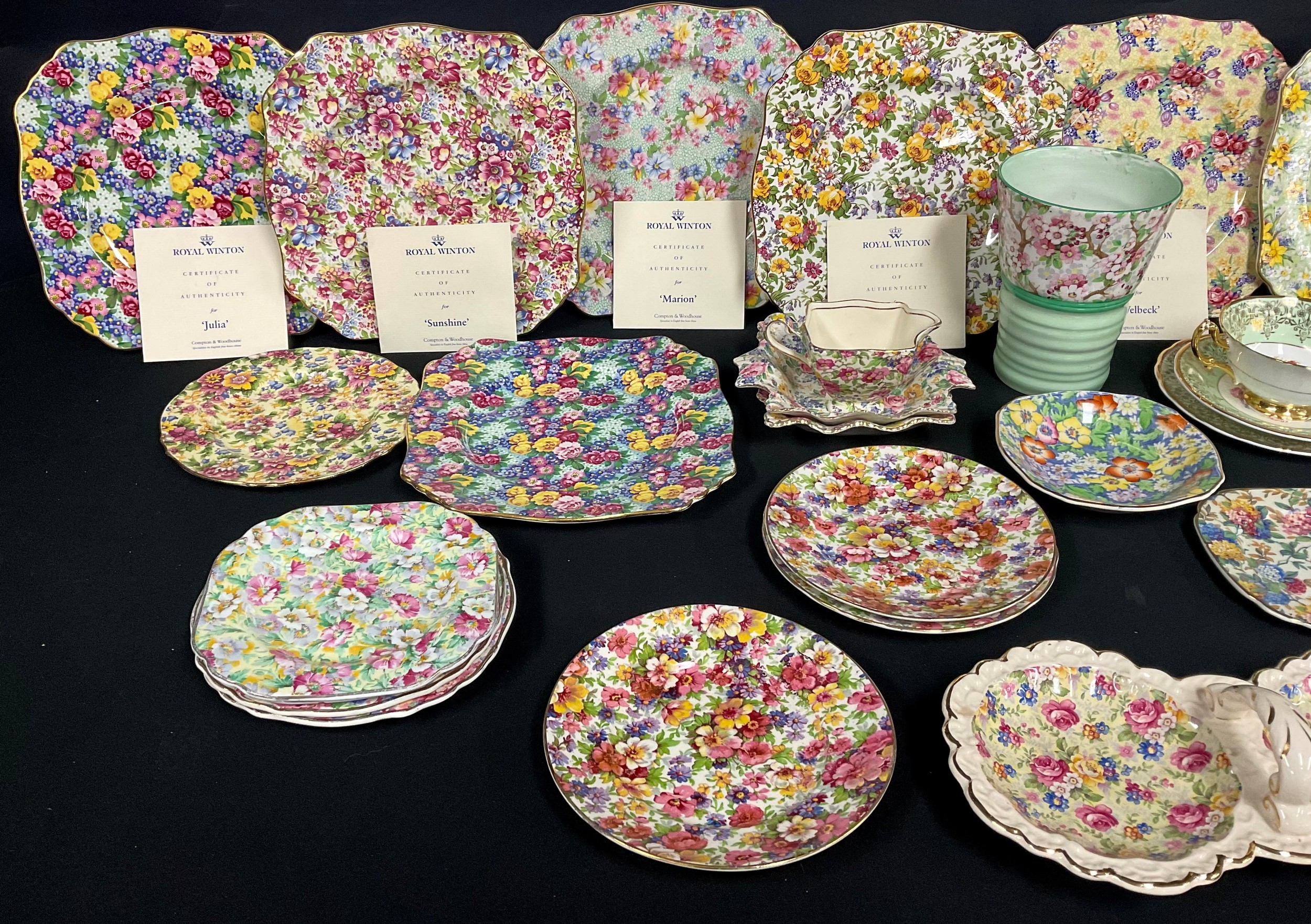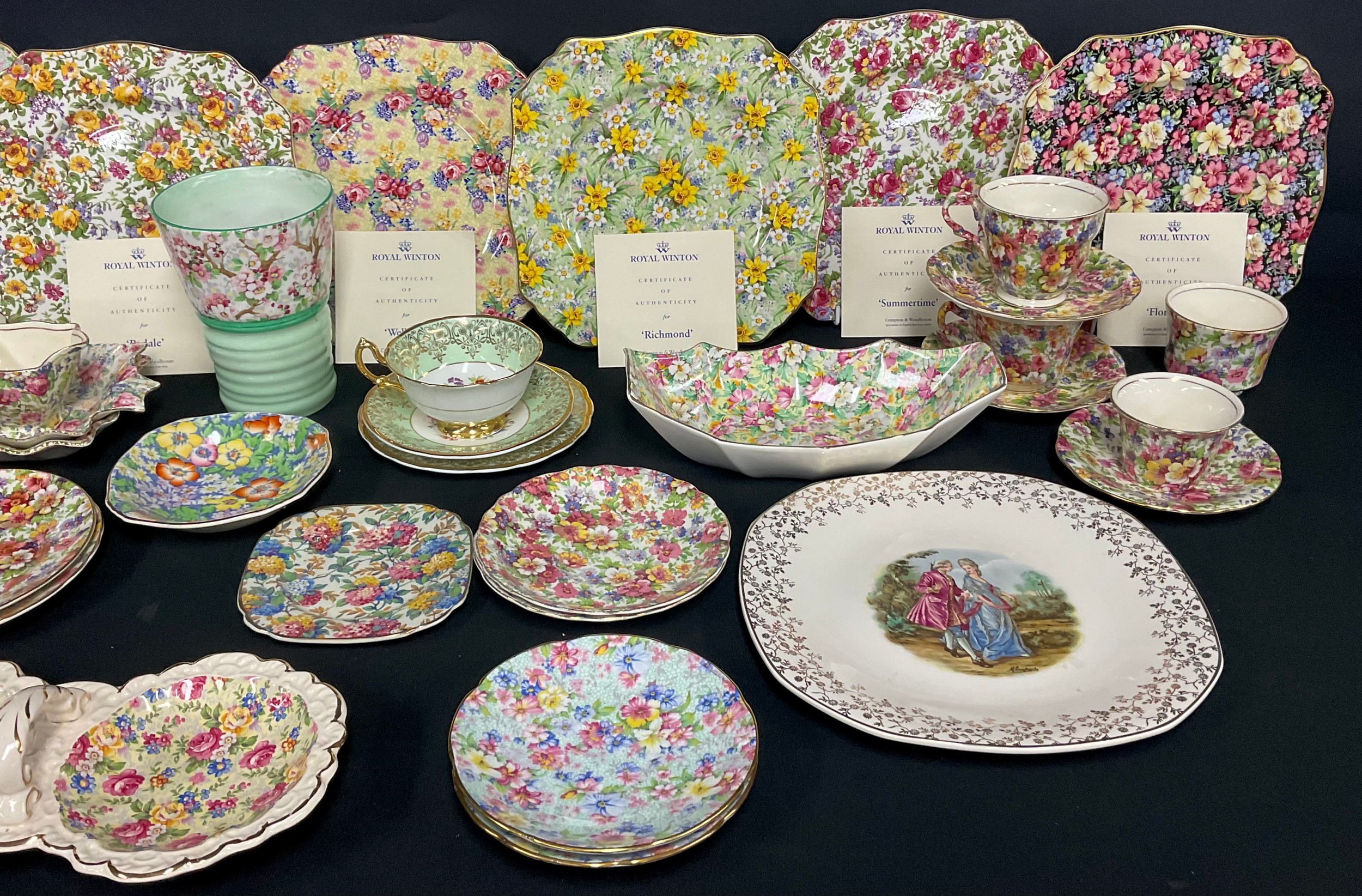 A set of eight Royal Winton chintz plates, Compton & Woodhouse limited editions of 9,500, including Florence, Julia, Summertime, Richmond, Welbeck, etc, 23.5cm wide, all with certificate; other chintz, 1930's and later, including Shelley, Royal Winton, James Kent, etc, qty