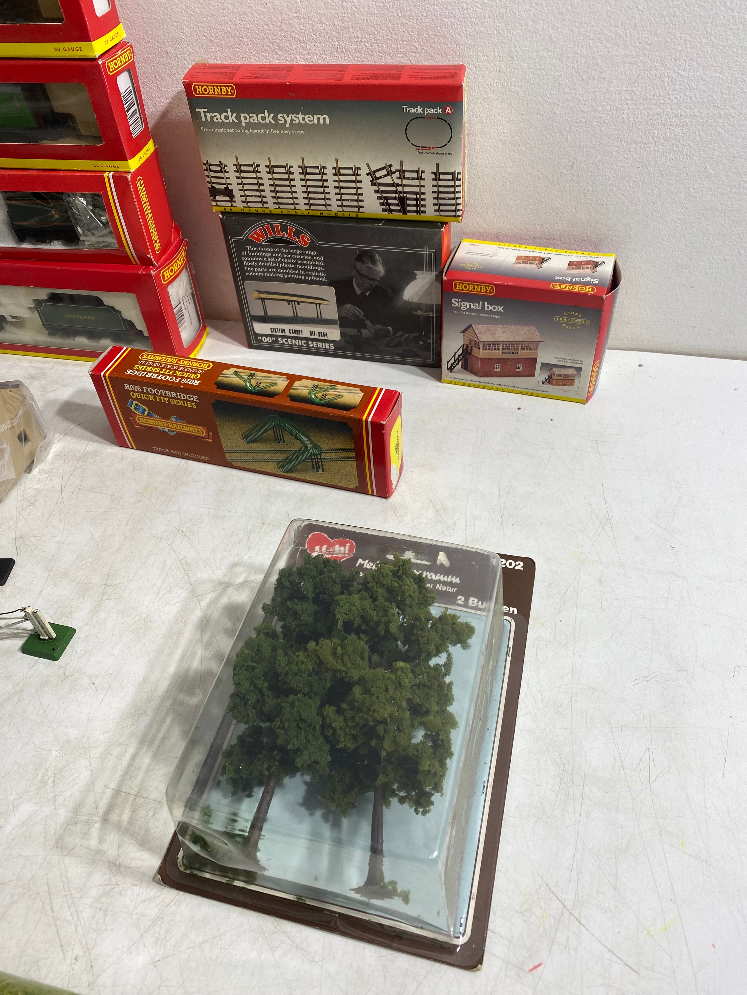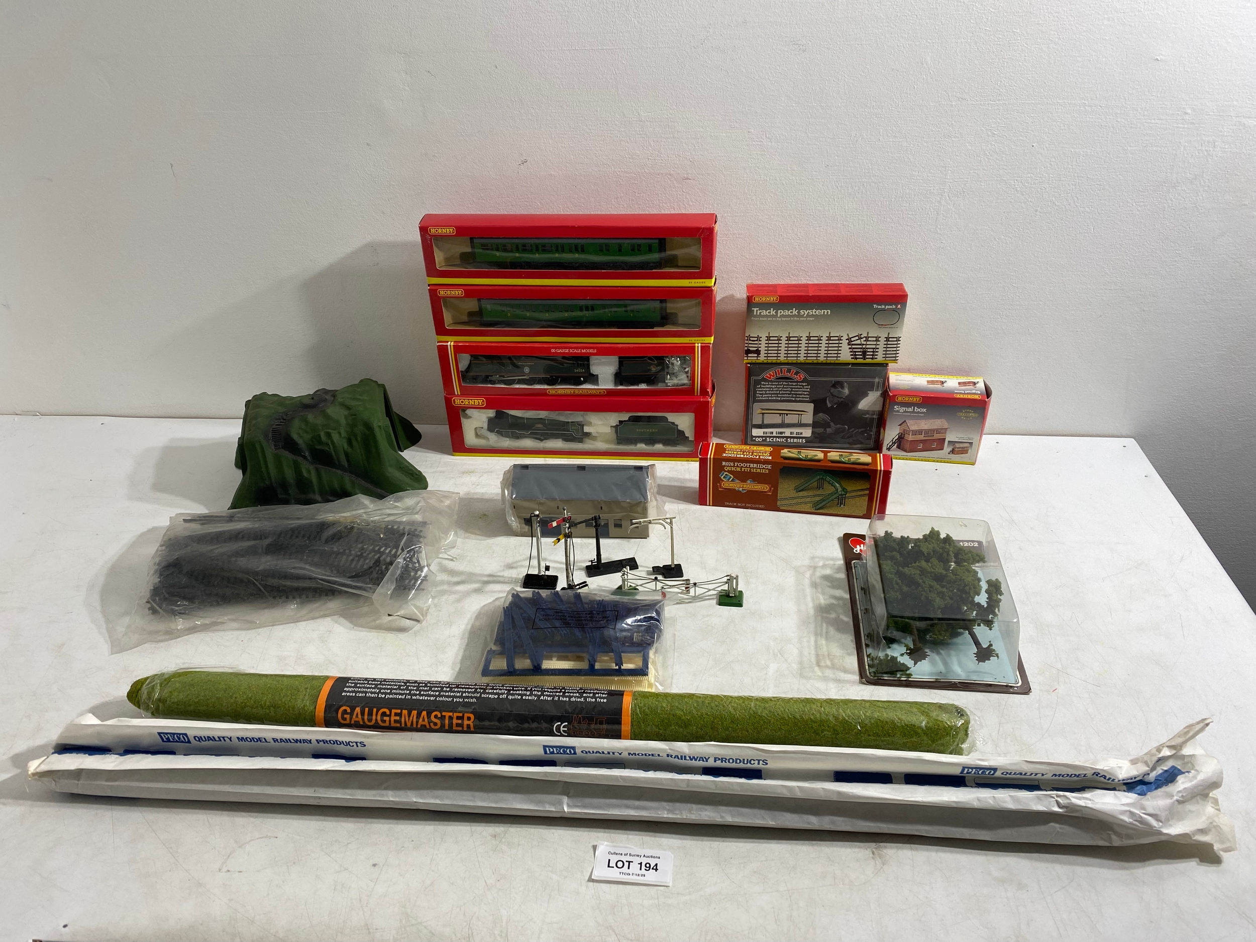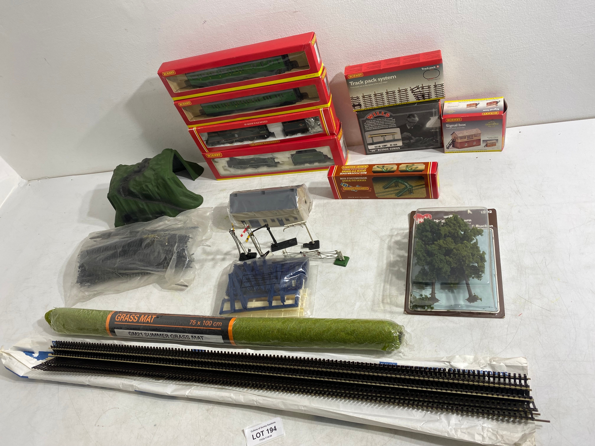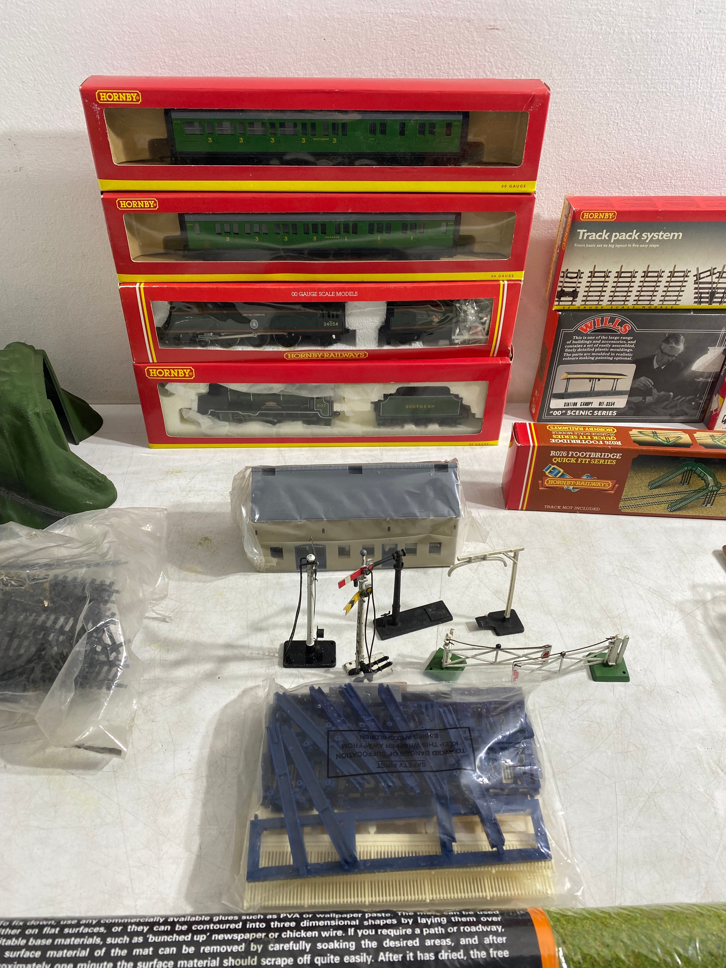 Hornby R4009A SR Composite Coach (malachite) "5540, R4008A SR Brake 3rd Coach (Malachite) "3570", R.310 BR4-6 2 Loco Battle of Britain class "Lord Beaverbrook" and R2124 SR 4-4-0 schools class V Locomotive "Dulwich" trains, Hornby Track pack system A, R076 Footbridge Quick fit series and Wills "00" Scenic series Station Canopy SS54 and accessories Including GM21 75x100cm Summer Grass matt and track