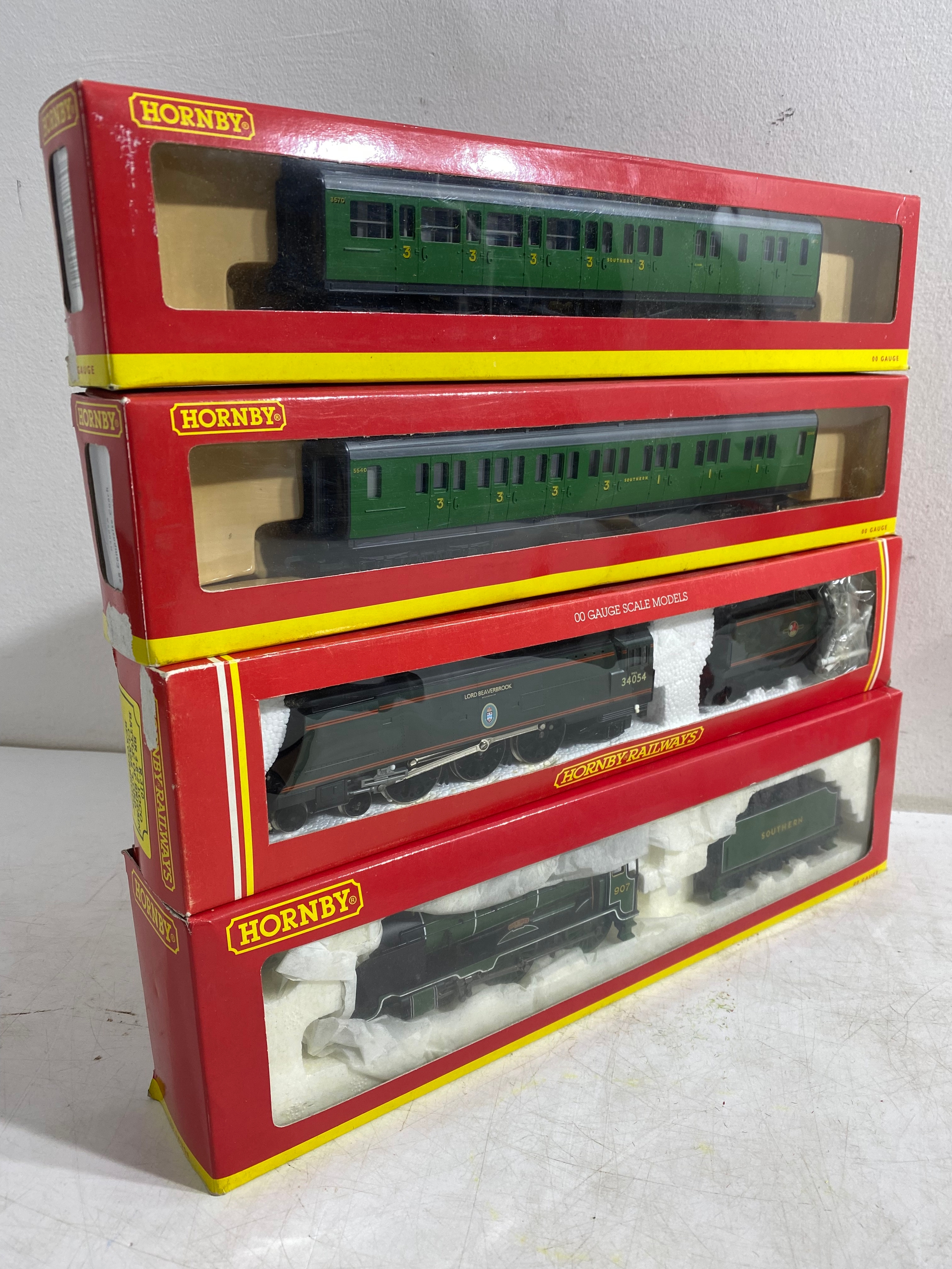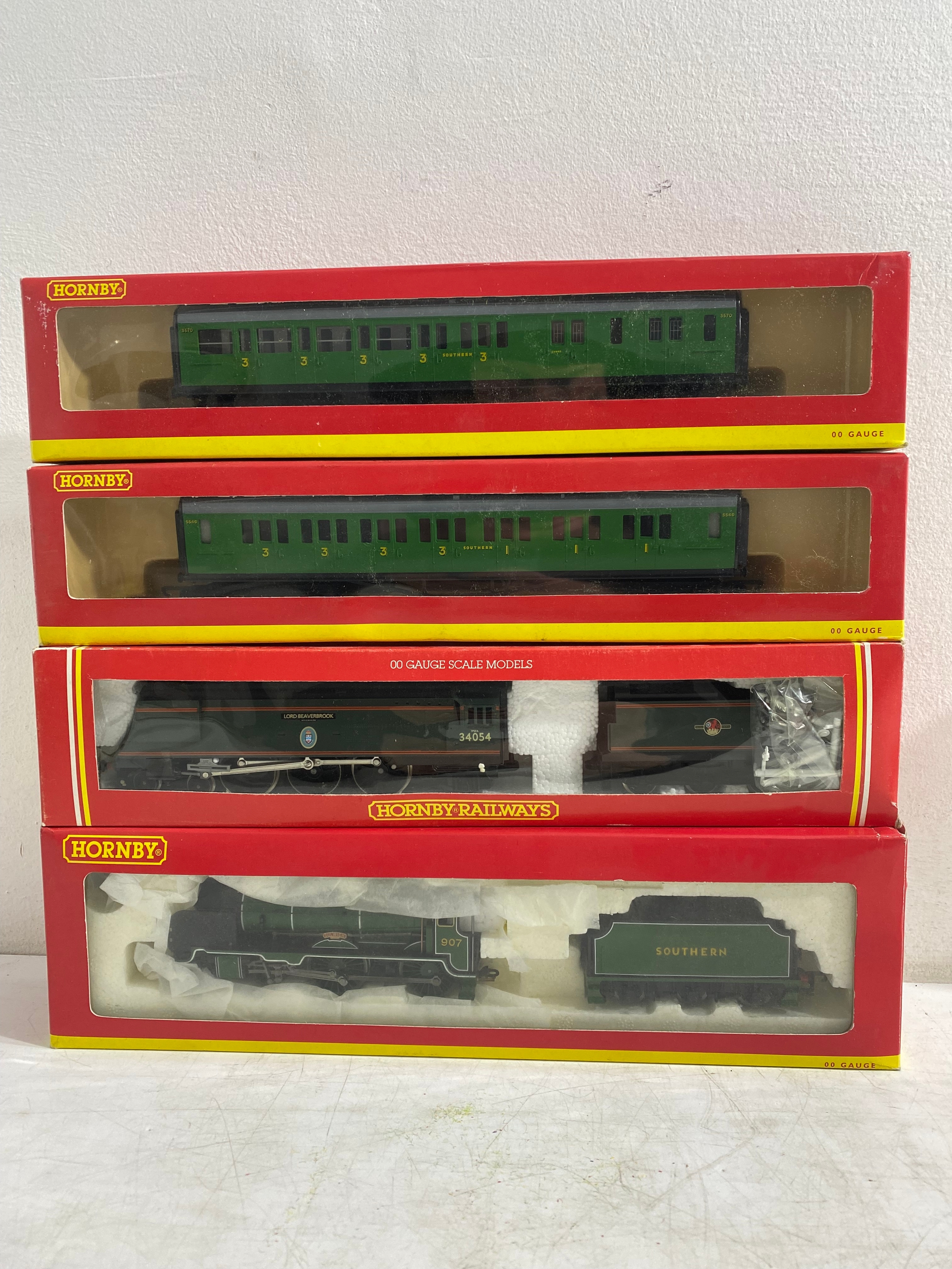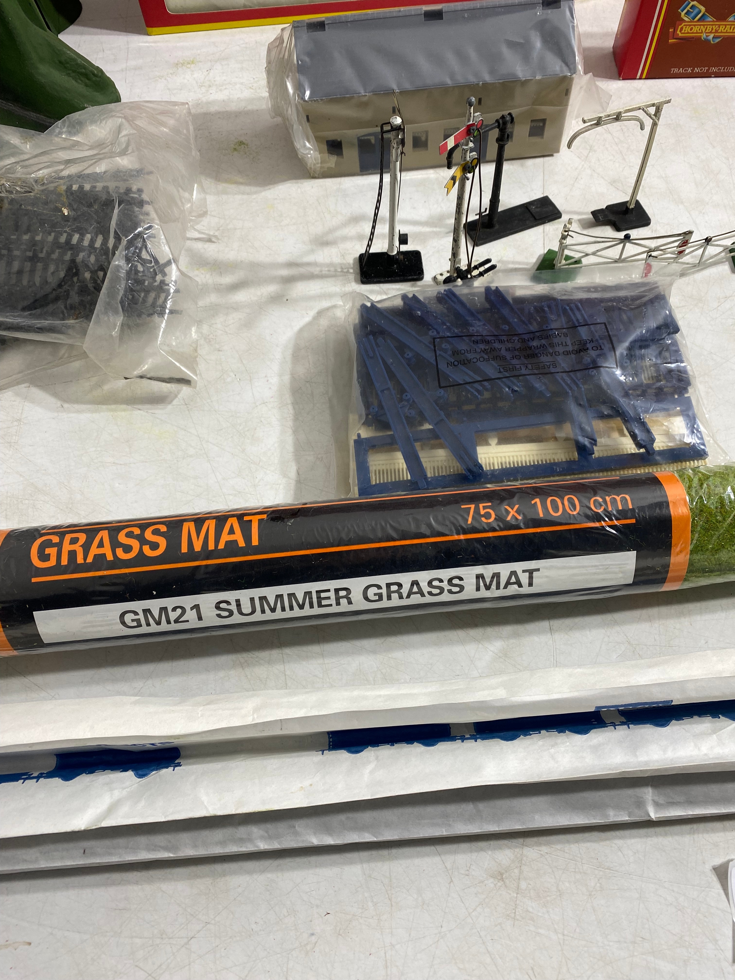 Hornby R4009A SR Composite Coach (malachite) "5540, R4008A SR Brake 3rd Coach (Malachite) "3570", R.310 BR4-6 2 Loco Battle of Britain class "Lord Beaverbrook" and R2124 SR 4-4-0 schools class V Locomotive "Dulwich" trains, Hornby Track pack system A, R076 Footbridge Quick fit series and Wills "00" Scenic series Station Canopy SS54 and accessories Including GM21 75x100cm Summer Grass matt and track