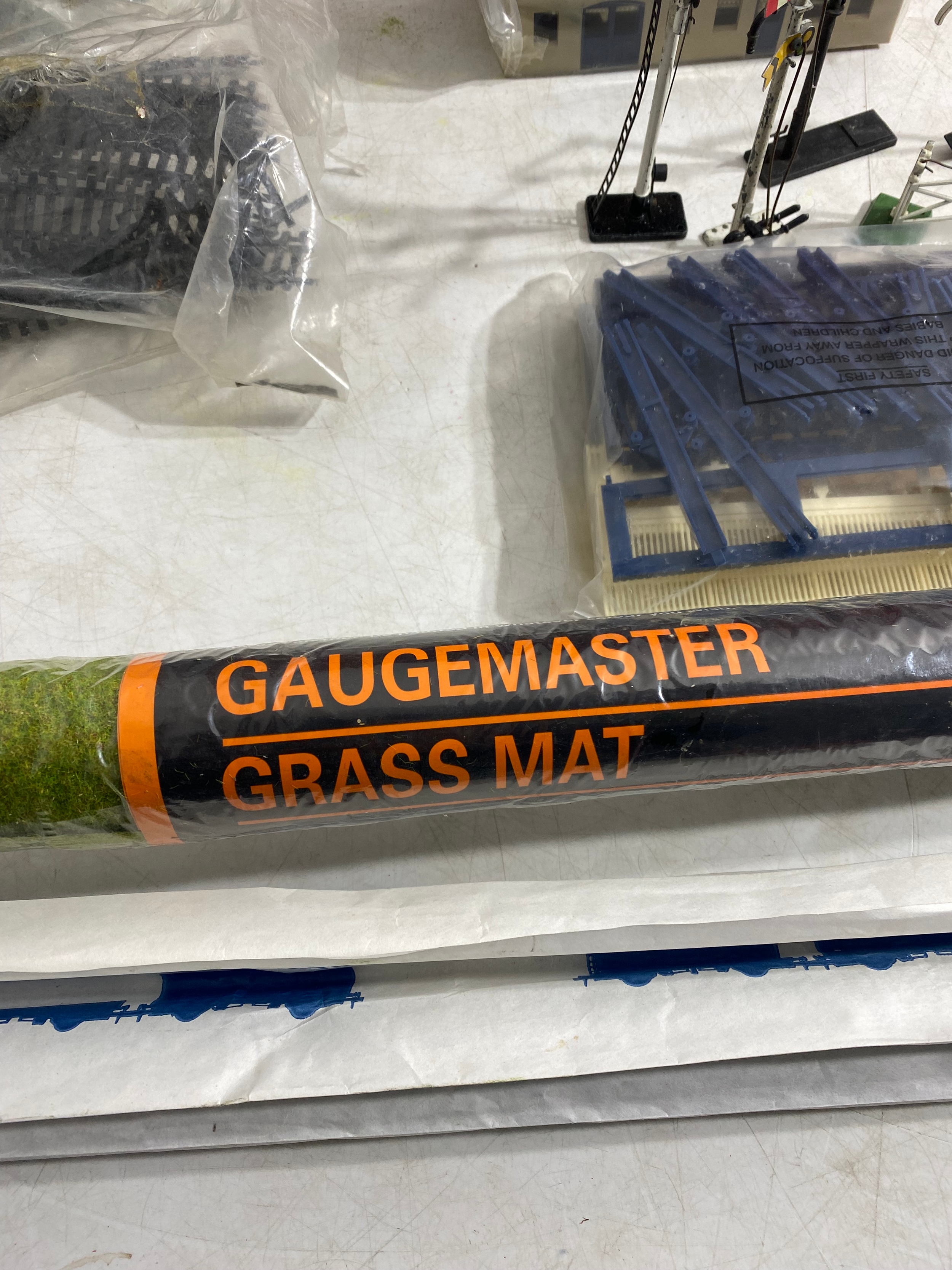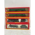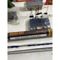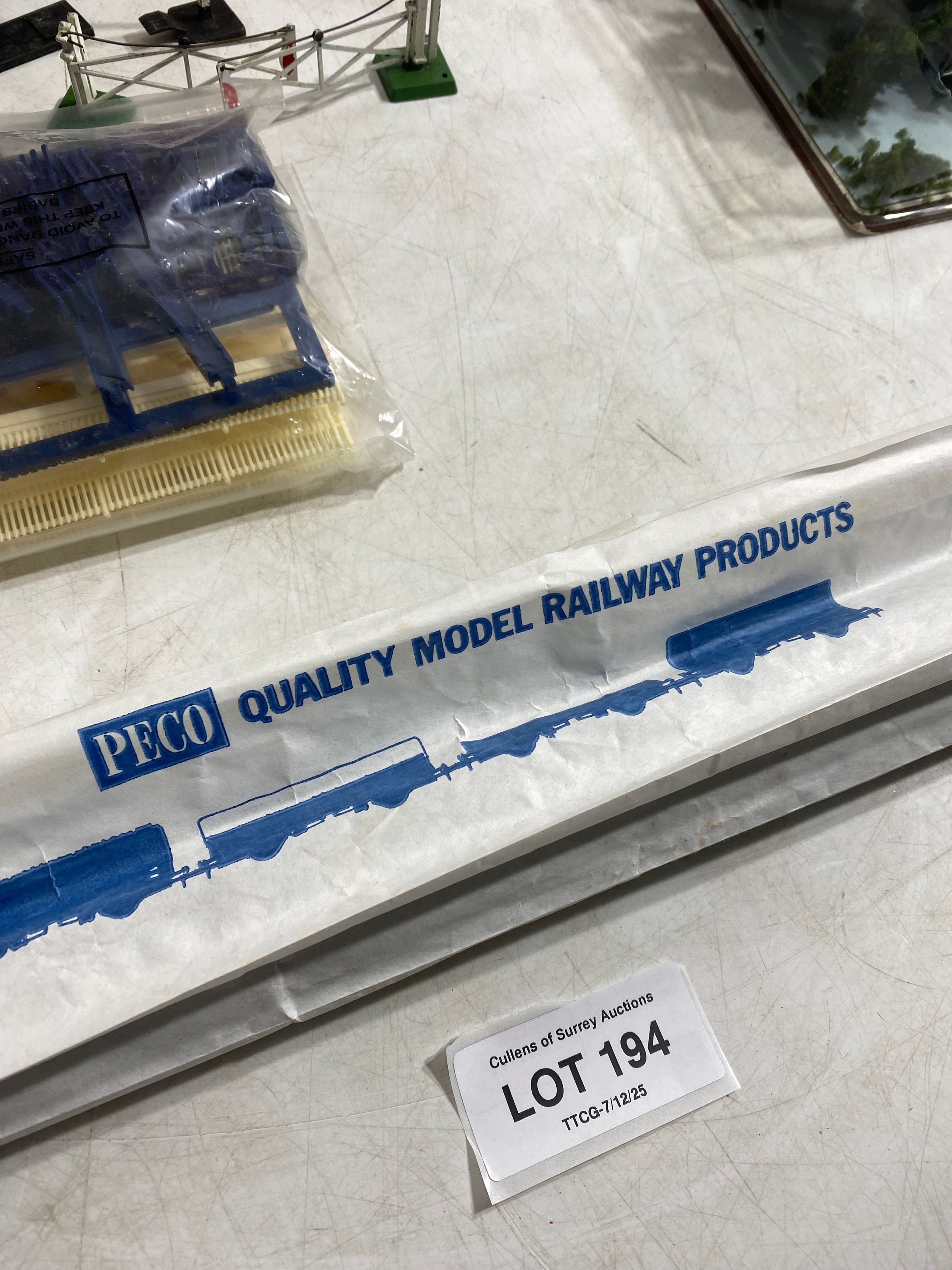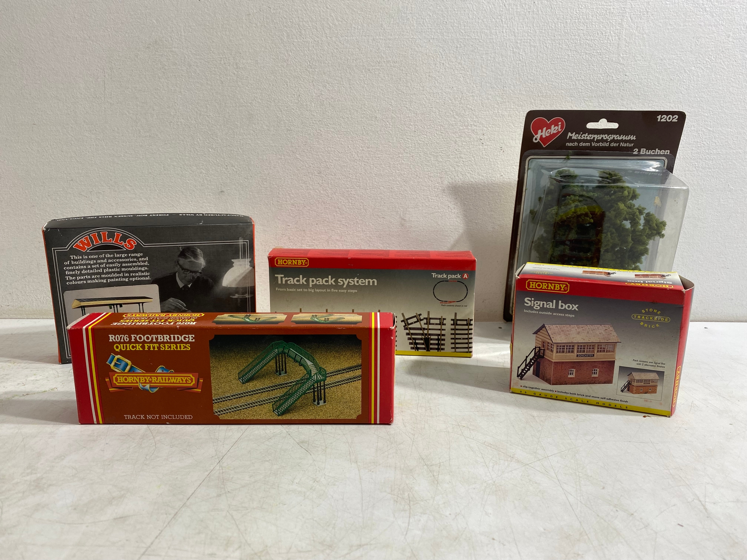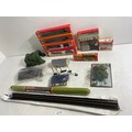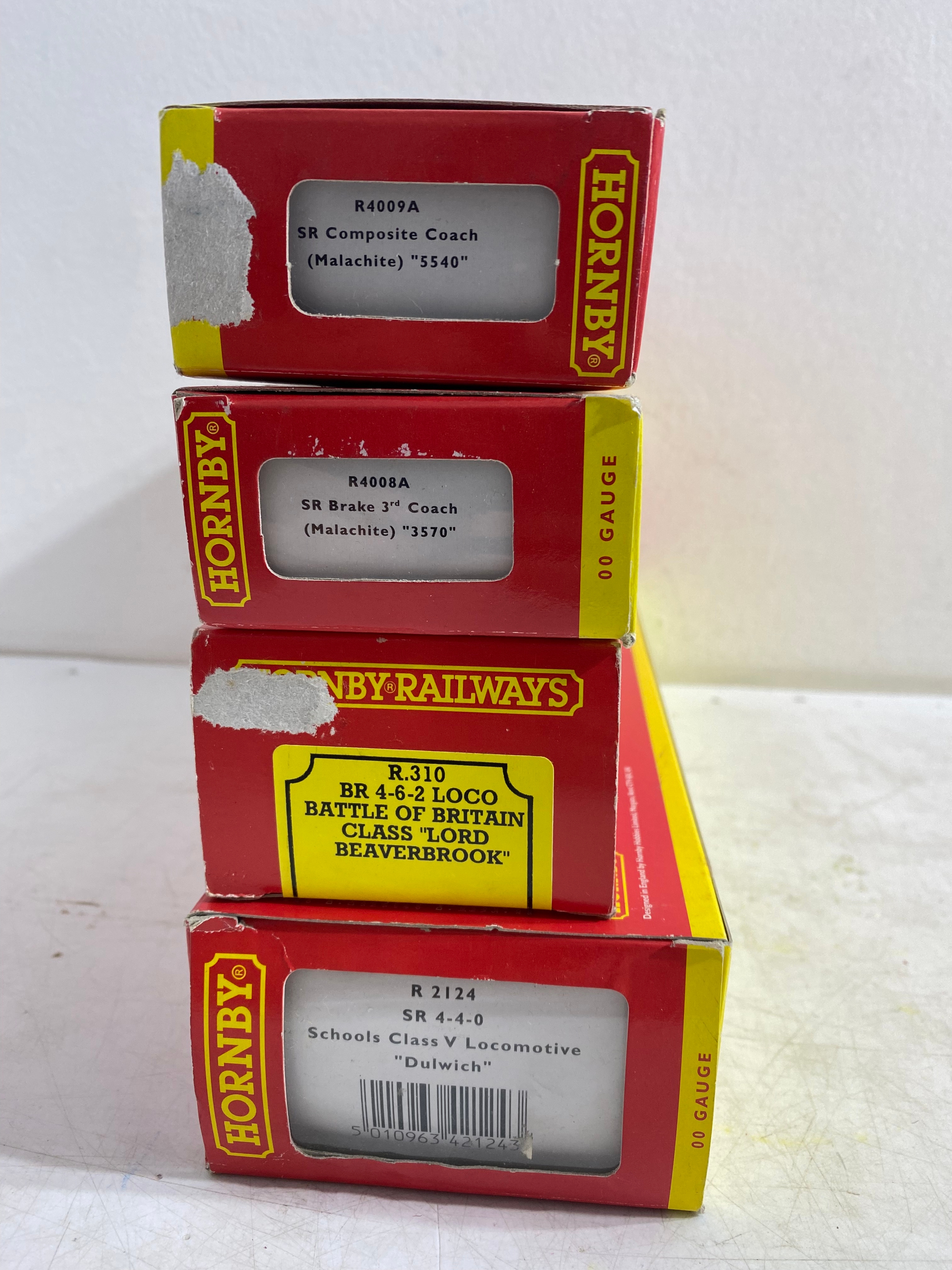 Hornby R4009A SR Composite Coach (malachite) "5540, R4008A SR Brake 3rd Coach (Malachite) "3570", R.310 BR4-6 2 Loco Battle of Britain class "Lord Beaverbrook" and R2124 SR 4-4-0 schools class V Locomotive "Dulwich" trains, Hornby Track pack system A, R076 Footbridge Quick fit series and Wills "00" Scenic series Station Canopy SS54 and accessories Including GM21 75x100cm Summer Grass matt and track