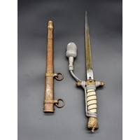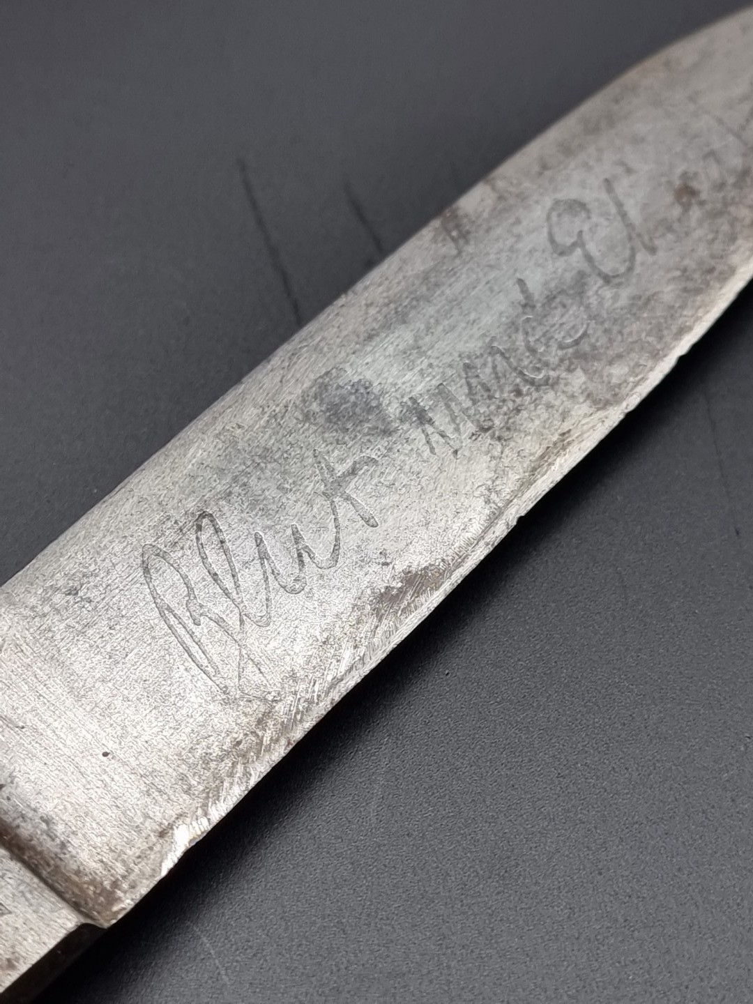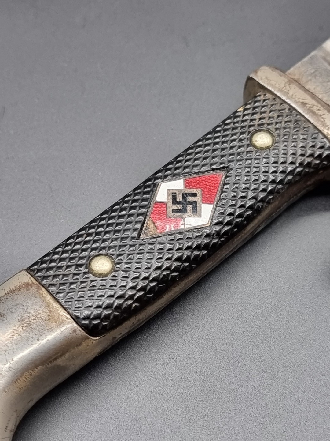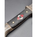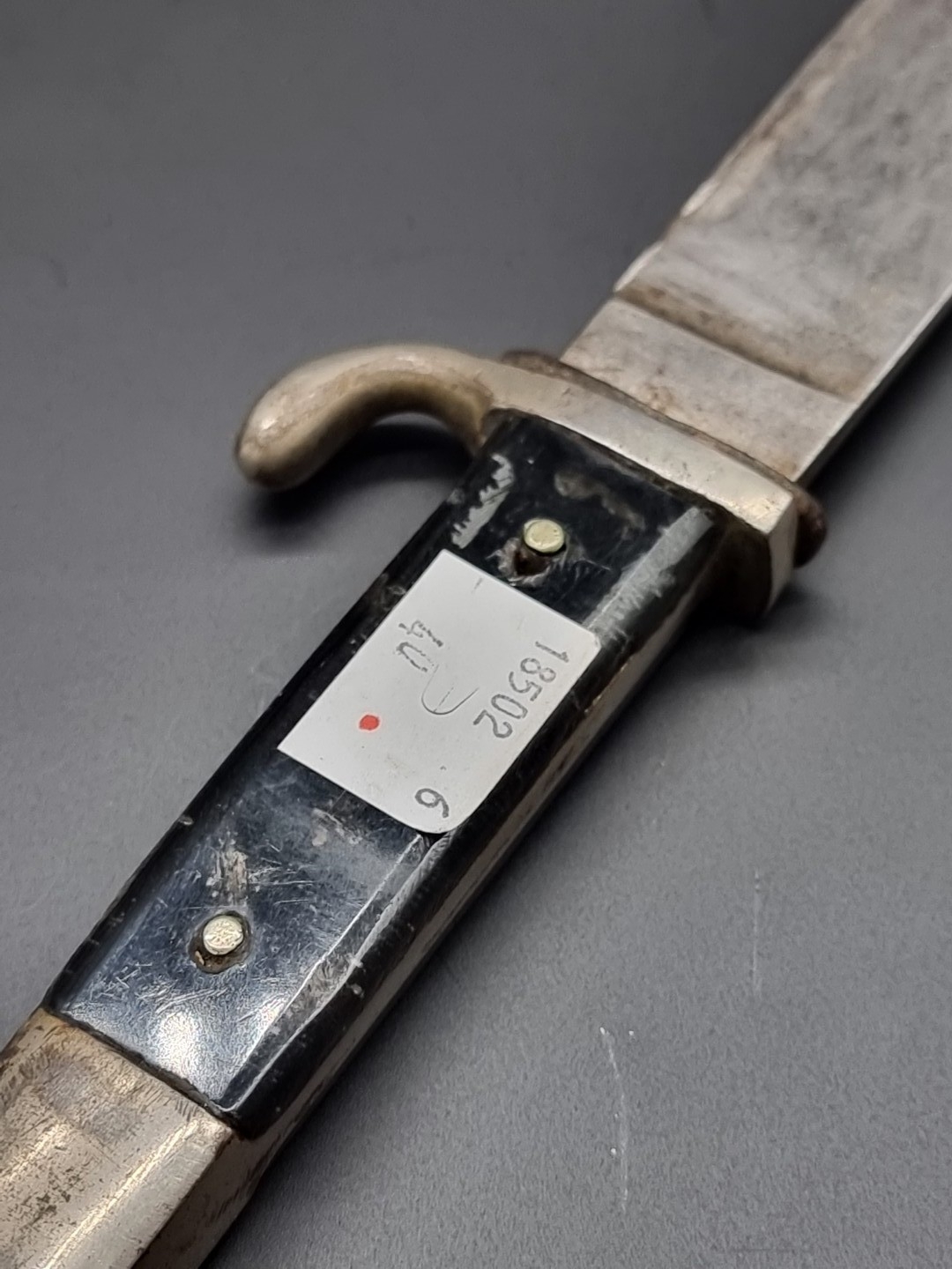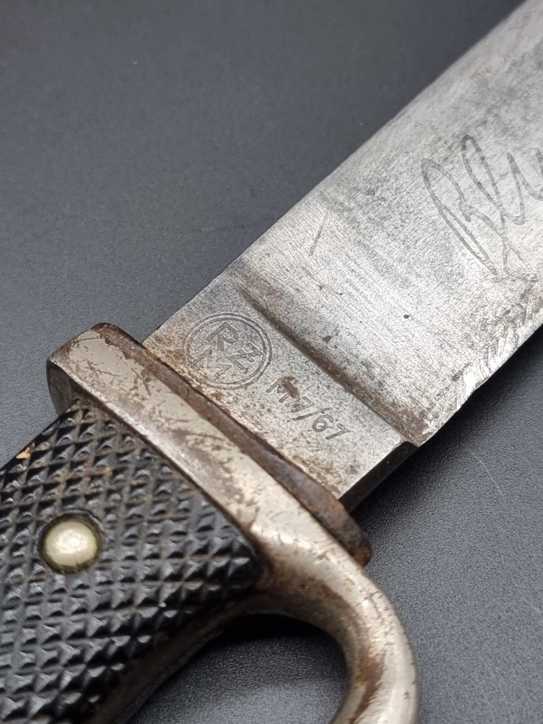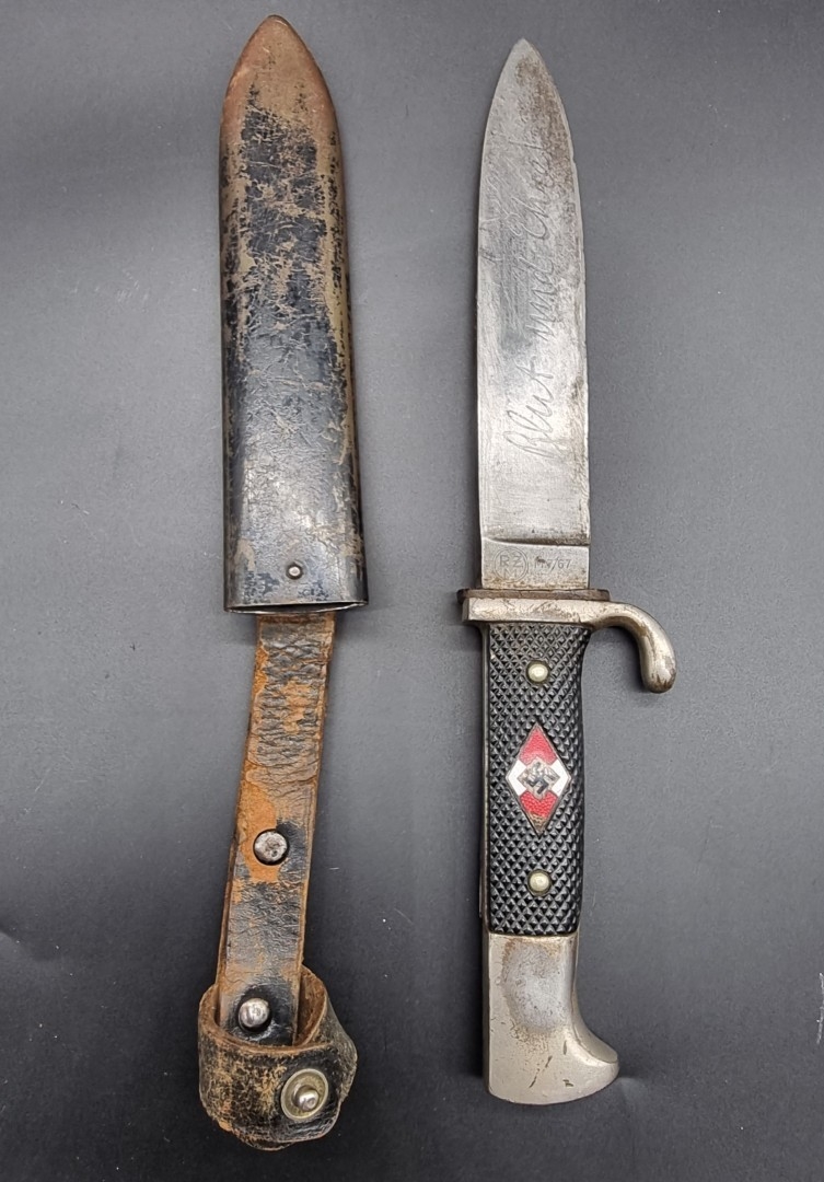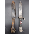 A German Hitler Youth knife and scabbard, by Gottlieb Hammesfahr, Solingen-Grafrath, the 14.8cm blade engraved 'Blut und Ehre!', with makers marks and RZM code.
