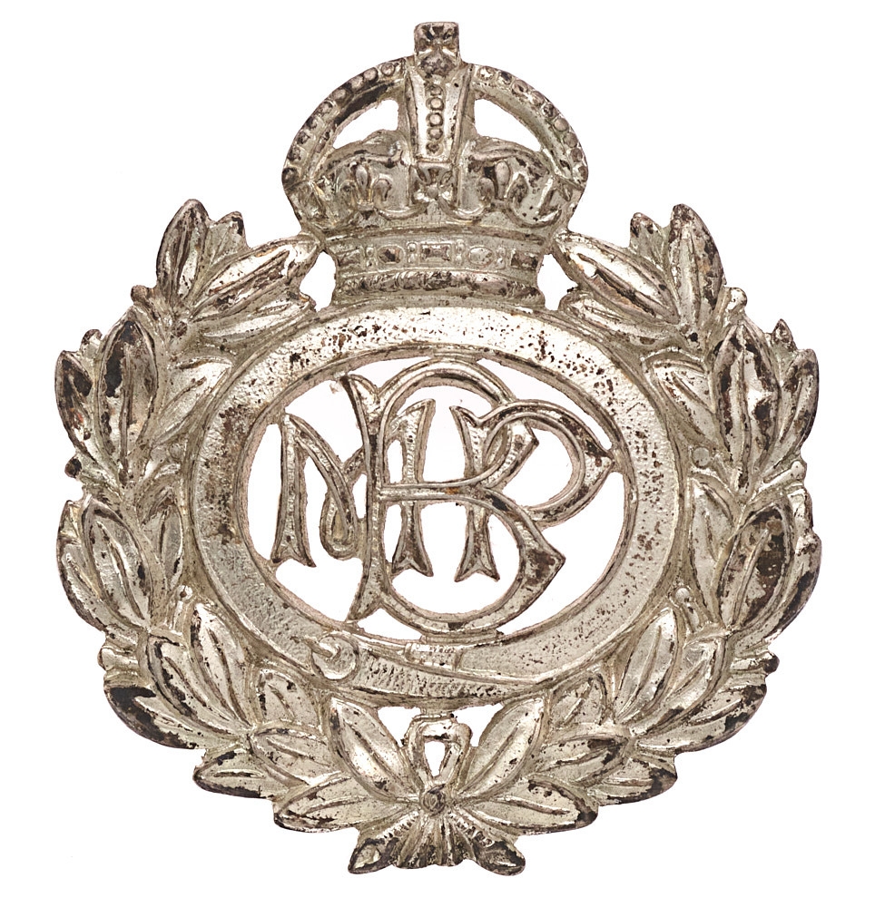 Mandaly Battalion Burma Military Police pouch badge c. 1930's. Good scarce British made die-stamped silvered crowned oval blank strap resting in laurel sprays; BMP monogram to voided centre. Screw posts. VGC