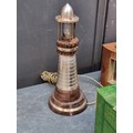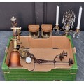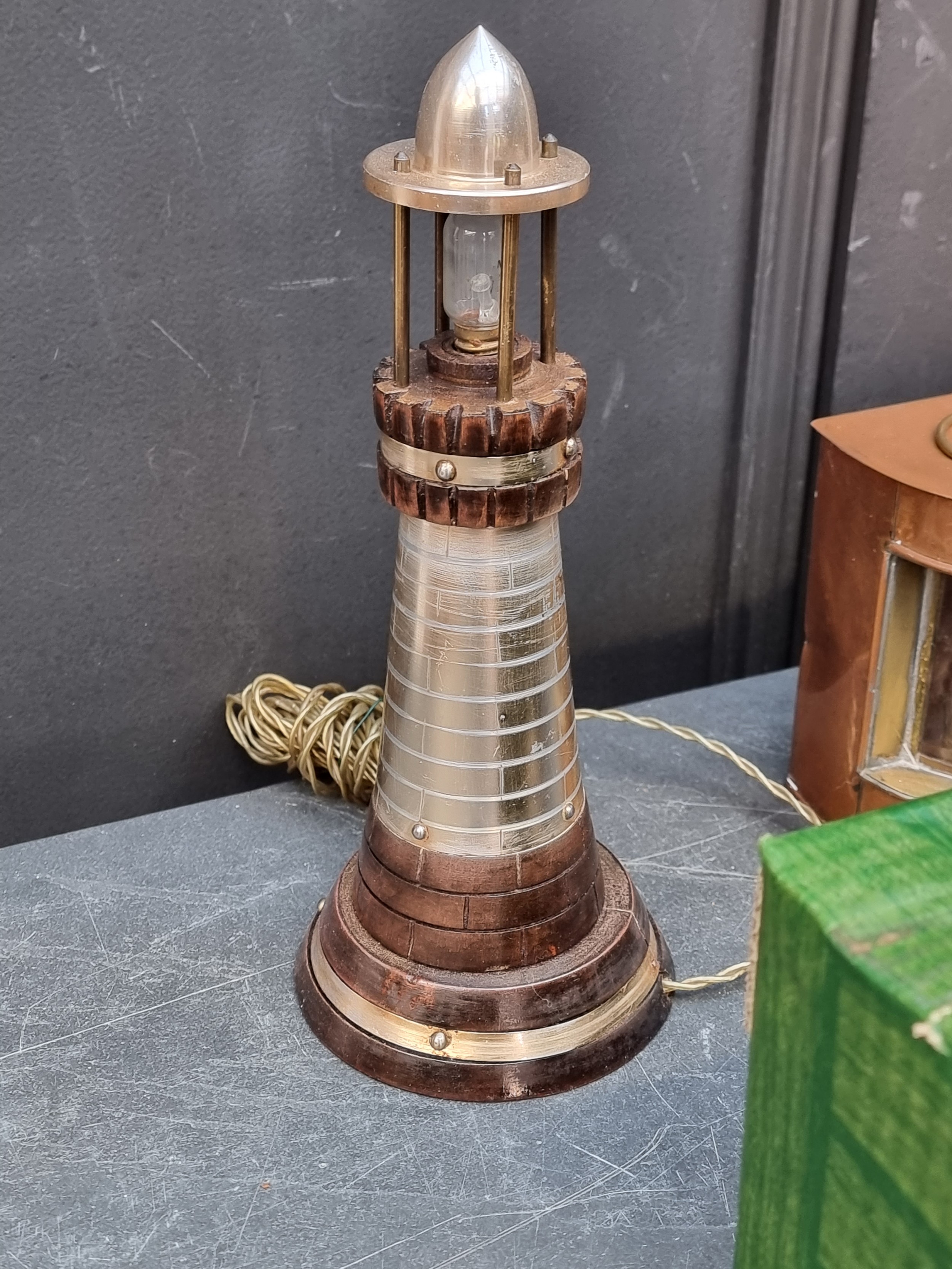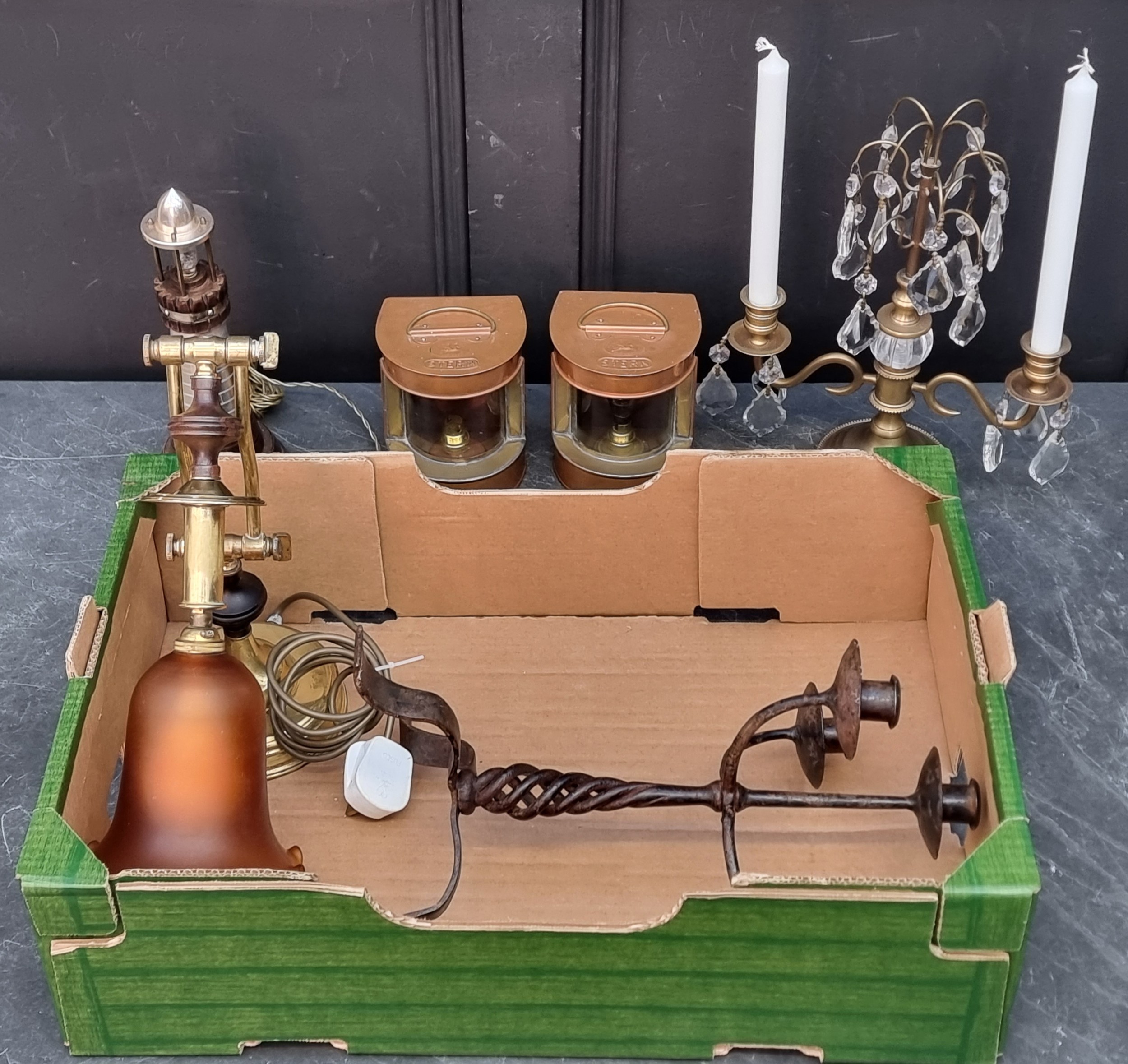 A steel four branch tripod candelabrum, 39cm high; together with a small reproduction pair of copper ships 'Stern' lanterns, 18cm high; and three others. (6)