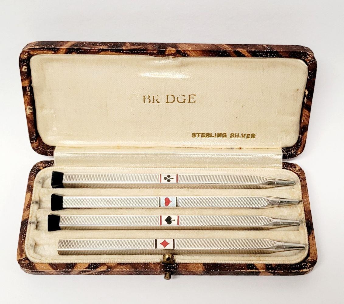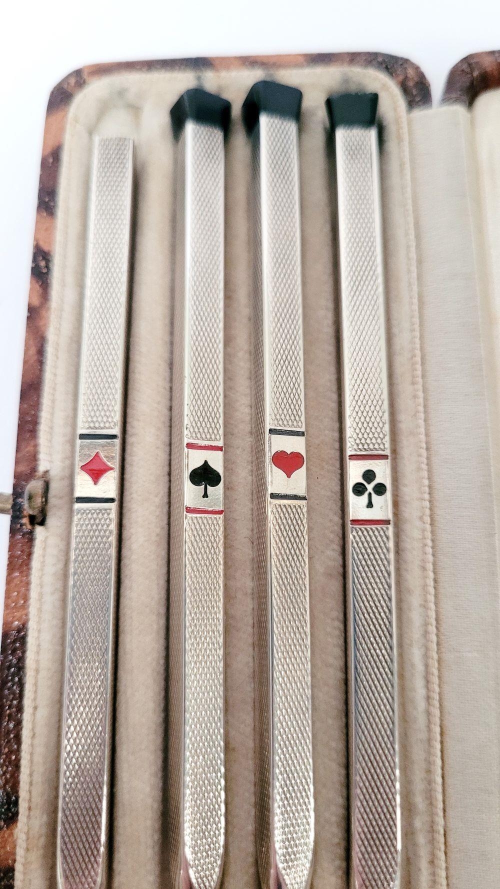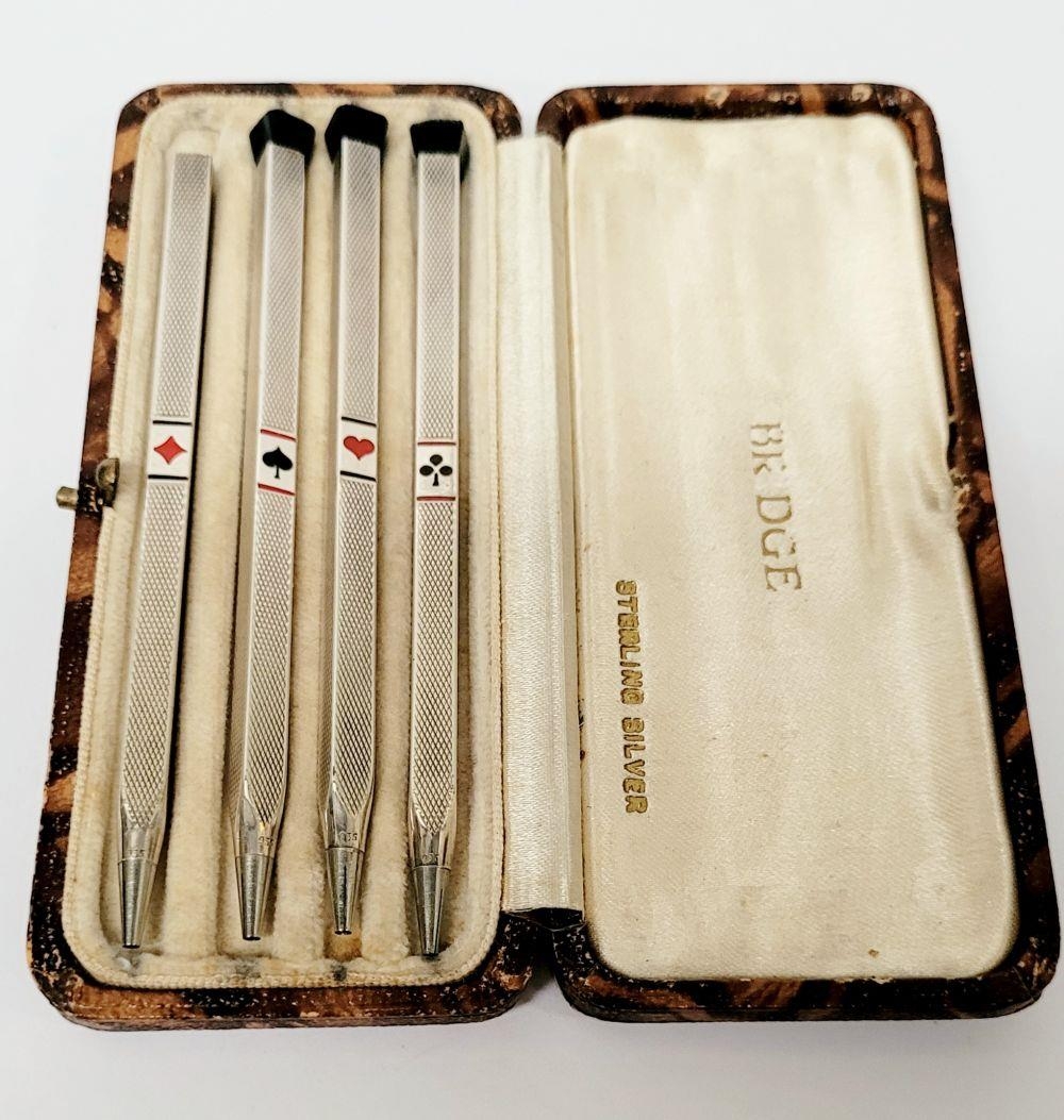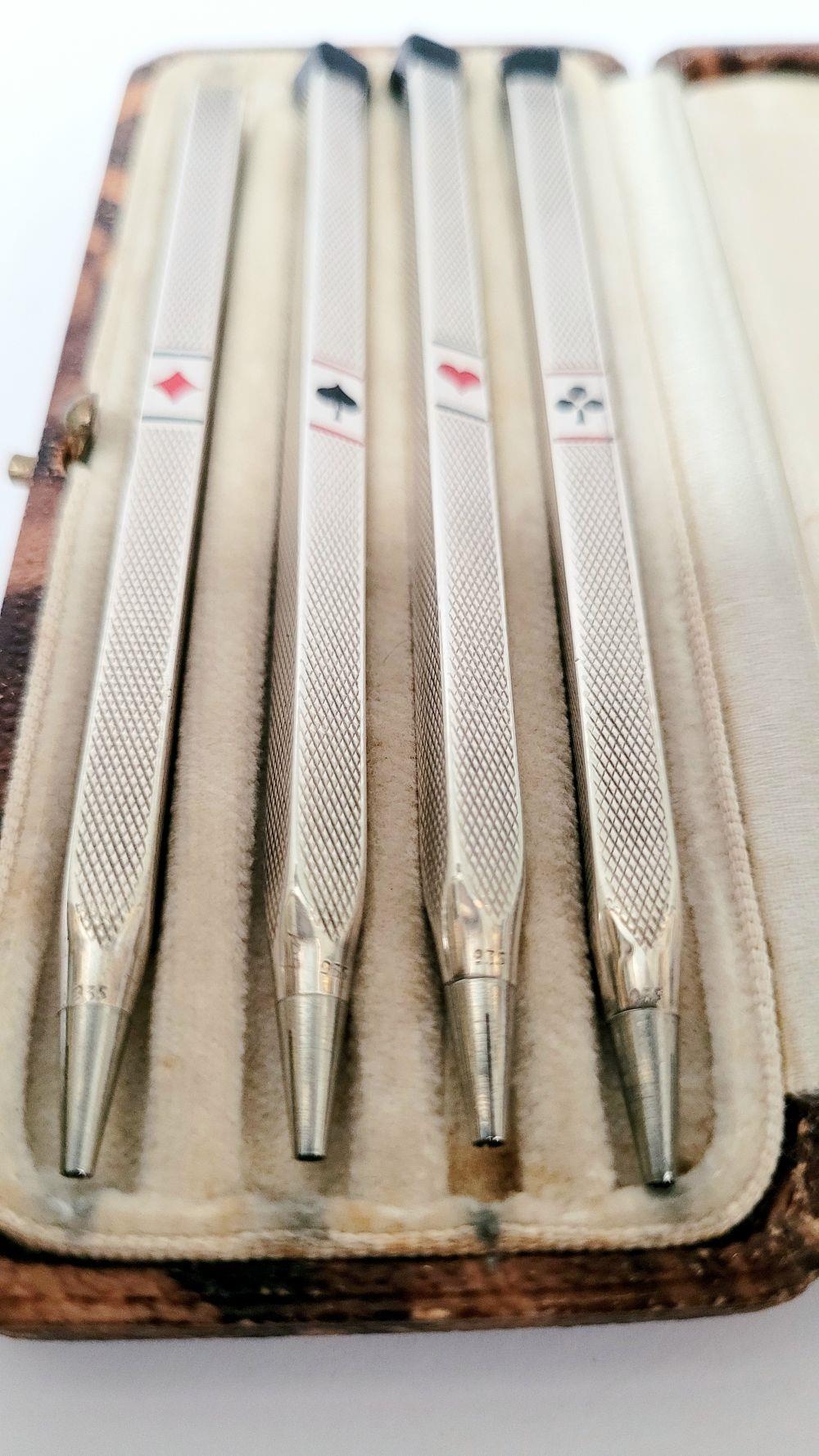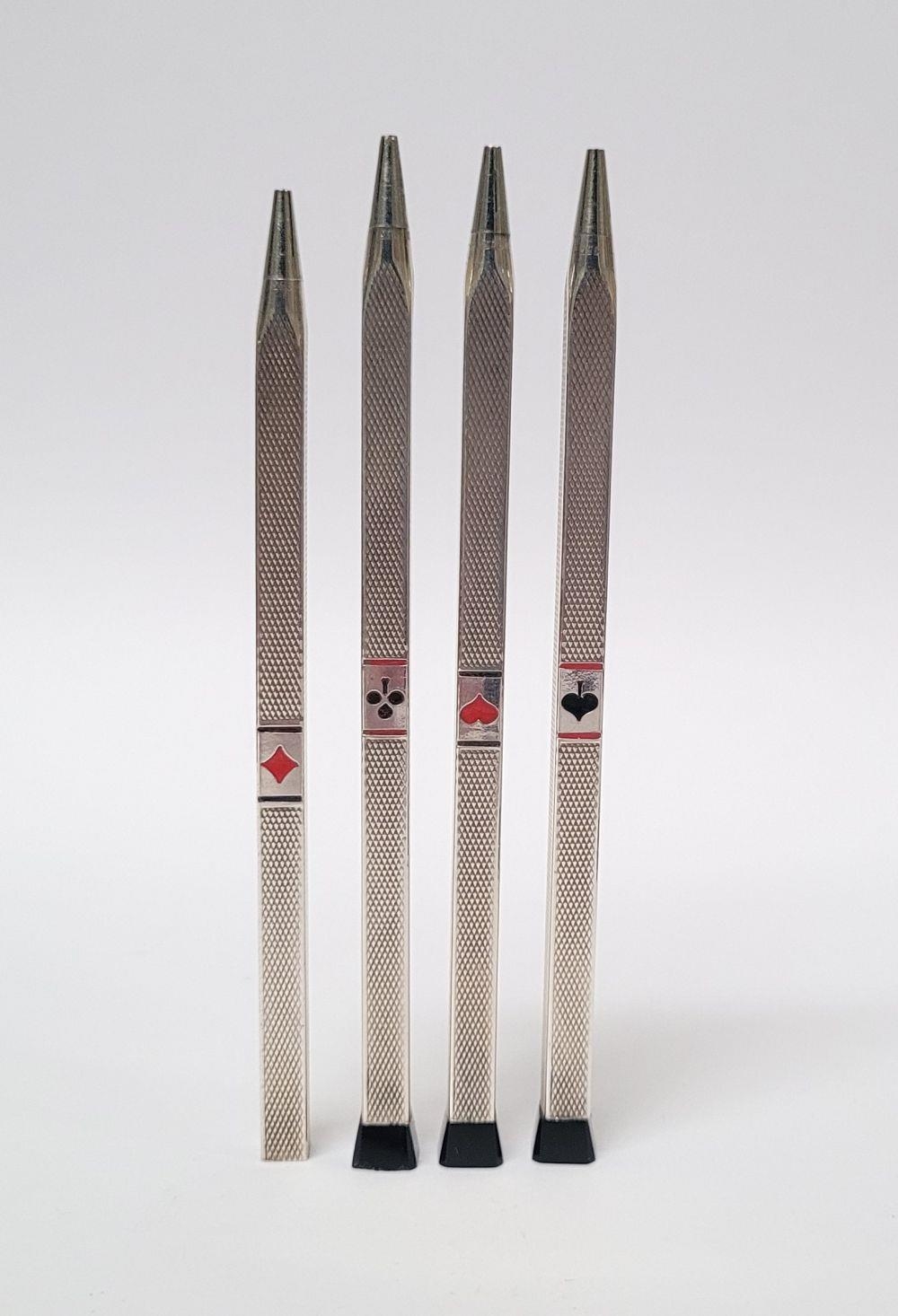 A CASED SET OF SILVER BRIDGE PENCIL HOLDERS, each marked 935 ‘foreign’, (935: Argentium silver). A lovely set for any bridge player; each pencil is decorated with a different suit – clubs, spades, hearts & diamonds. Each pencil holder: 10cm long. Case: 12.5 x 5cm