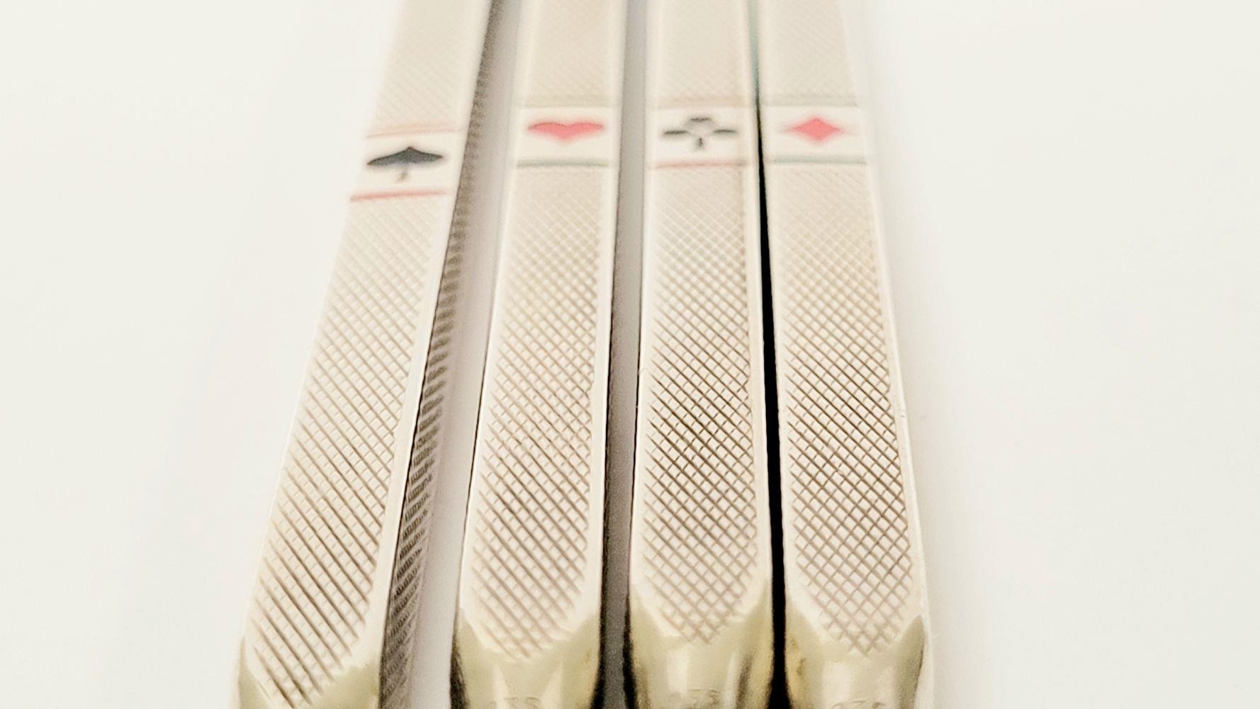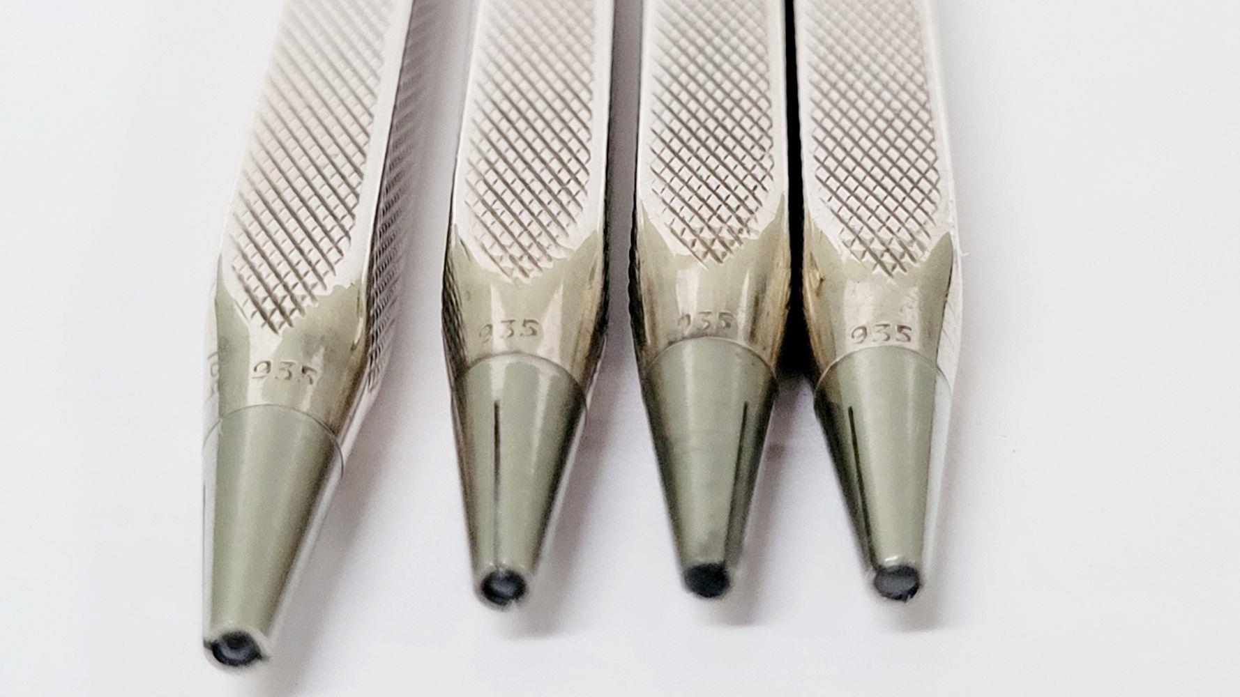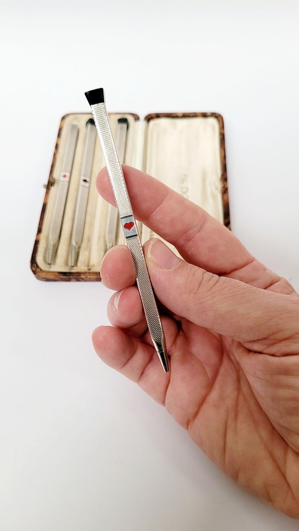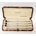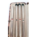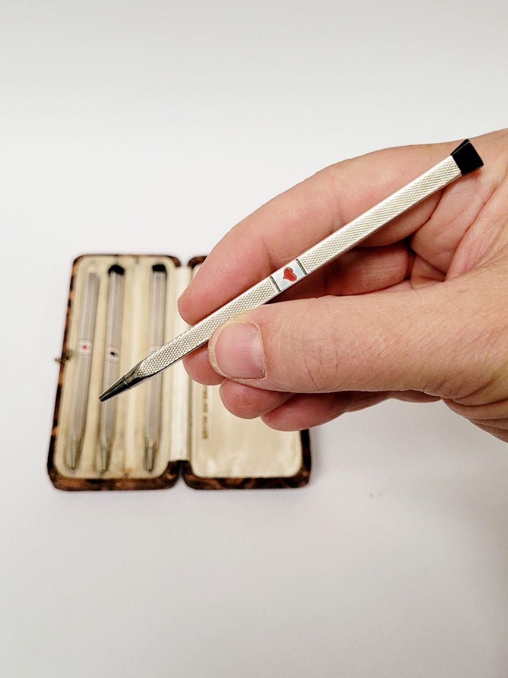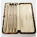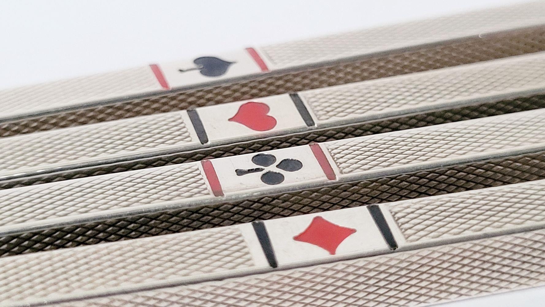 A CASED SET OF SILVER BRIDGE PENCIL HOLDERS, each marked 935 ‘foreign’, (935: Argentium silver). A lovely set for any bridge player; each pencil is decorated with a different suit – clubs, spades, hearts & diamonds. Each pencil holder: 10cm long. Case: 12.5 x 5cm