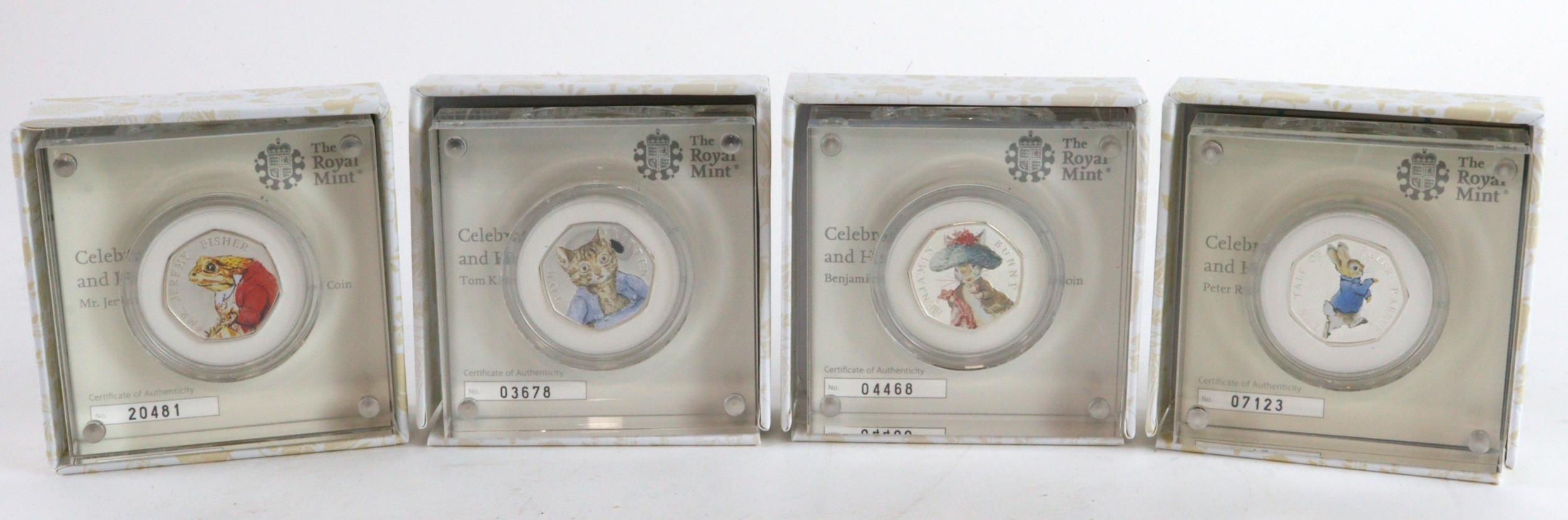 GB Royal Mint (4): Beatrix Potter colourised silver proof 50p's 2017: Peter Rabbit, Benjamin Bunny, Tom Kitten, and Jeremy Fisher, FDC cased with certs and sleeves.