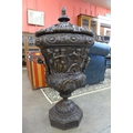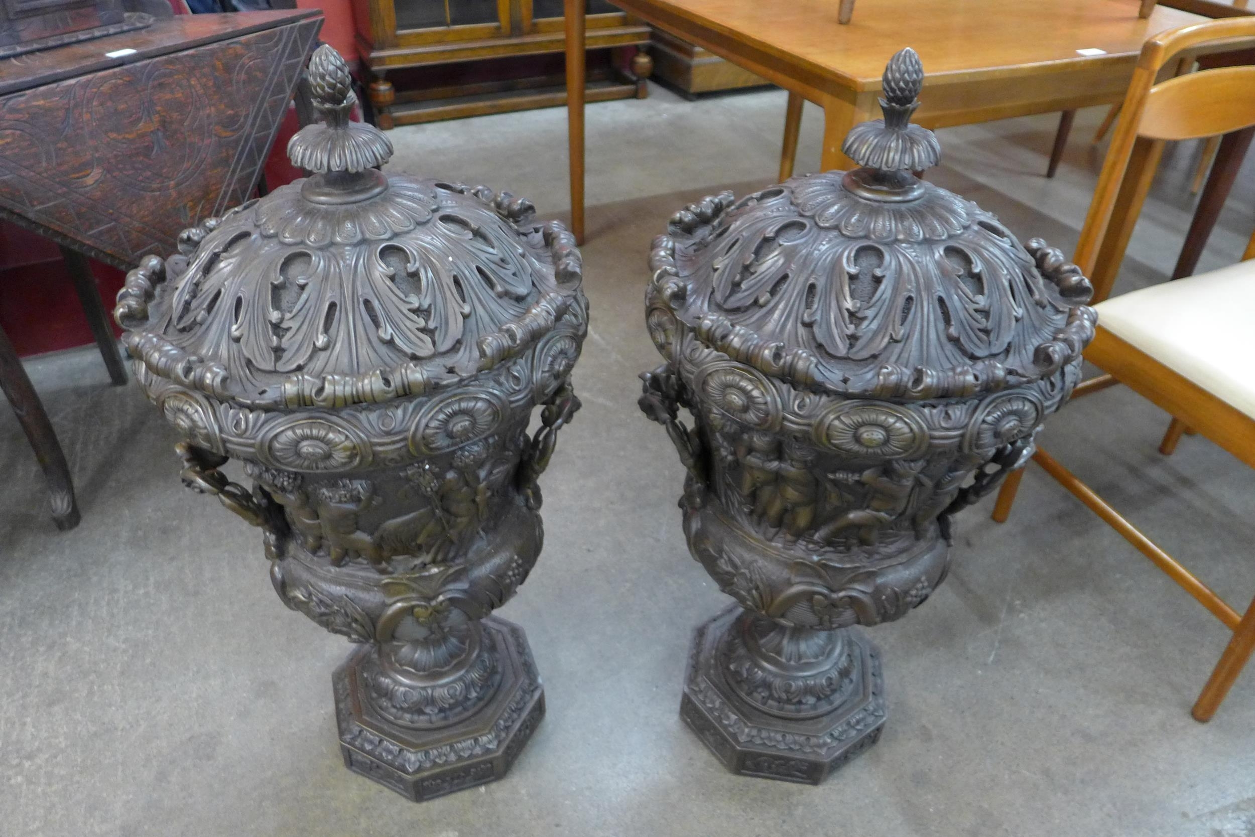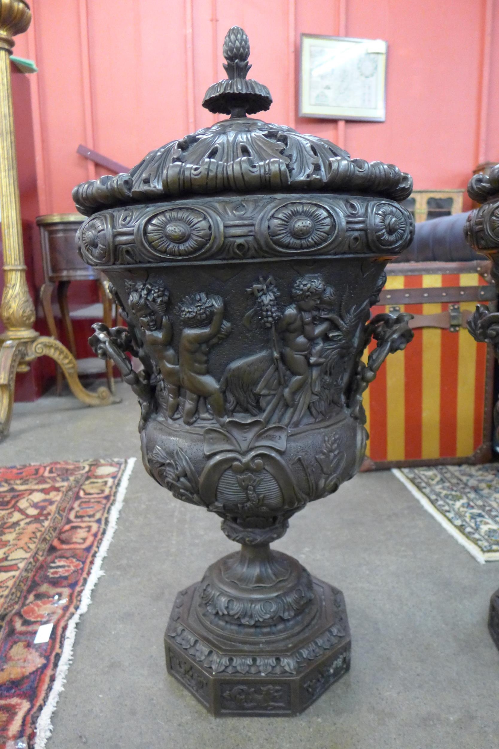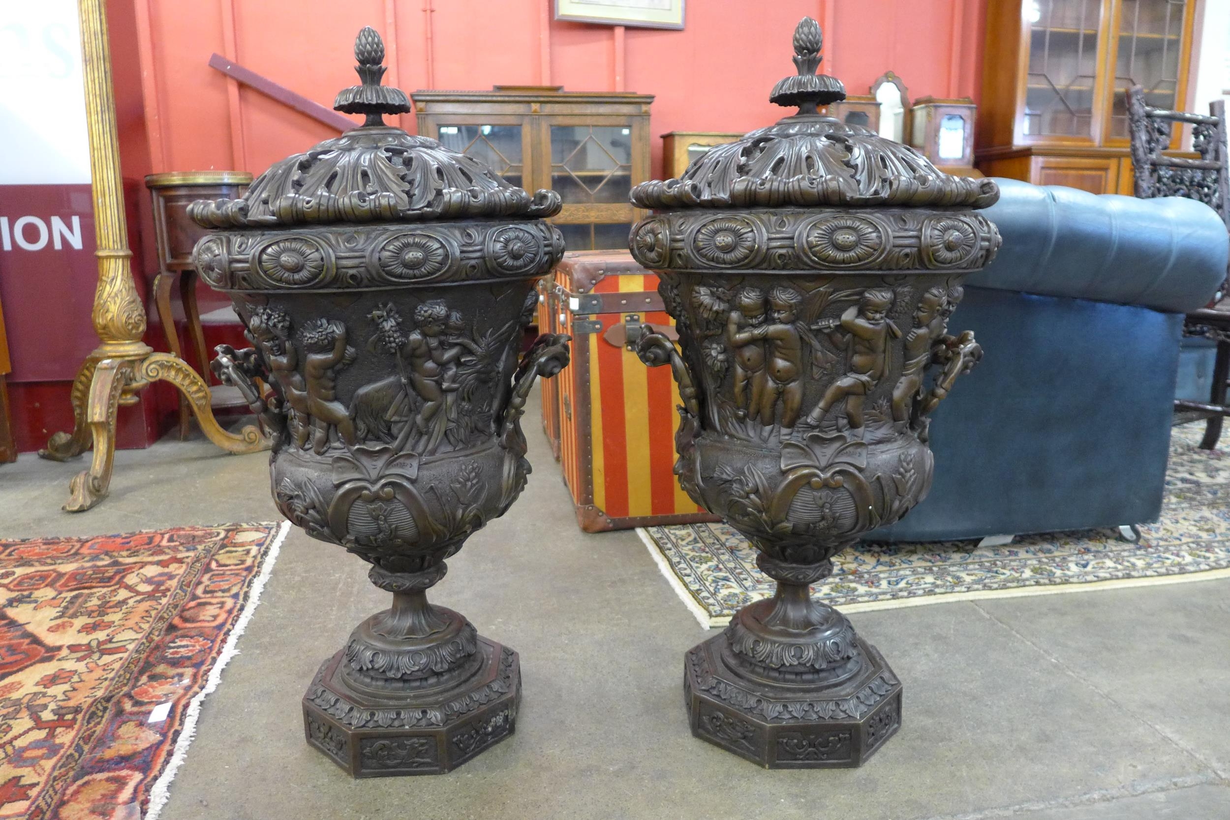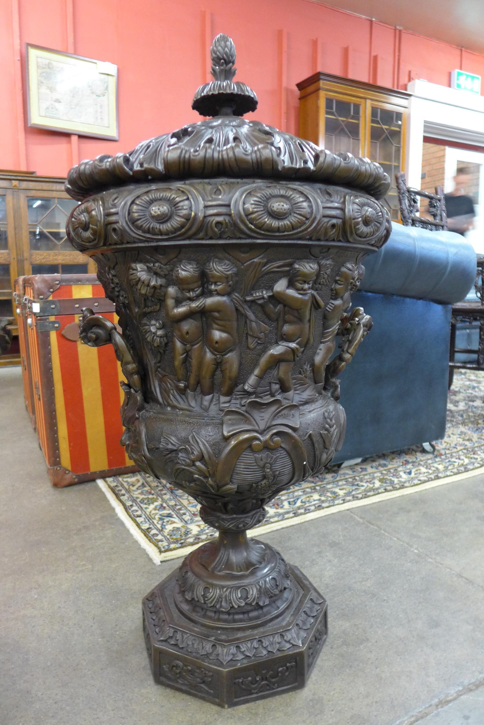 A pair of large Italian style bronze campana shaped urns and covers, cast with Bacchanalian cherubs