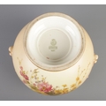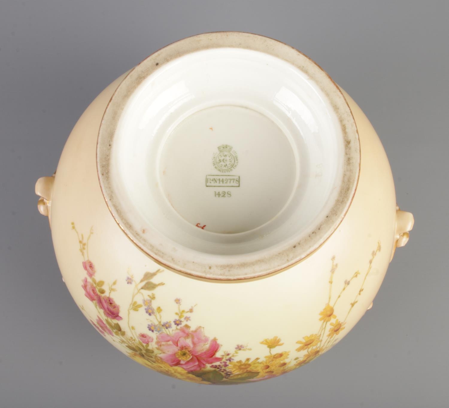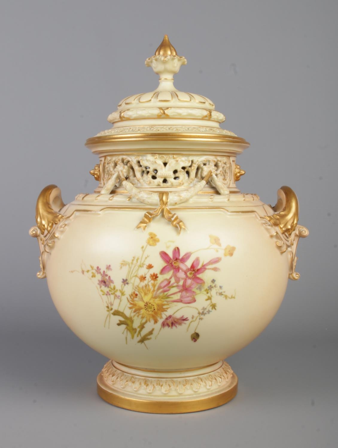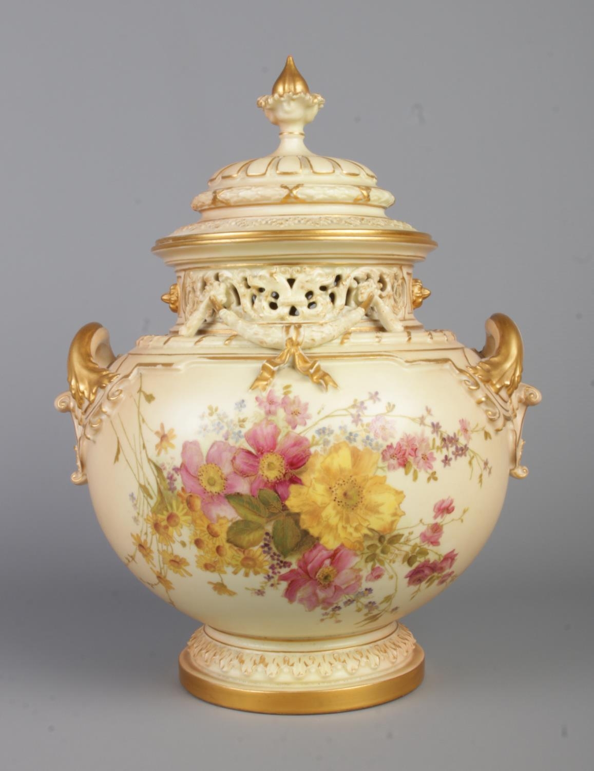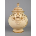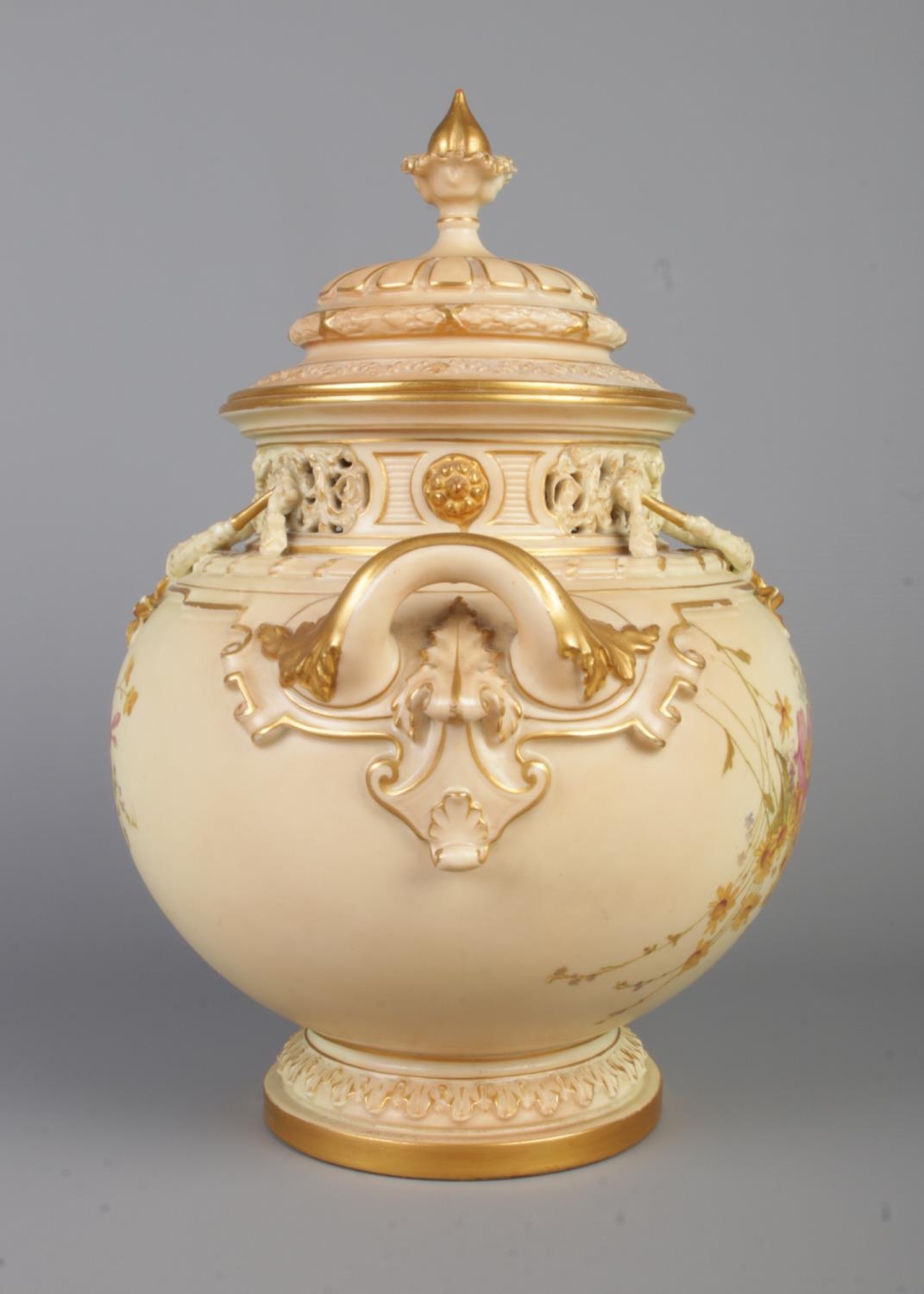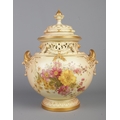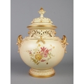 An early 20th century Royal Worcester blush ivory bow lidded potpourri urn, decorated with floral sprays. Shape number 1428, registered number 142778. Height 32cm.