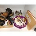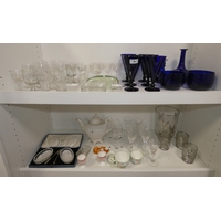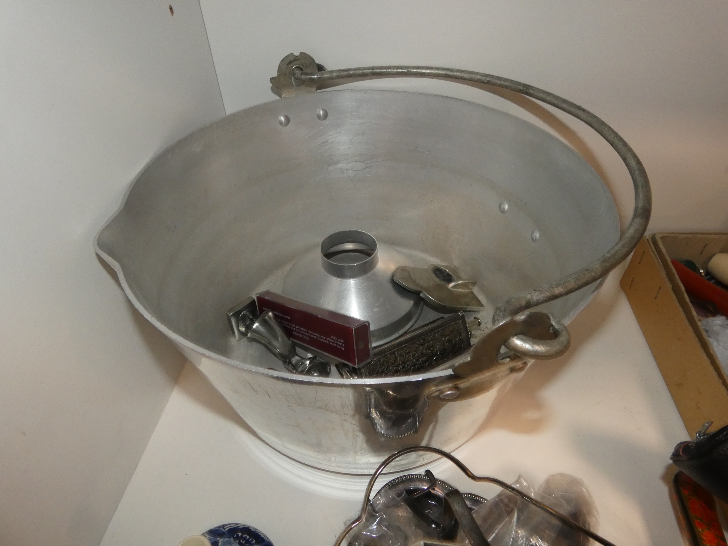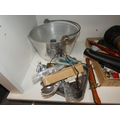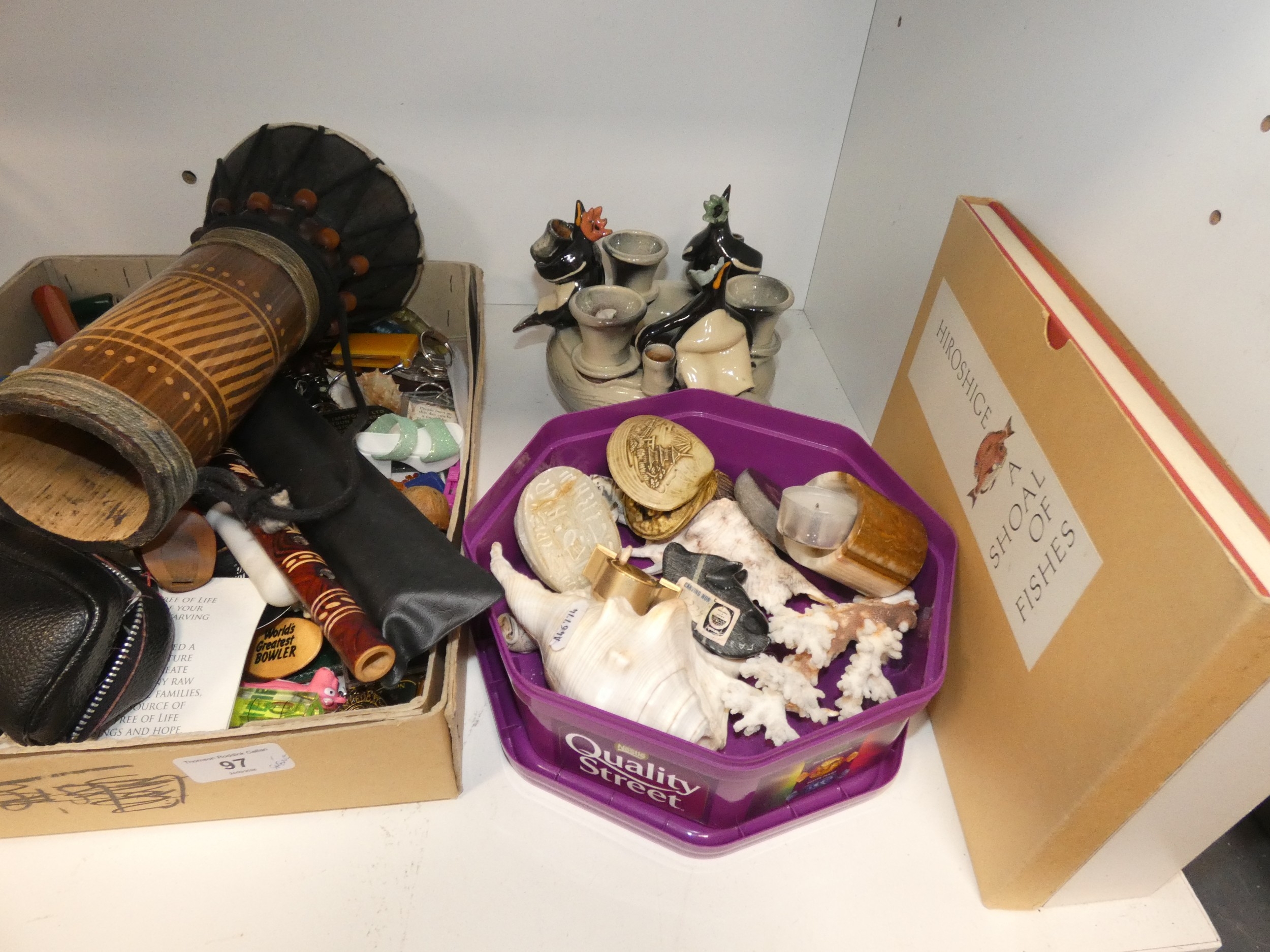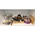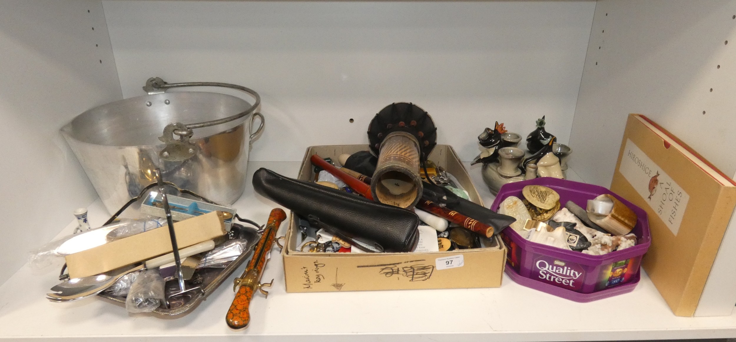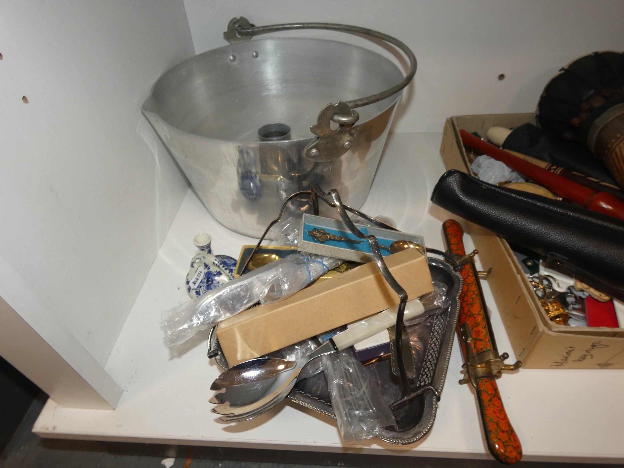 Shelf lot of sundries to include sea shells, key rings, jam pan, silver plated wares etc.