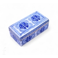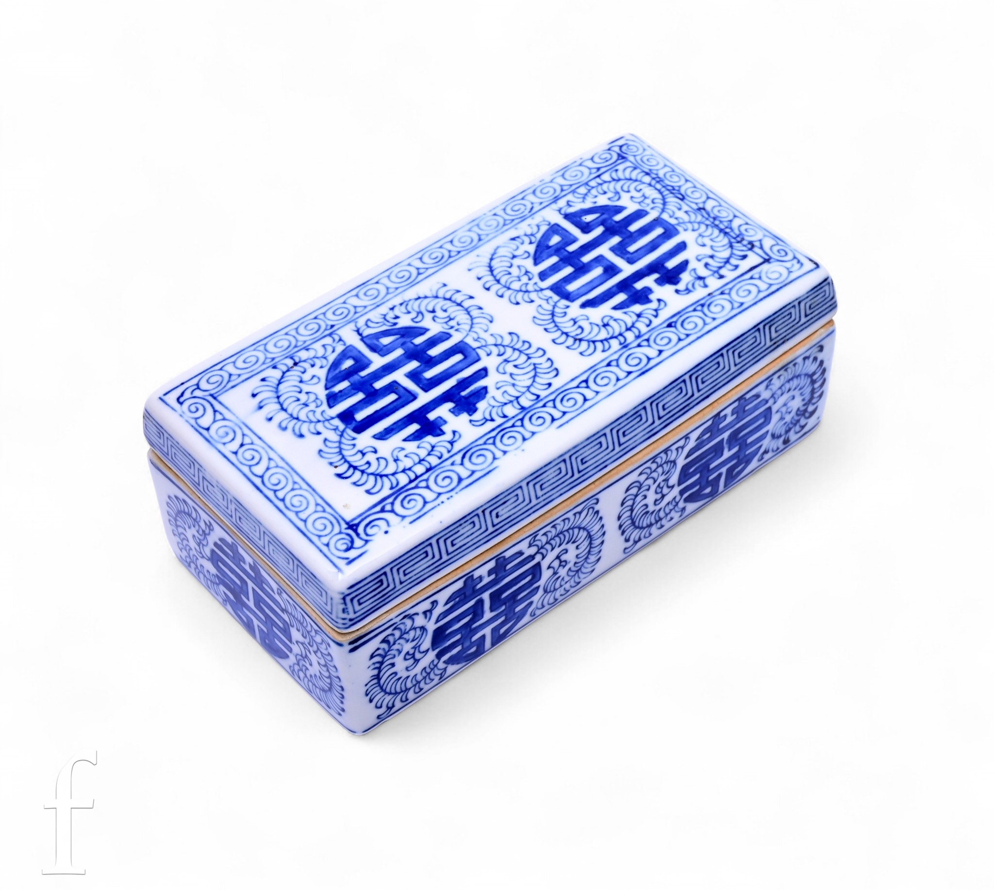 A Chinese blue and white lidded rectangular box, the cover revealing empty compartment, detailed with auspicious characters before leafy tendrils, 7cm x 19cm x 10cm, Qianlong seal mark to the interior.