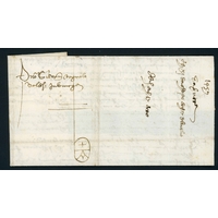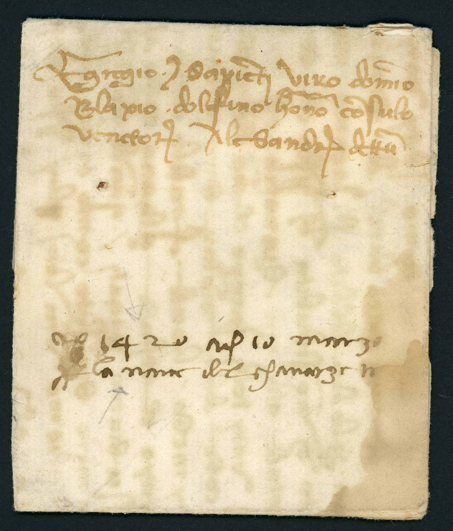 VERY EARLY LETTER FROM VENICE TO "ALEXANDRETTA" (S.E. TURKEY); 1419/1420 EL (small hole and some staining affects mostly the contents) headed inside "Anno mccccxviiii [= 1419]. In Venecia" and with "xxii dizembre" at the foot after the signature; addressed to "Alexandrasetta" (now Iskenderun, Turkey on the east coast of the Med.) and conveniently endorsed with date of receipt on the front; "1420 a di 10 Marzo, per la nave de Marzo...[?]". Rare early 15th century letter sent by ship. [Ex John Lea.] Cross Reference: EARLY LETTERS, ITALIAN STATES, TURKEY