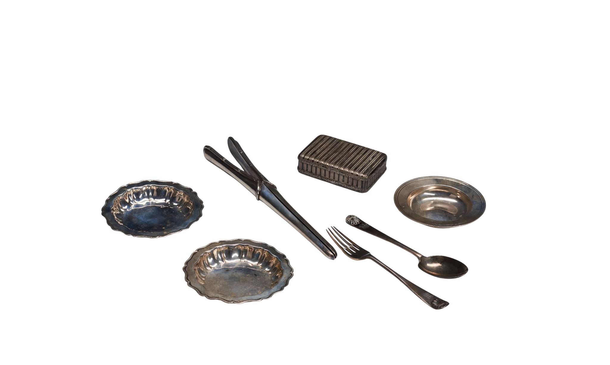 A SILVER ARMADA DISH AND A PAIR OF SCROLL EDGE SILVER PIN DISHES