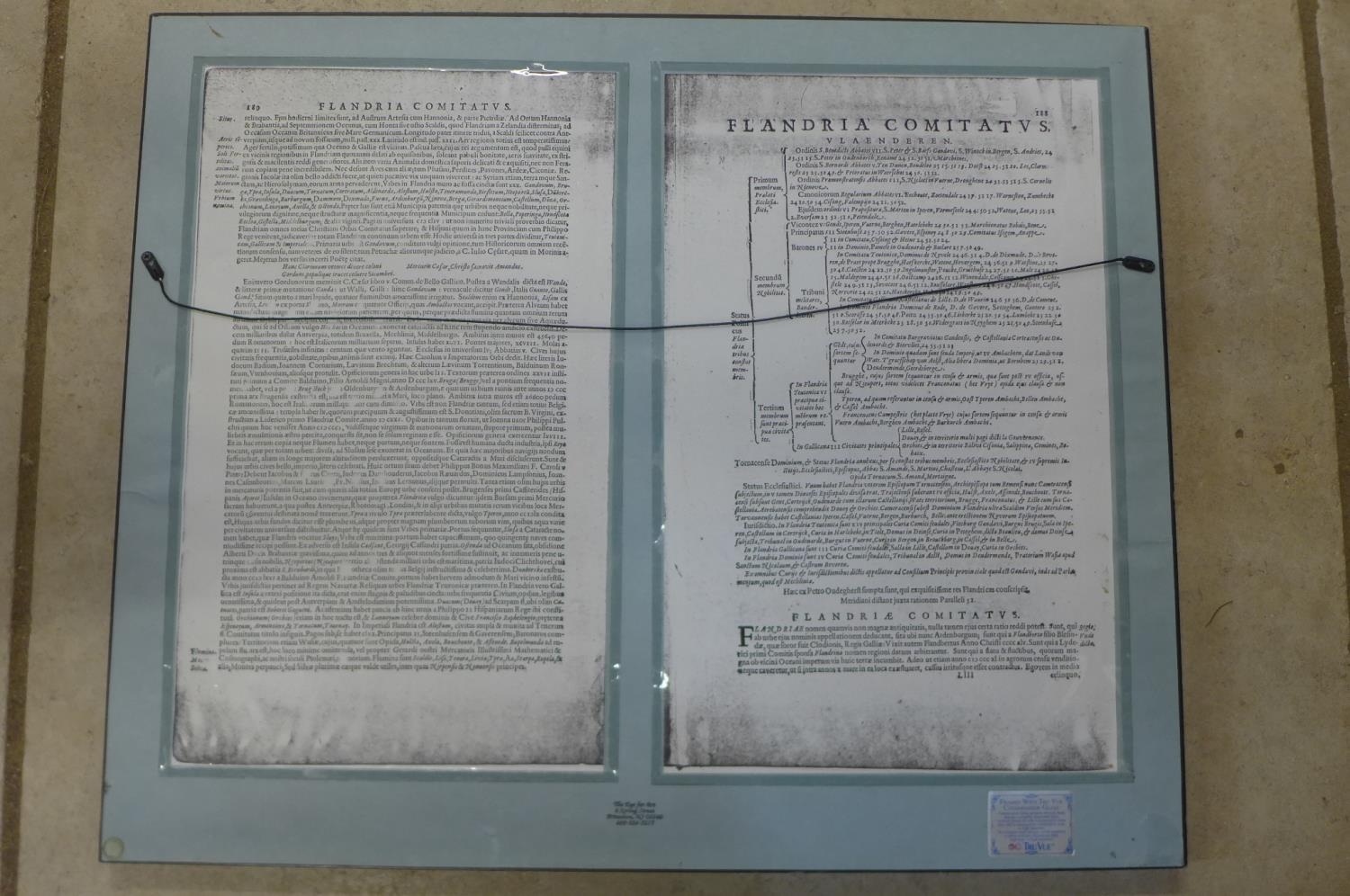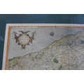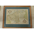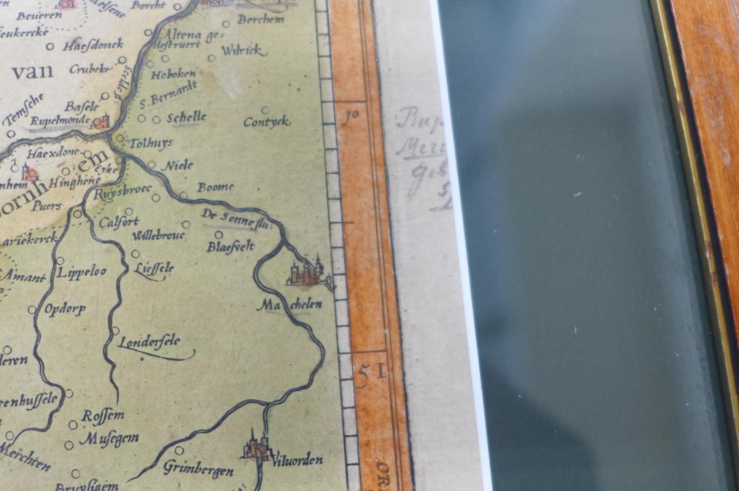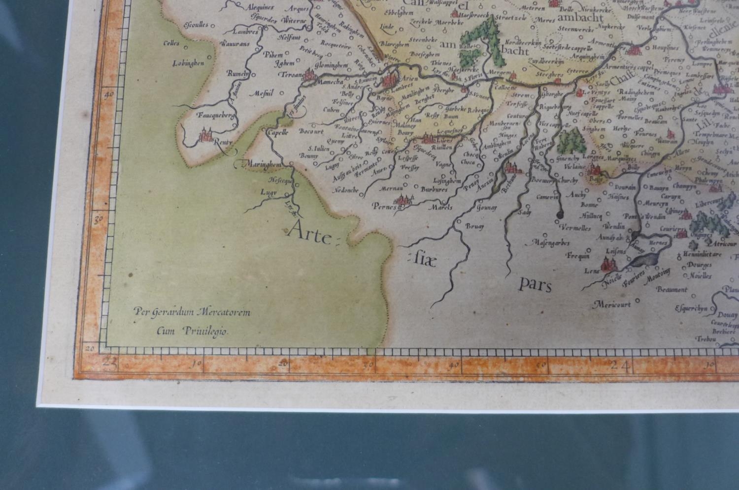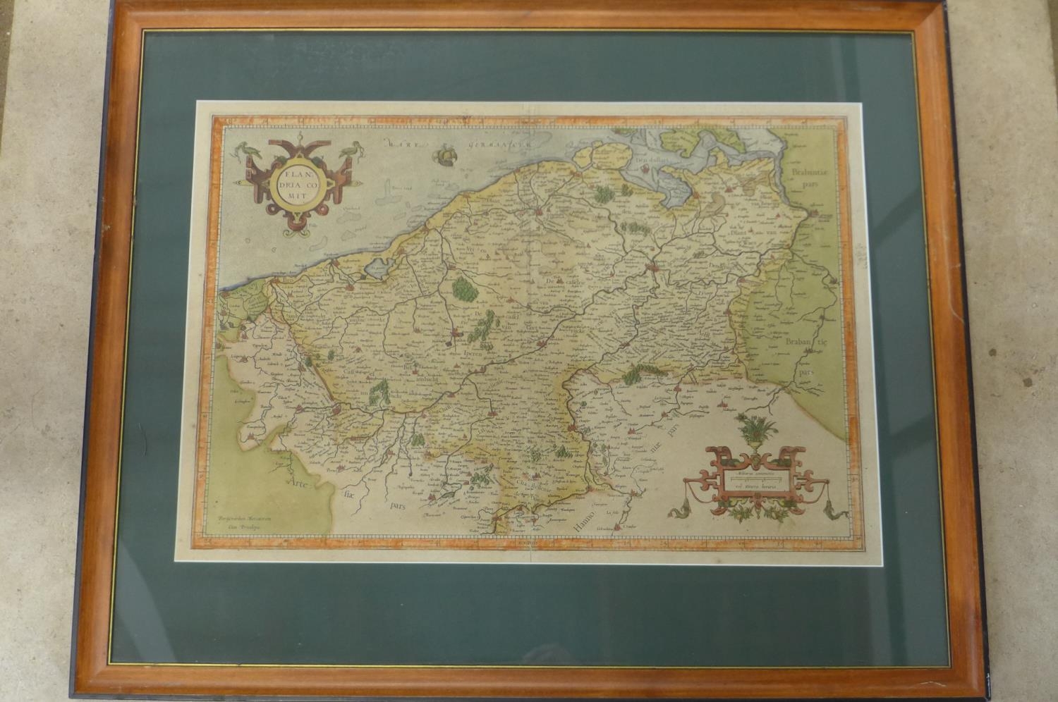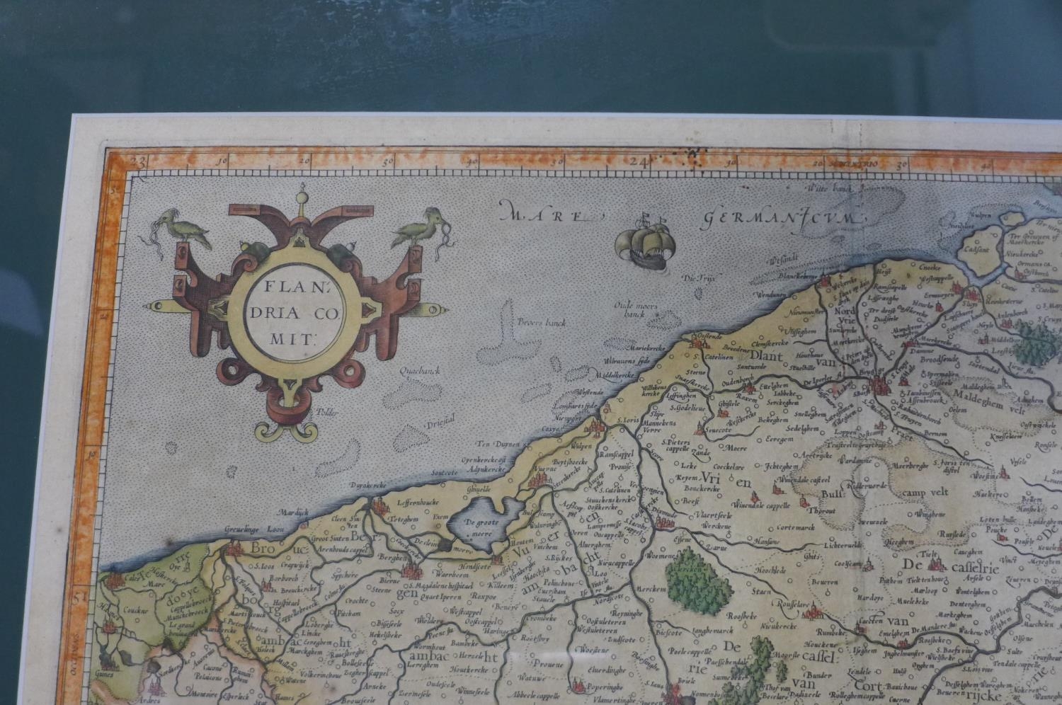 A 17th century engraved map of Flanders by G Mercator, old colouring, mounted and framed, 52x63cm overall