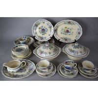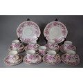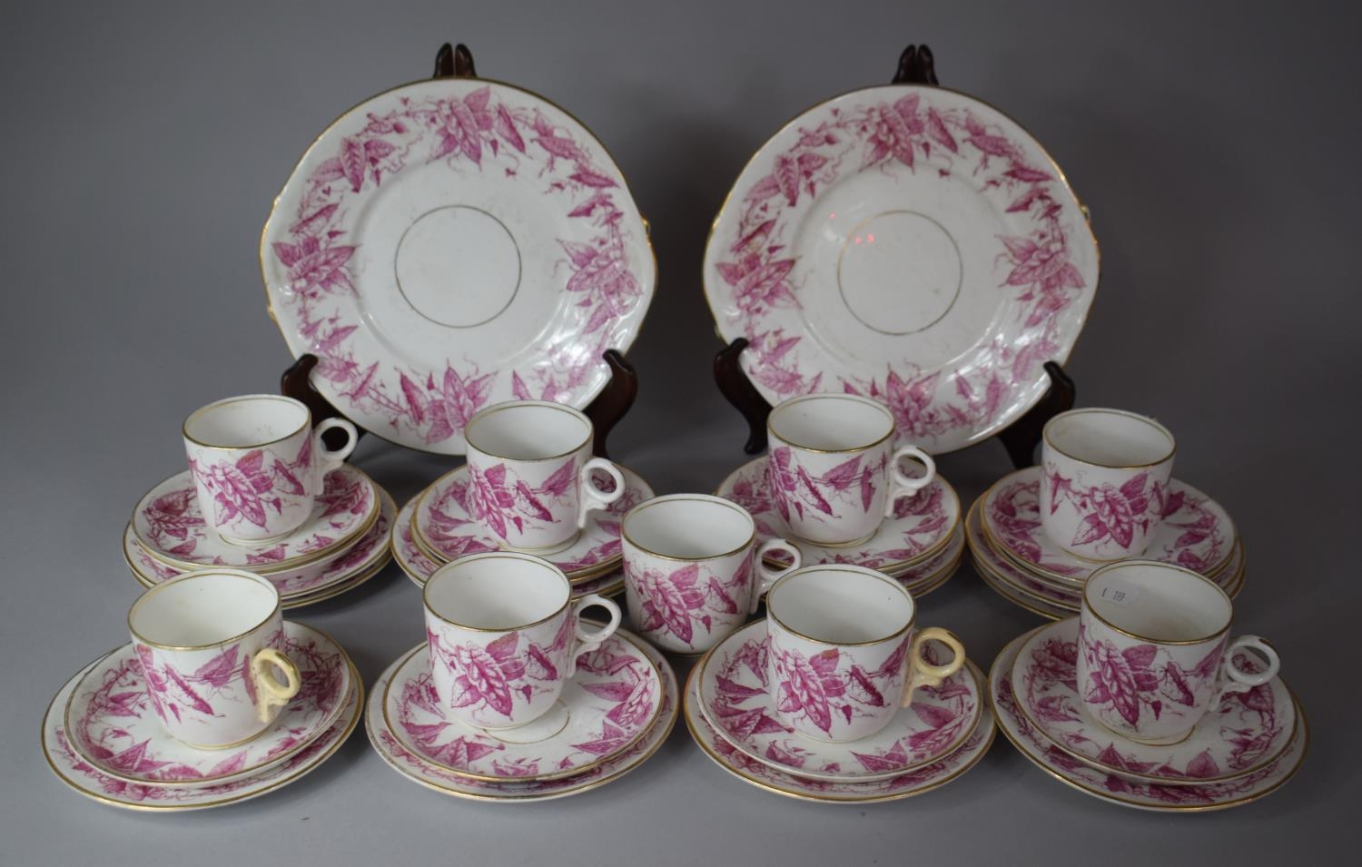 A 19th Century Gilt and Pink Leaf Transfer Pattern Teaset to Comprise Two Cake Plates, Twelve Side Plates, Twelve Saucers, Nine Cups