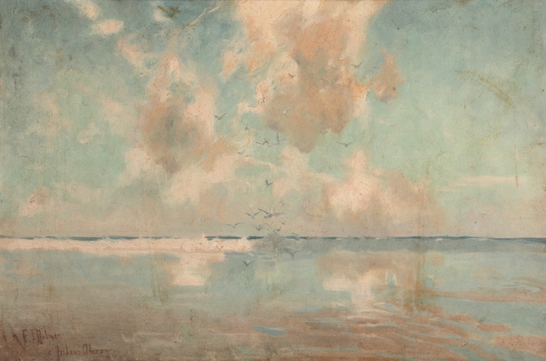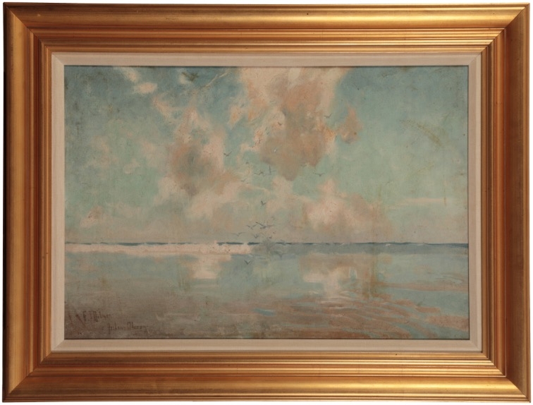 inscribed "To F. Milne, Julius Olsson" lower left, oil on canvas, 51cm x 76.5cm