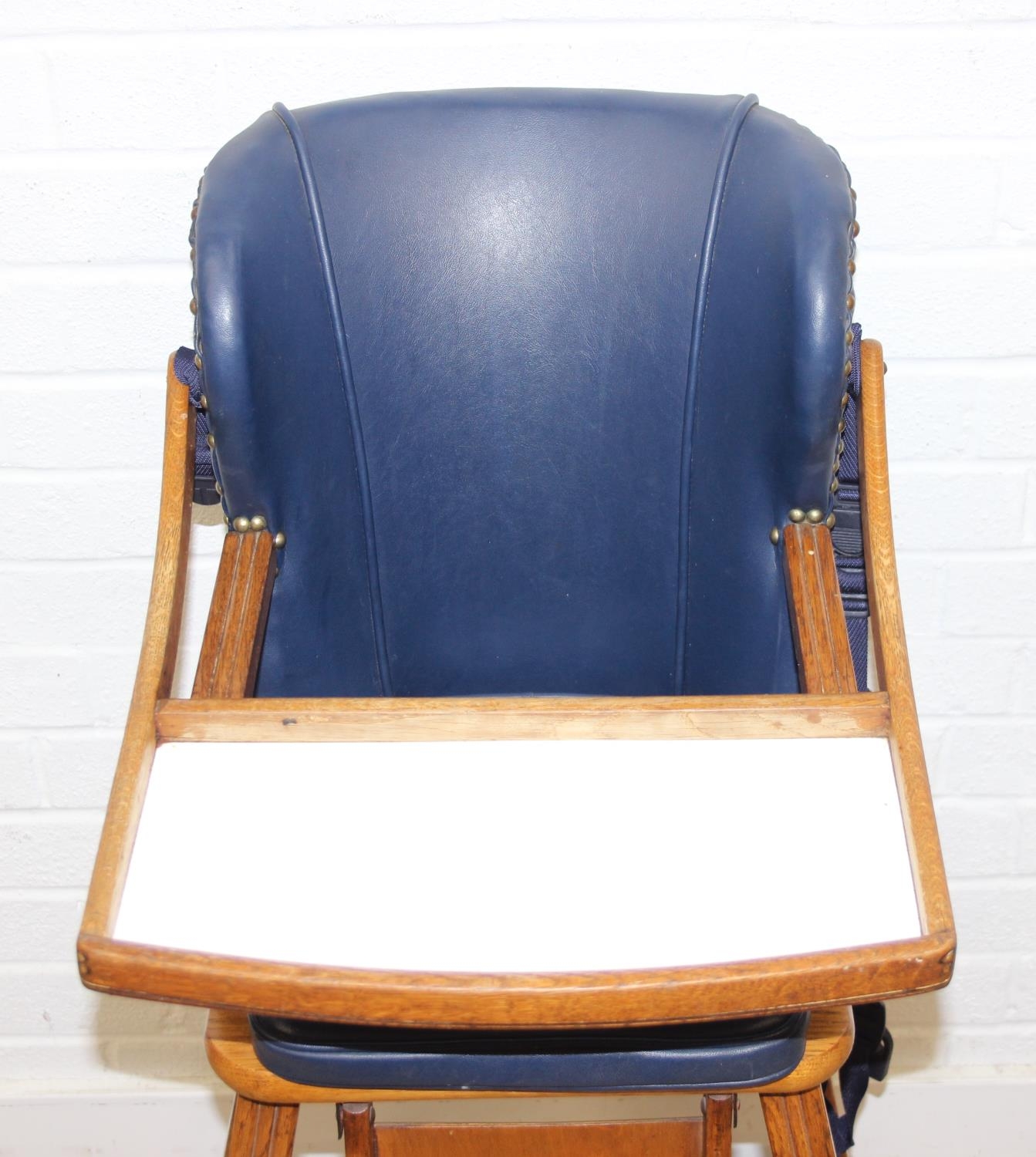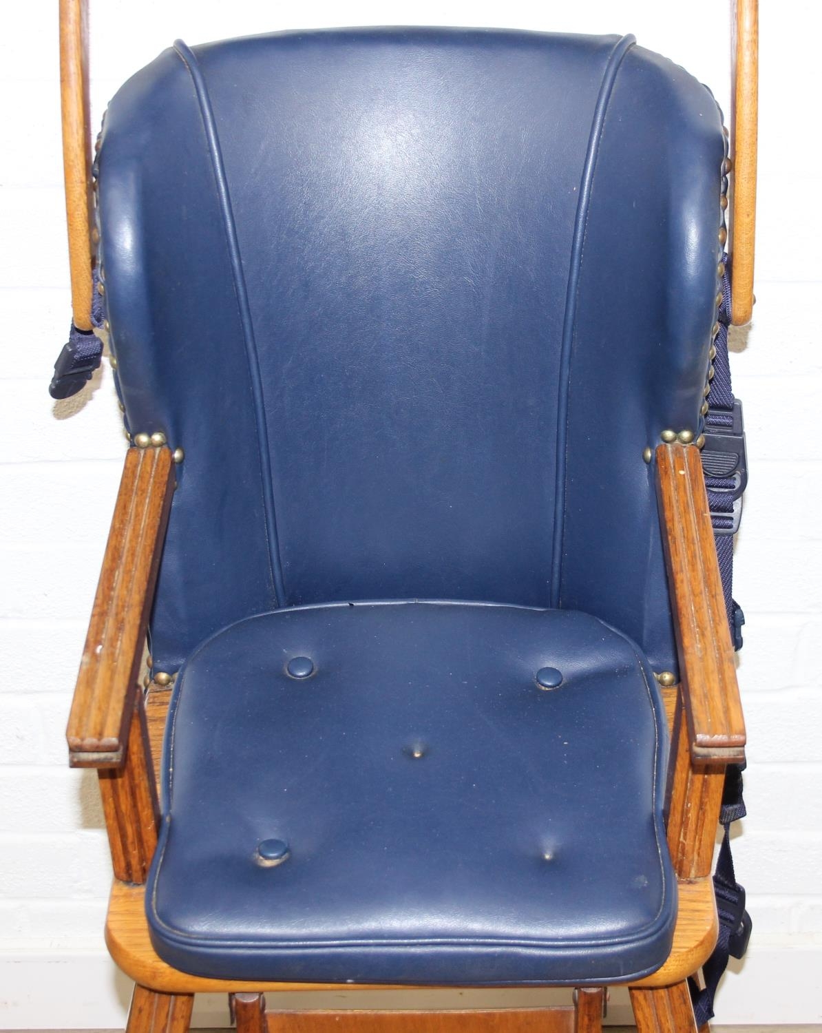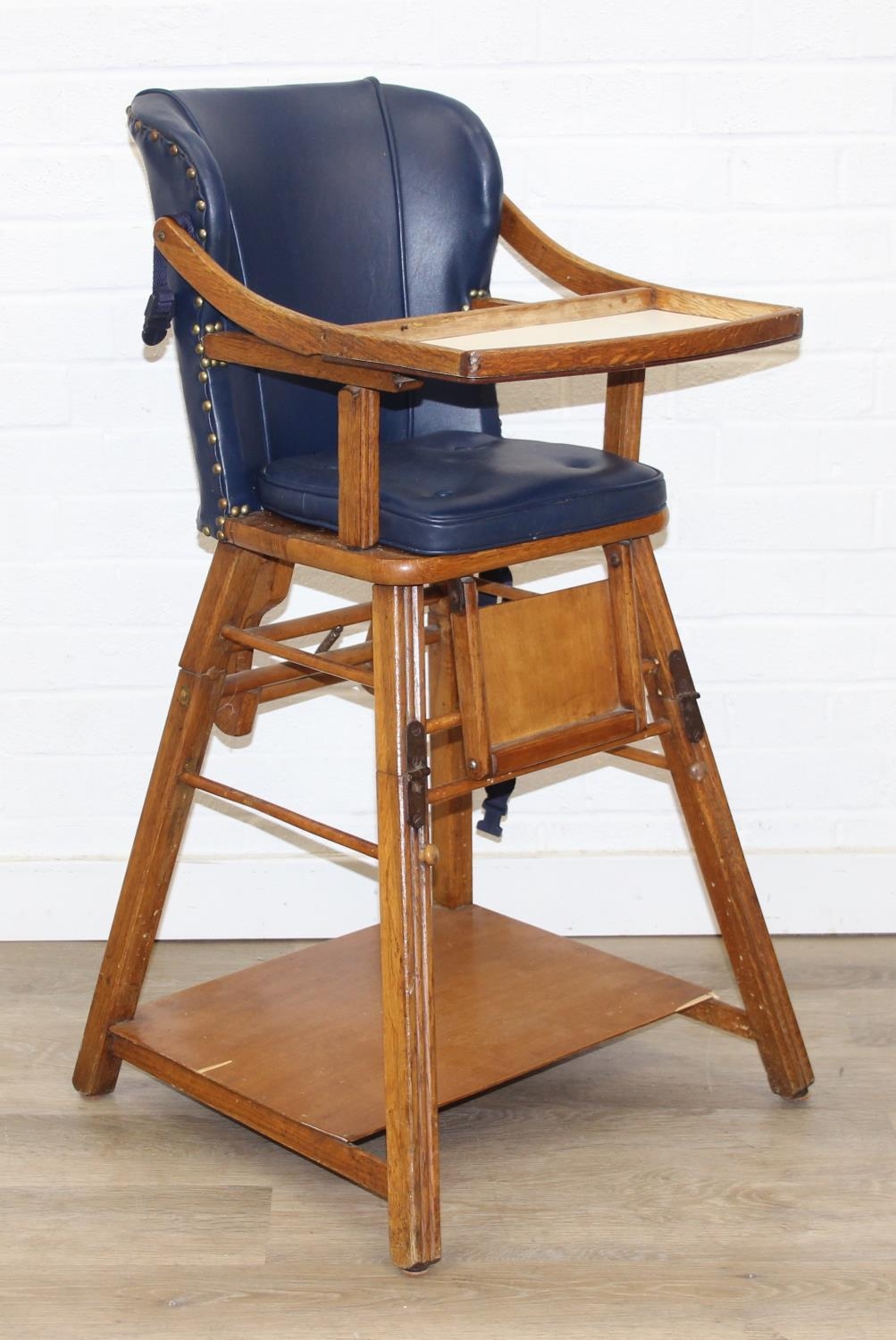 A vintage child's highchair with blue upholstery, 54cm x 52cm x 96cm
