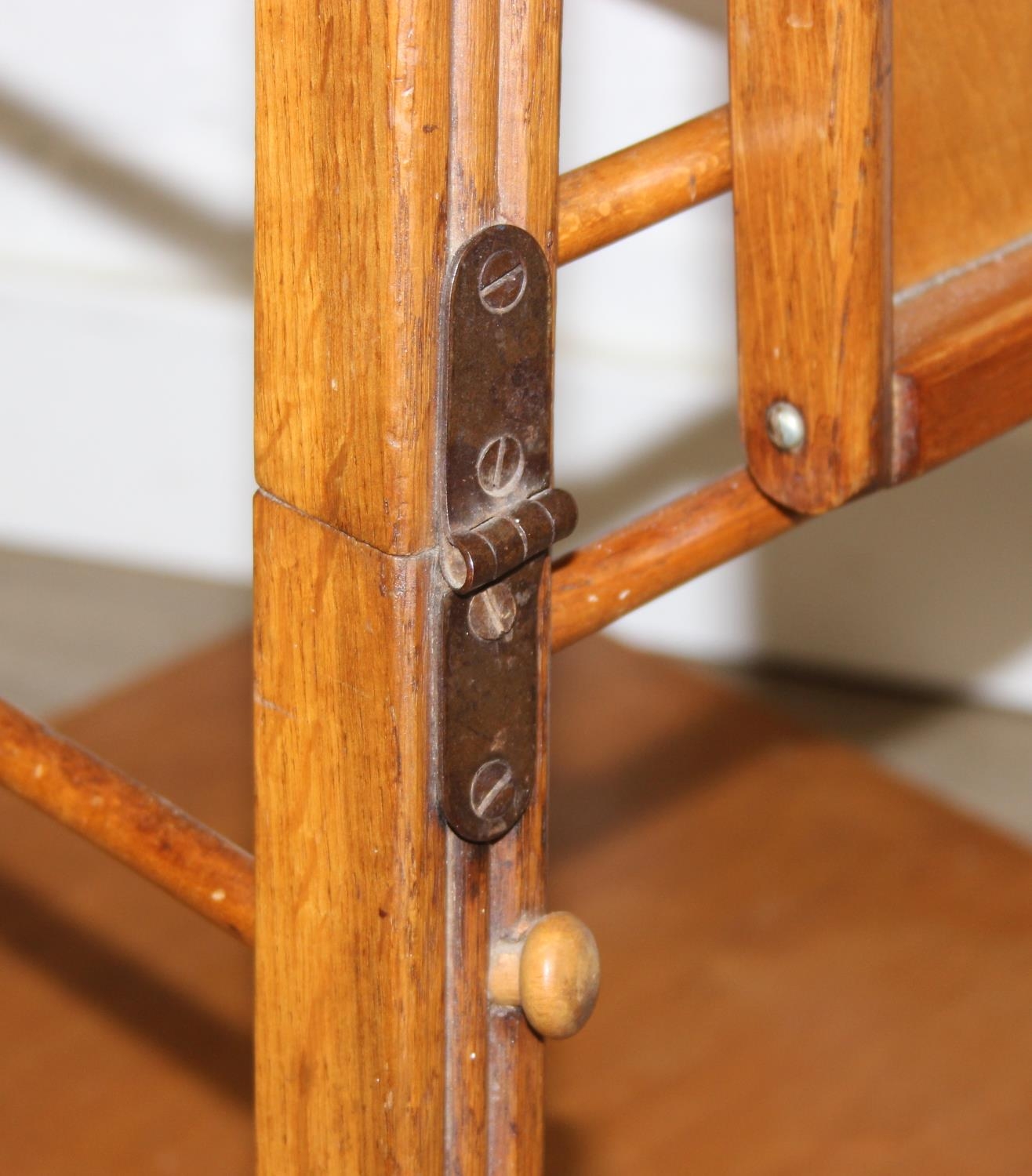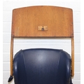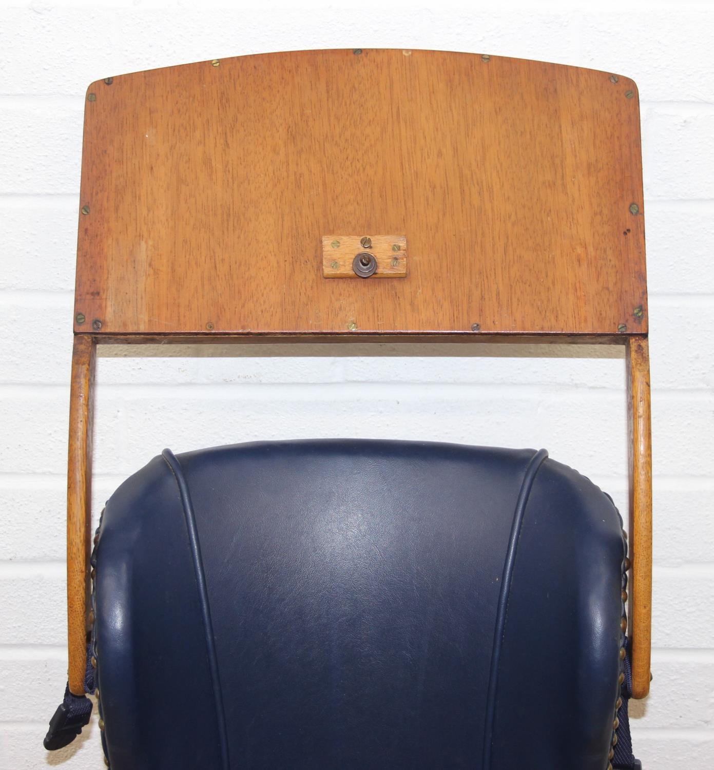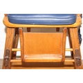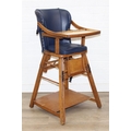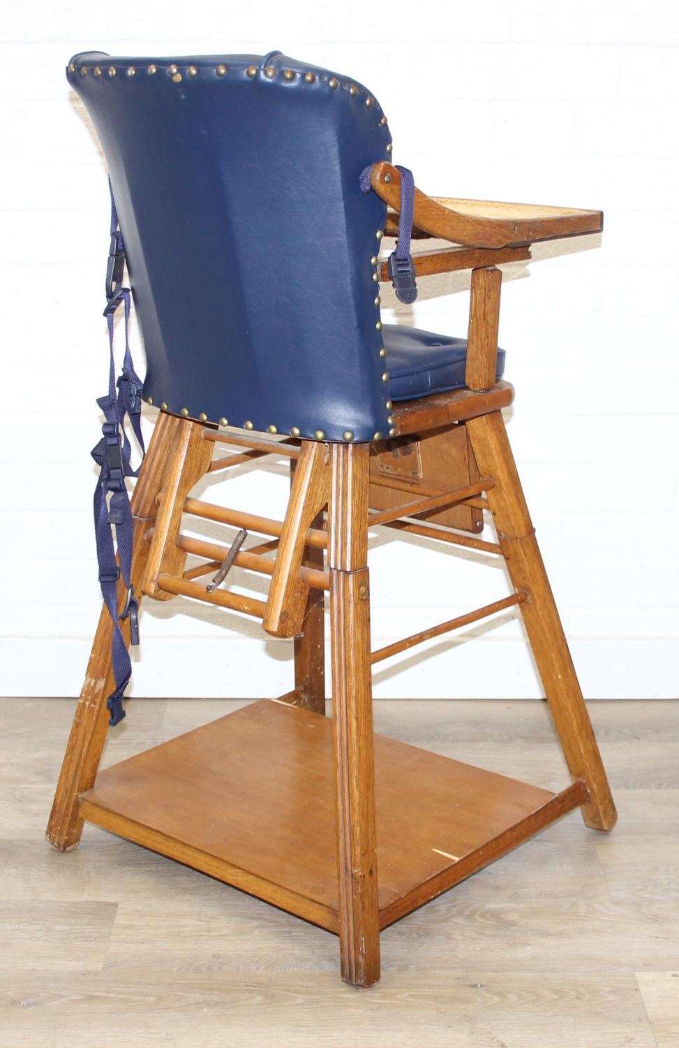A vintage child's highchair with blue upholstery, 54cm x 52cm x 96cm