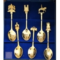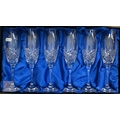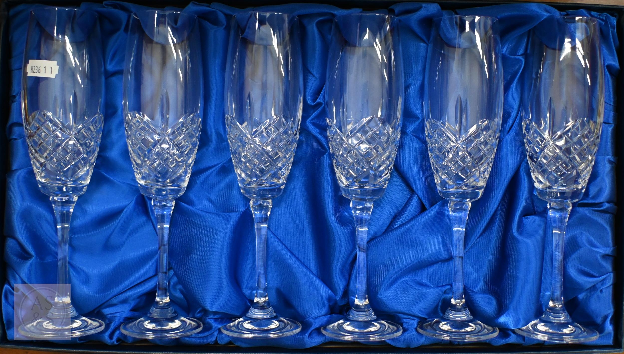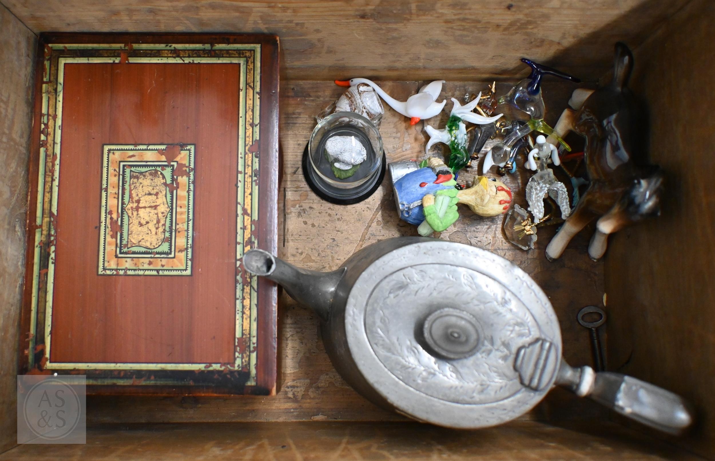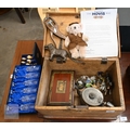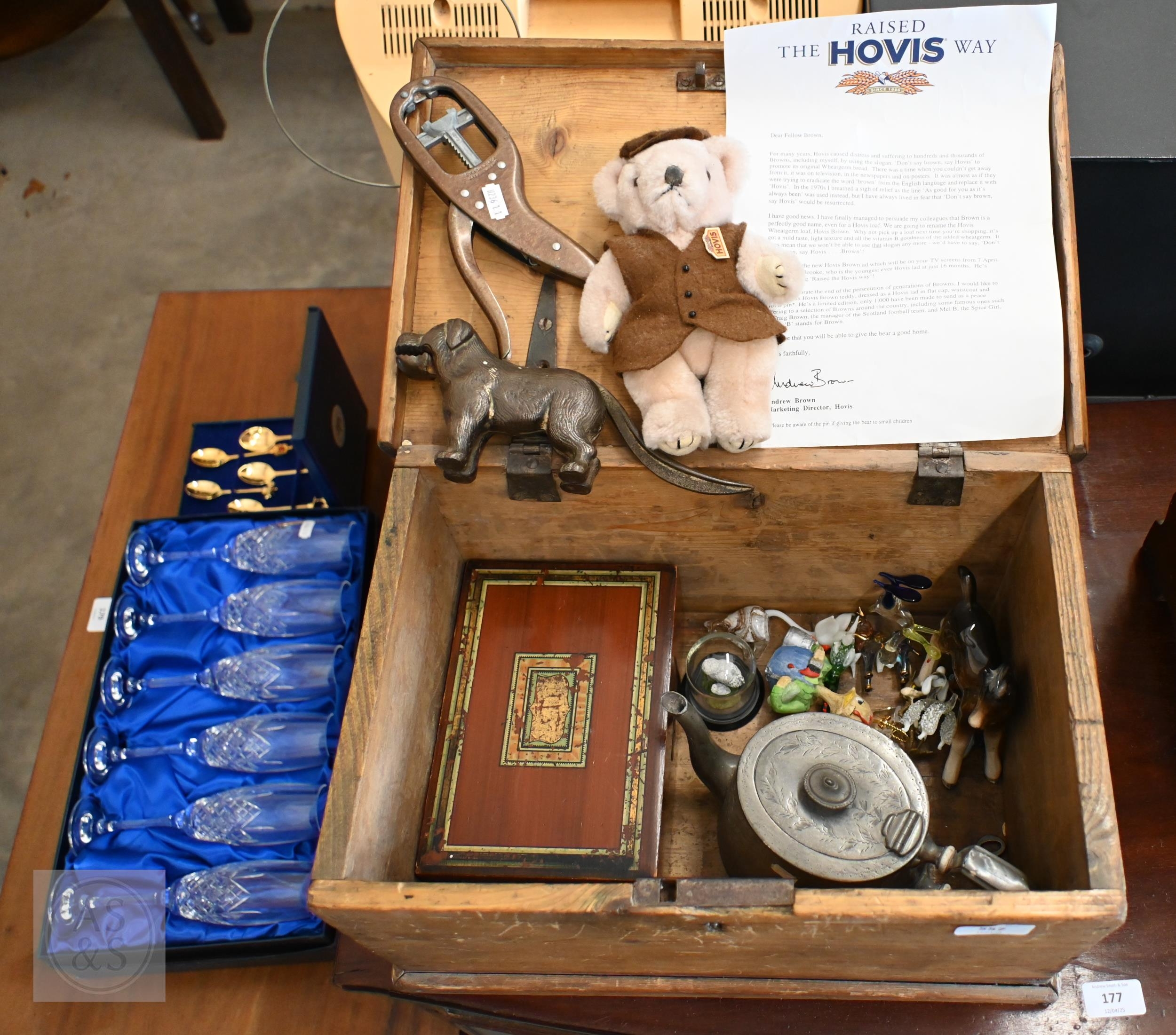 A vintage wooden ditty box and contents including cast metal 'dog' nutcrackers, glass miniature animals etc, to/w a boxed set of six cut glass champagne flutes