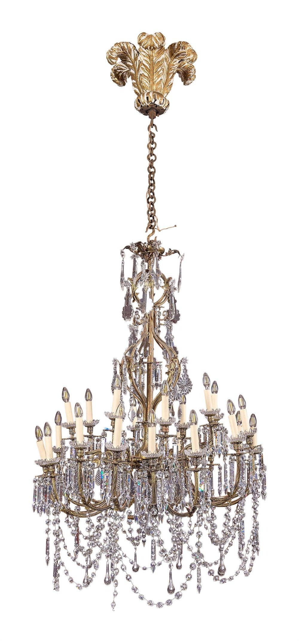 A VICTORIAN GILT-BRONZE AND CUT-GLASS CHANDELIERCIRCA 1860With a central multi-stem issuing twenty-four twisted and hob-nail branches with foliate clasps and nozzles, hung with glass lustres and festoons of facetted and spiral drops, fitted for electricity approximately 170cm high excluding chain, 96cm diameter PLEASE NOTE: ALL LOTS ARE LOCATED AT SACKVILLE WEST STORAGE IN ANDOVER (SP10 3SA) AND ARE NOT AVAILABLE TO VIEW.