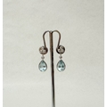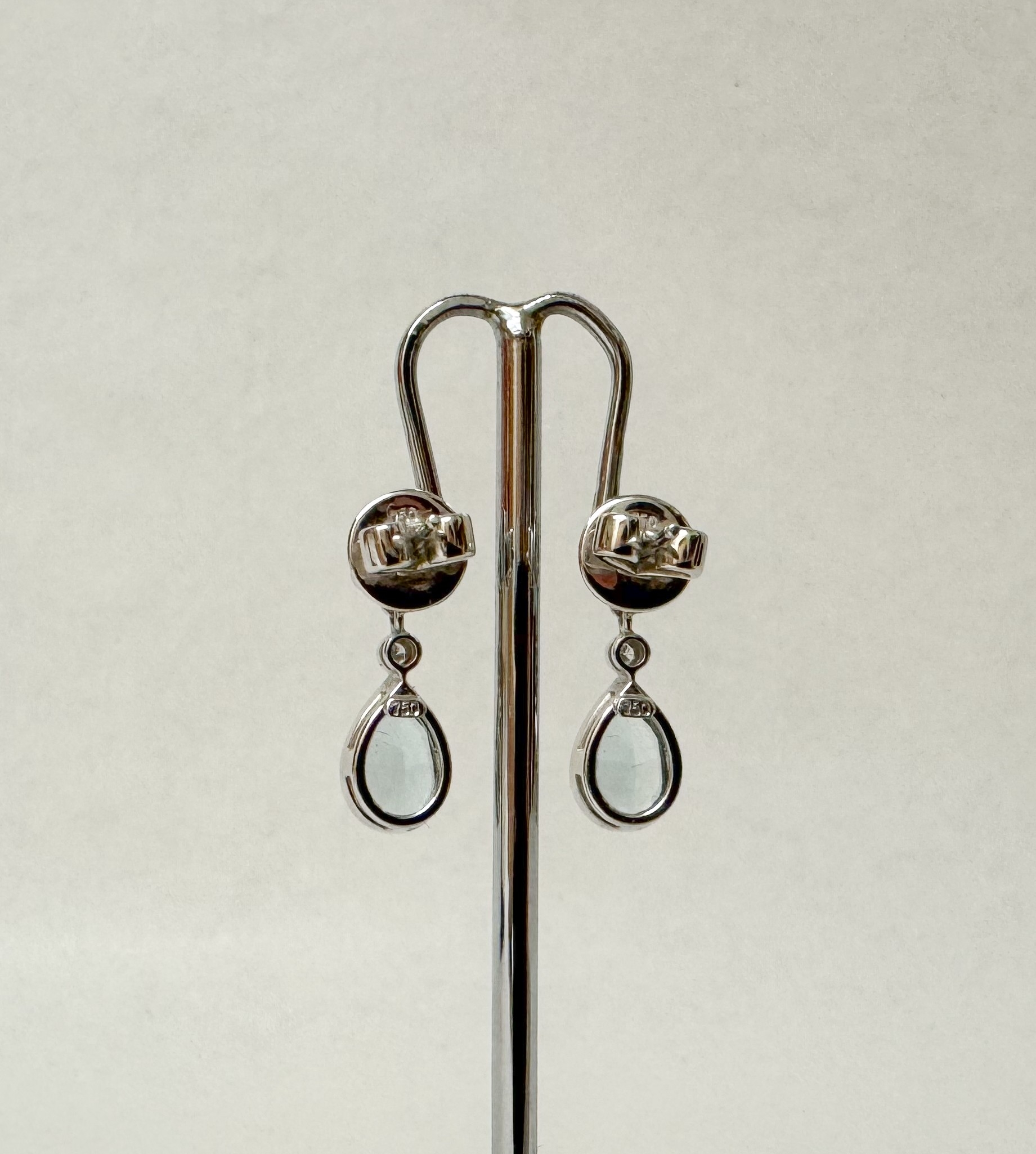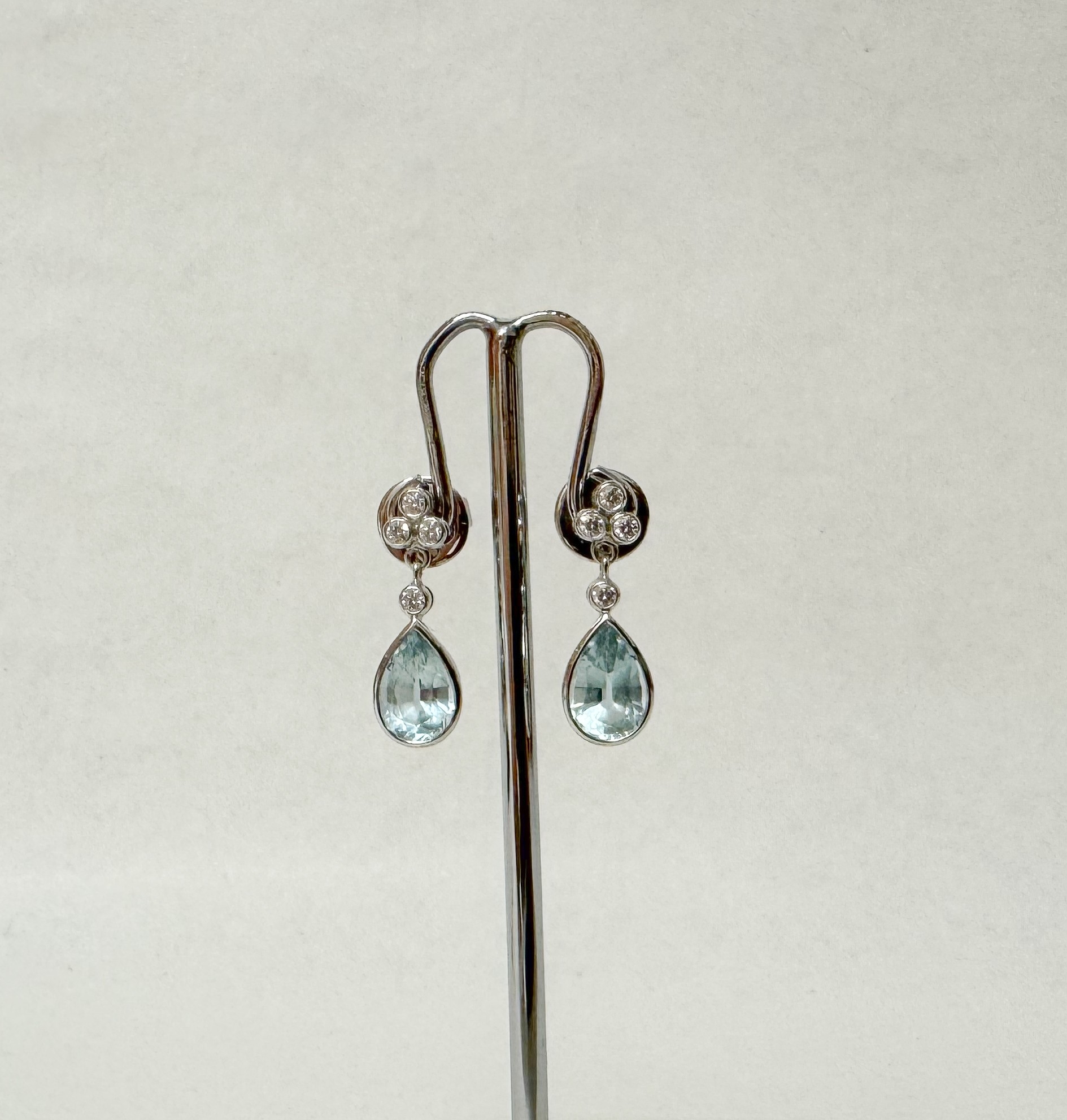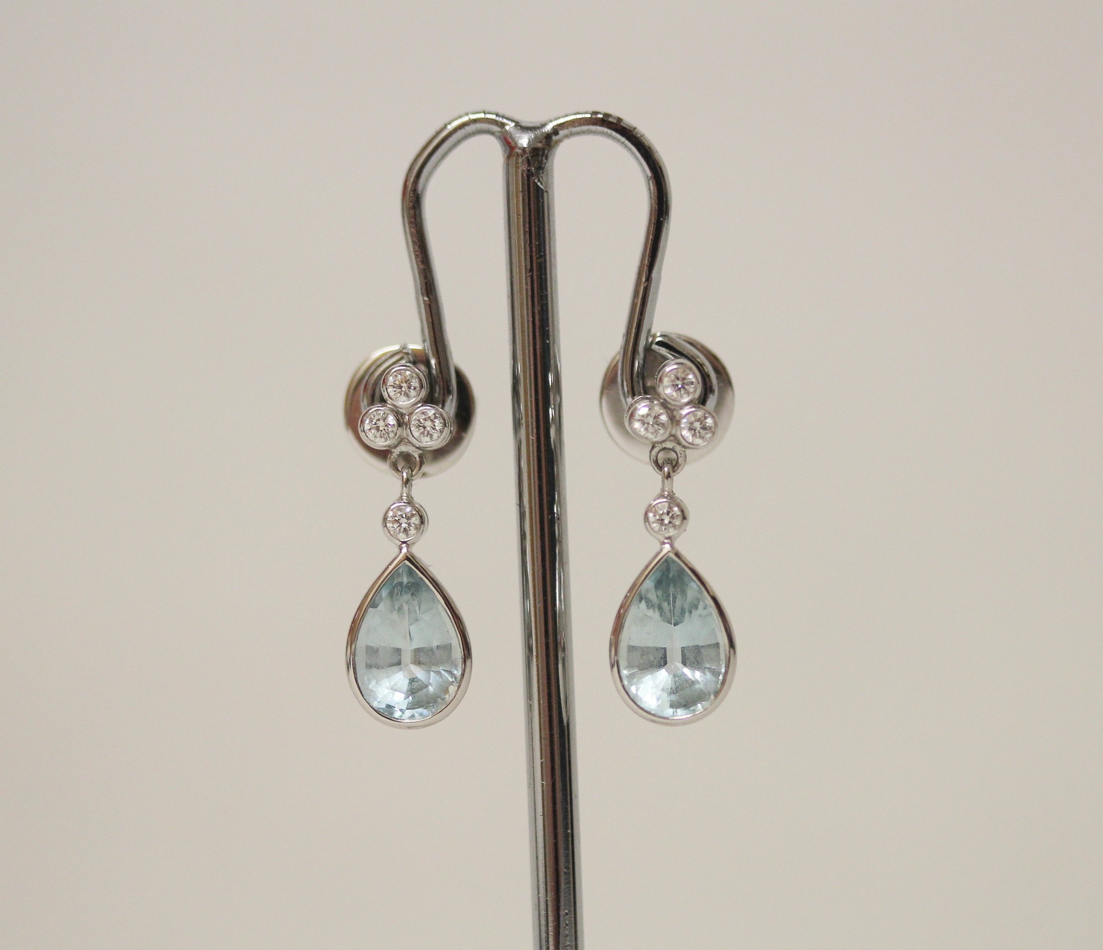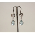 A pair of quality aquamarine and diamond modern drop earrings. The tear drop aquamarines suspended from four brilliant cut diamonds, on hallmarked 18ct white gold posts and settings. 5 grams.