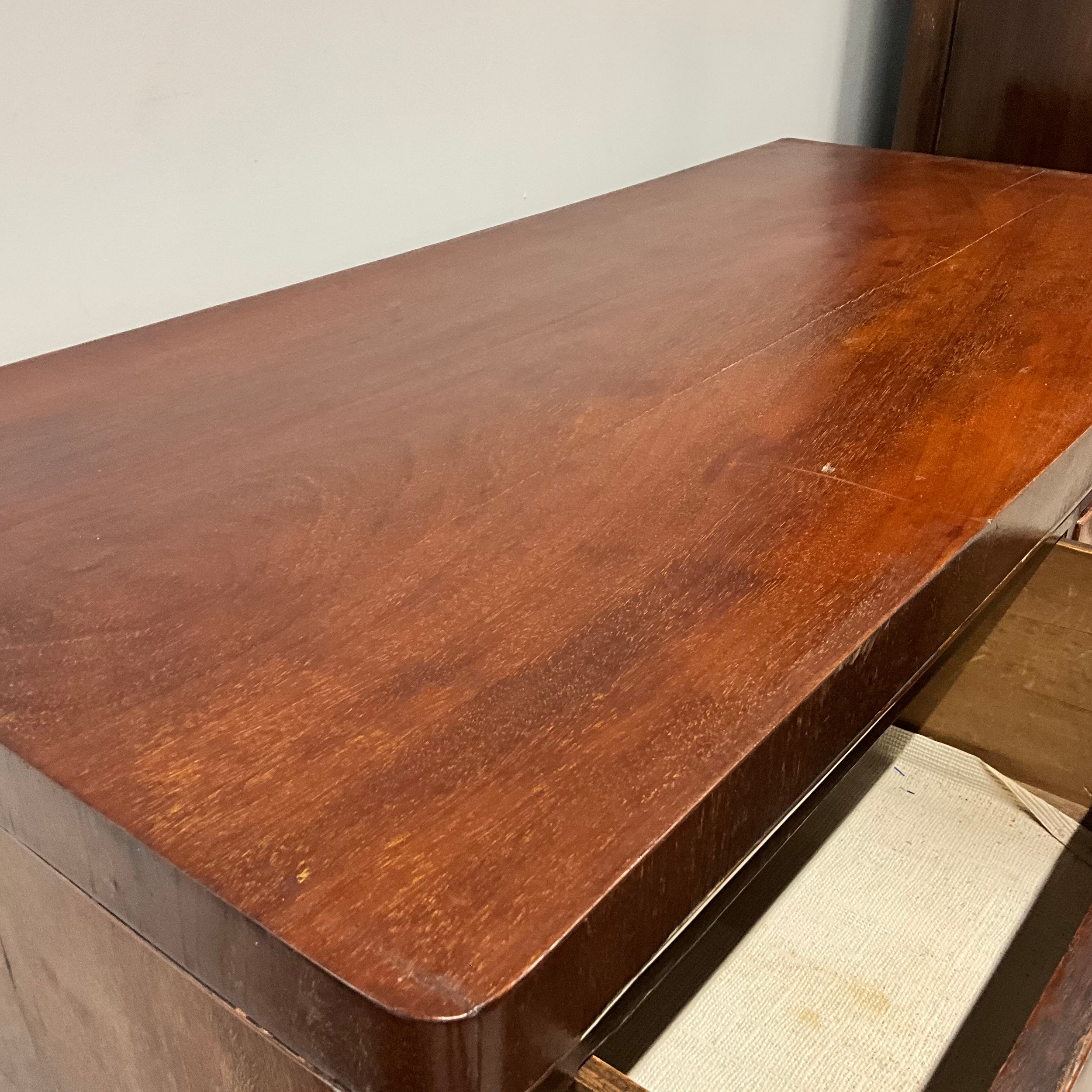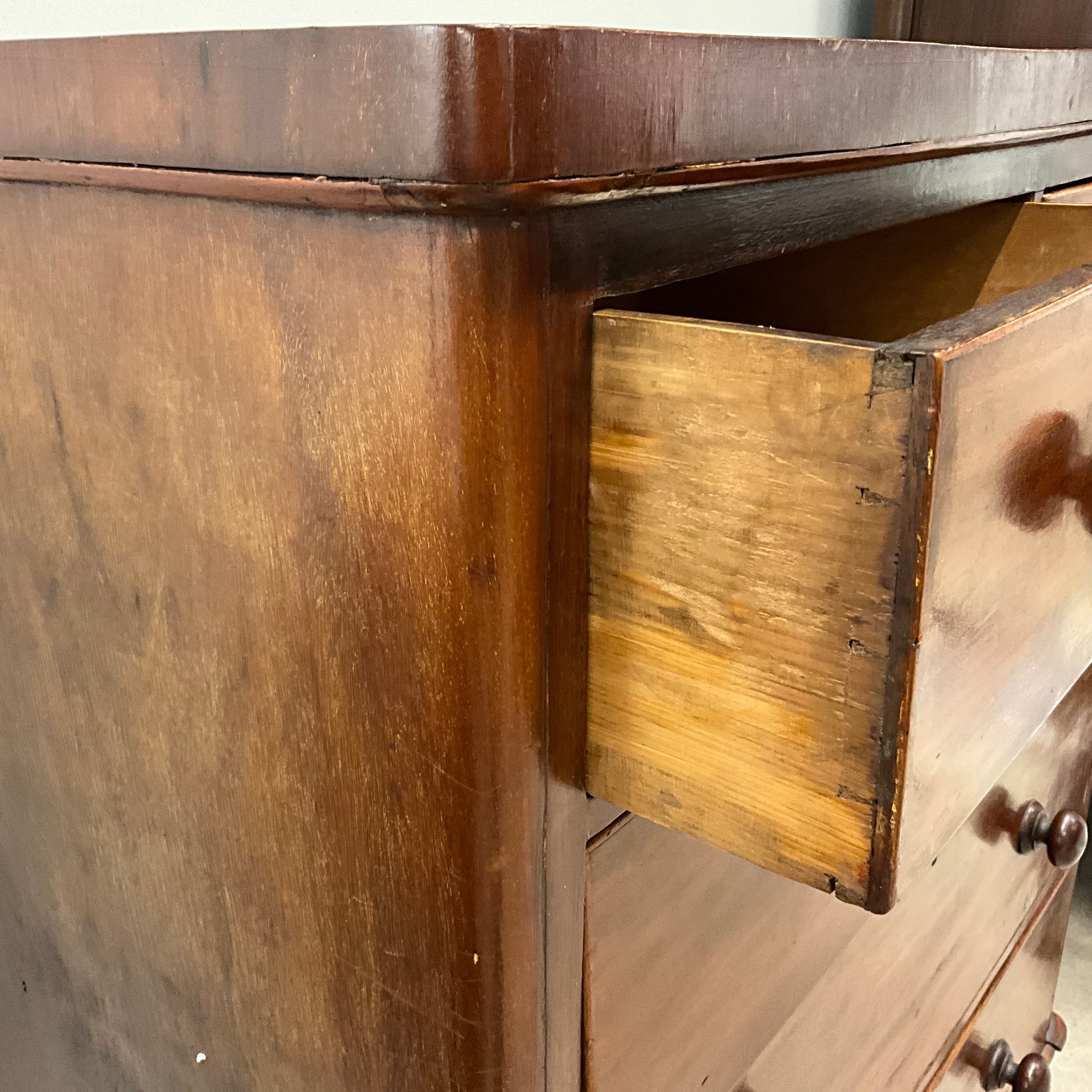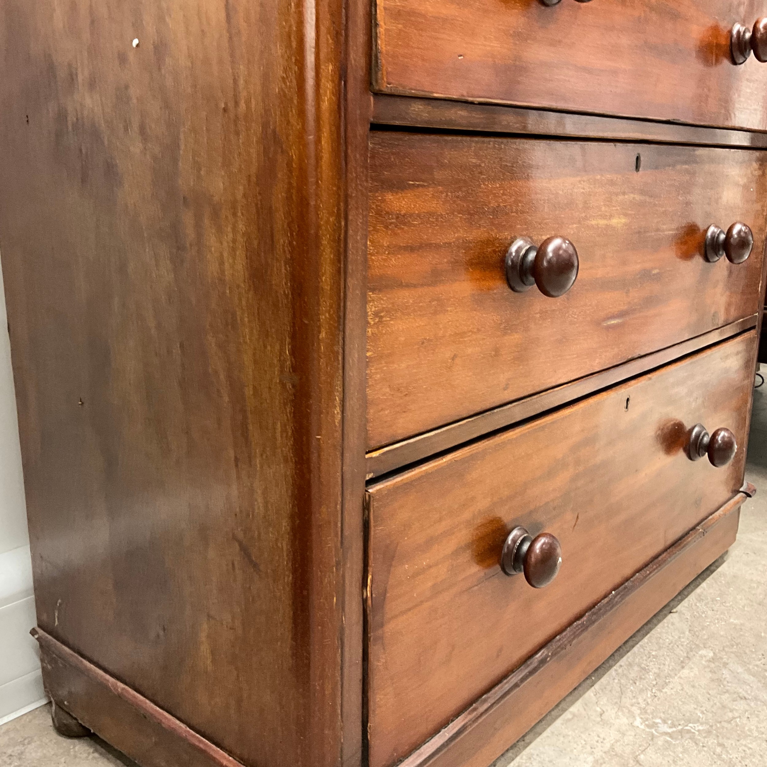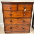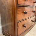 Victorian mahogany and pine chest of two short over three long graduating drawers. H111cm x W907cm x D44.5cm.