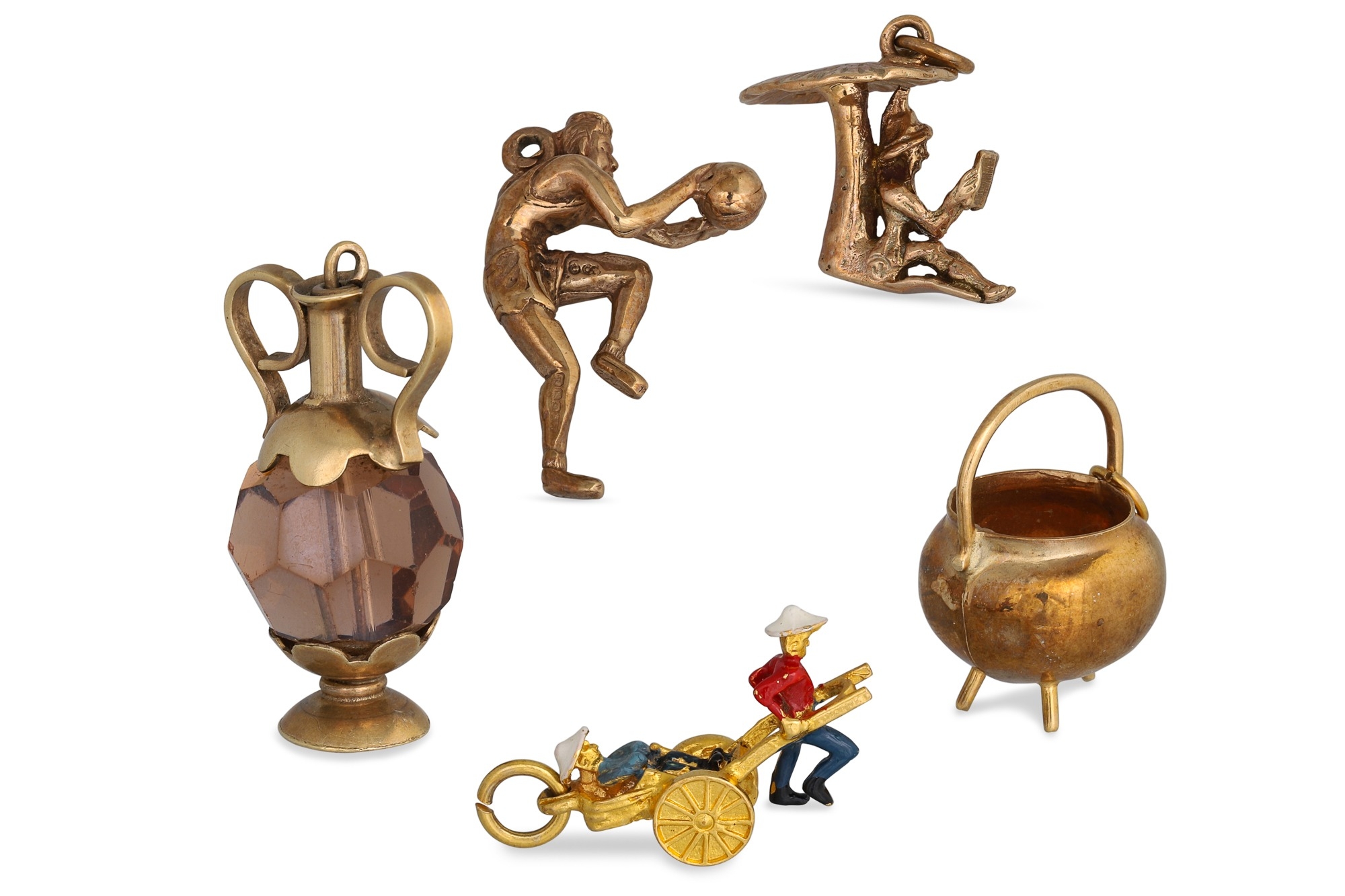 FIVE 9CT GOLD VINTAGE CHARMS, of various forms, 17.8 g