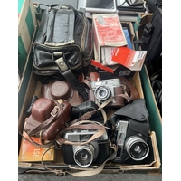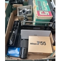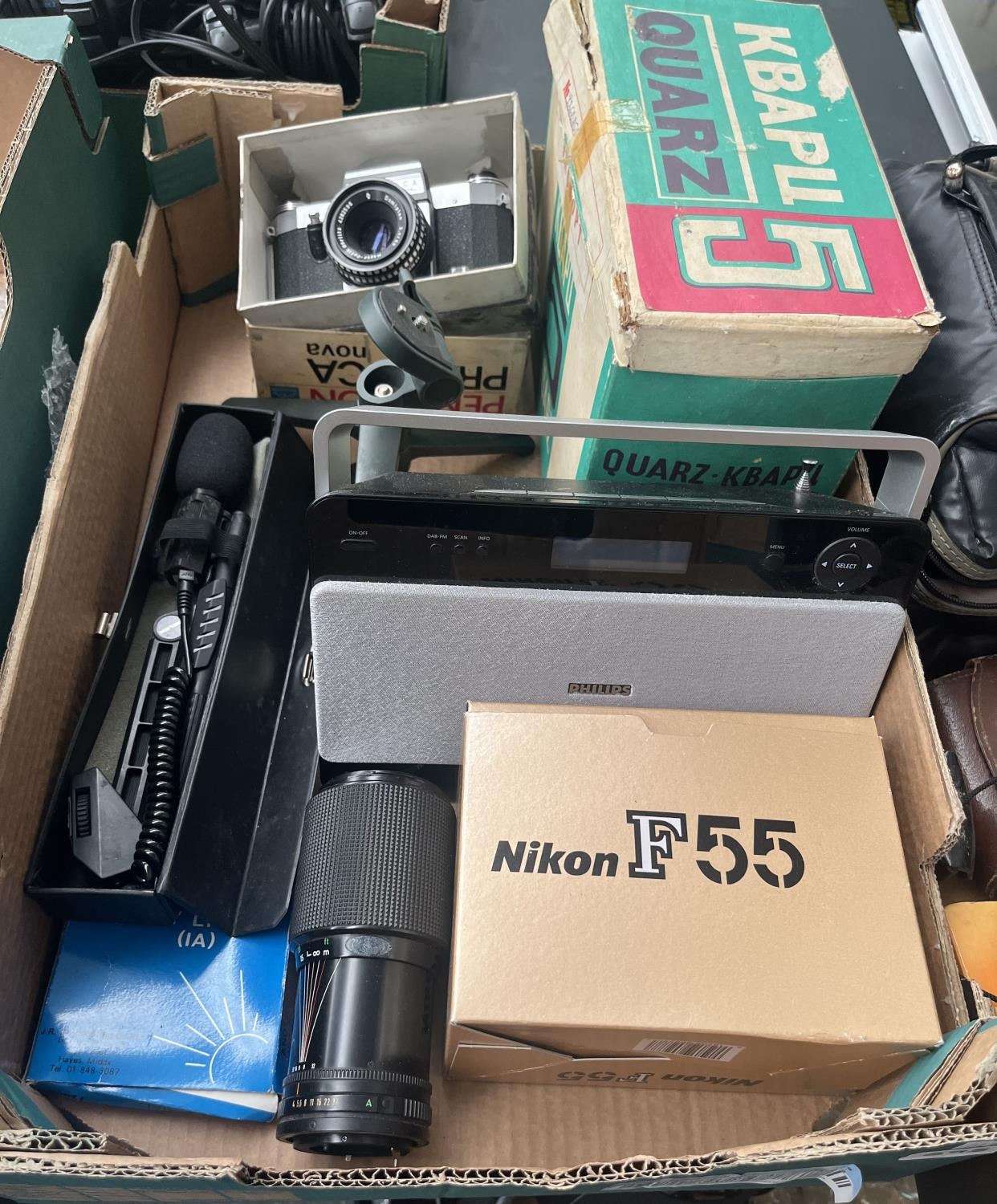 Box containing Nikon F55 camera, Canon lens, Philips DAB radio etc