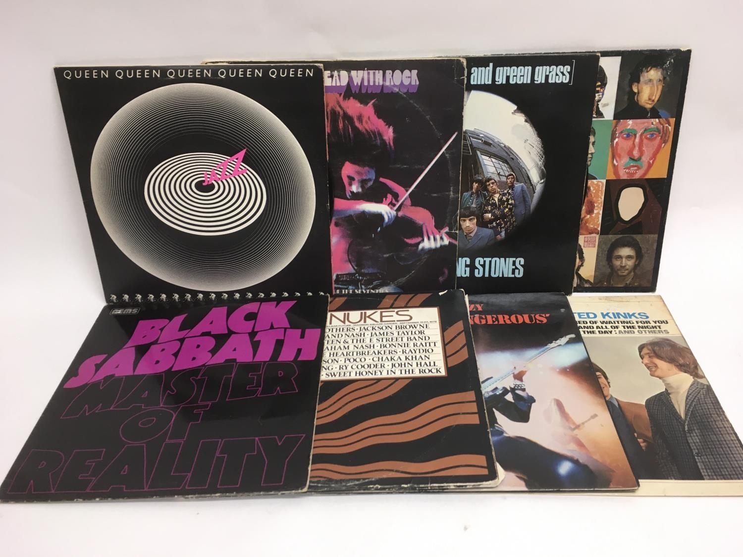 Eight rock LPs by various artists including Queen, The Who, Black Sabbath and others.